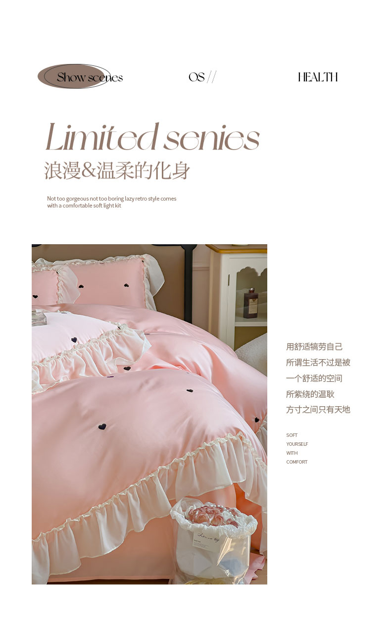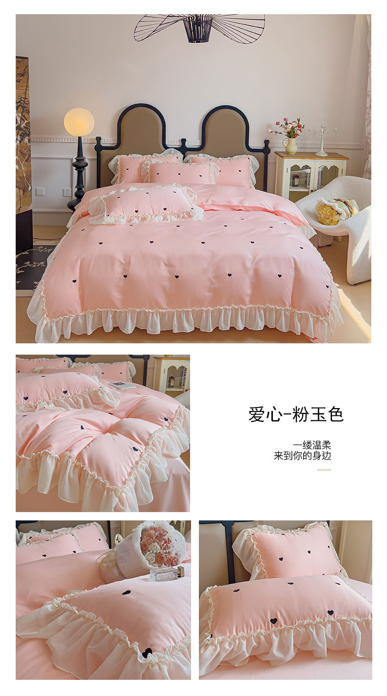 商品名称:花香四季家纺 2025新款法式蕾丝裙边刺绣仙女公主风四件套 爱心粉