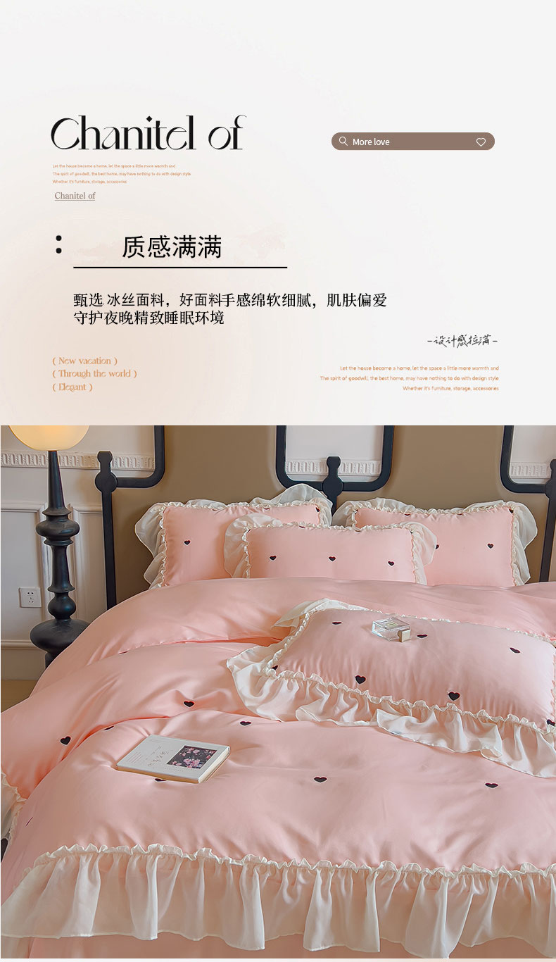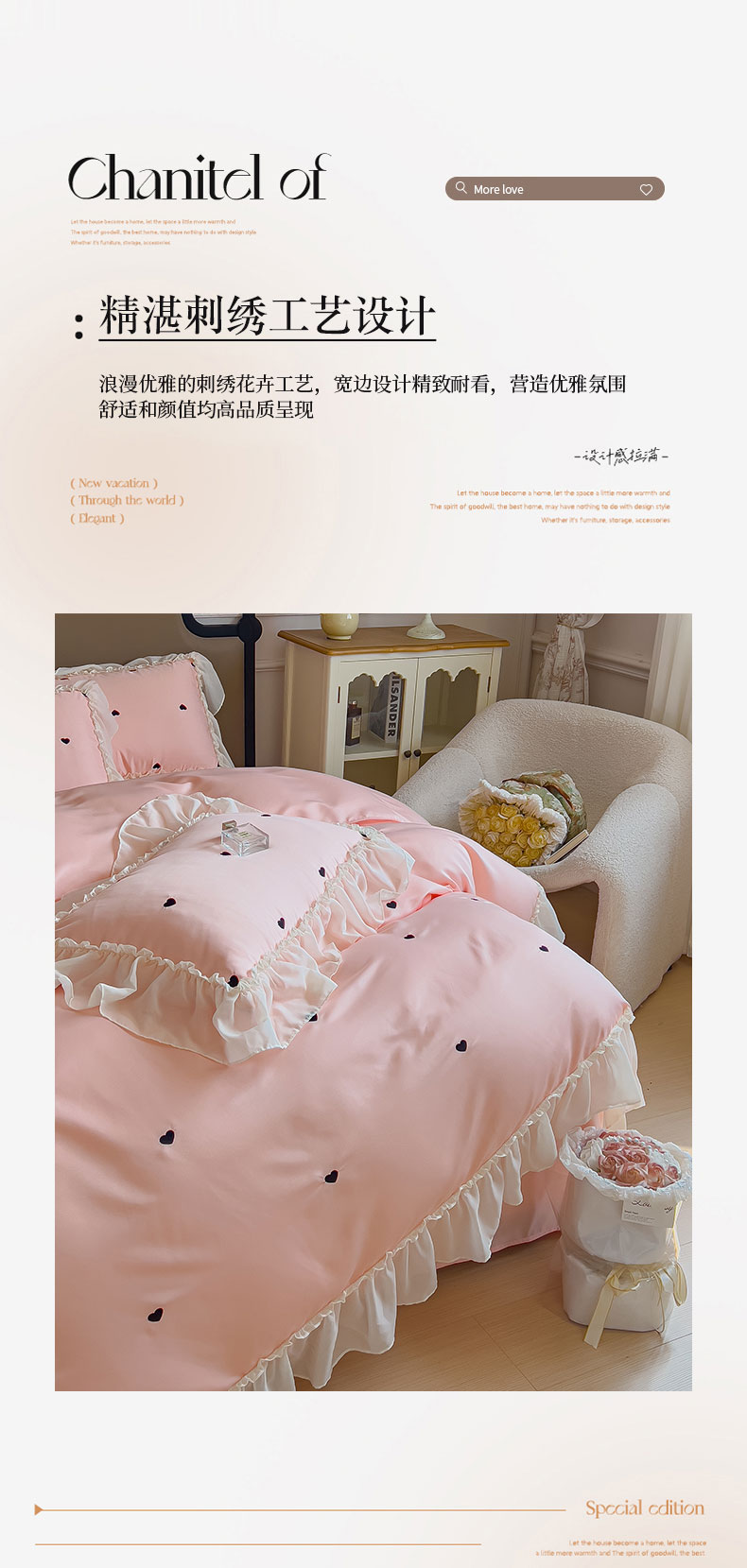 花香四季家纺 2025新款法式蕾丝裙边刺绣仙女公主风四件套 爱心粉