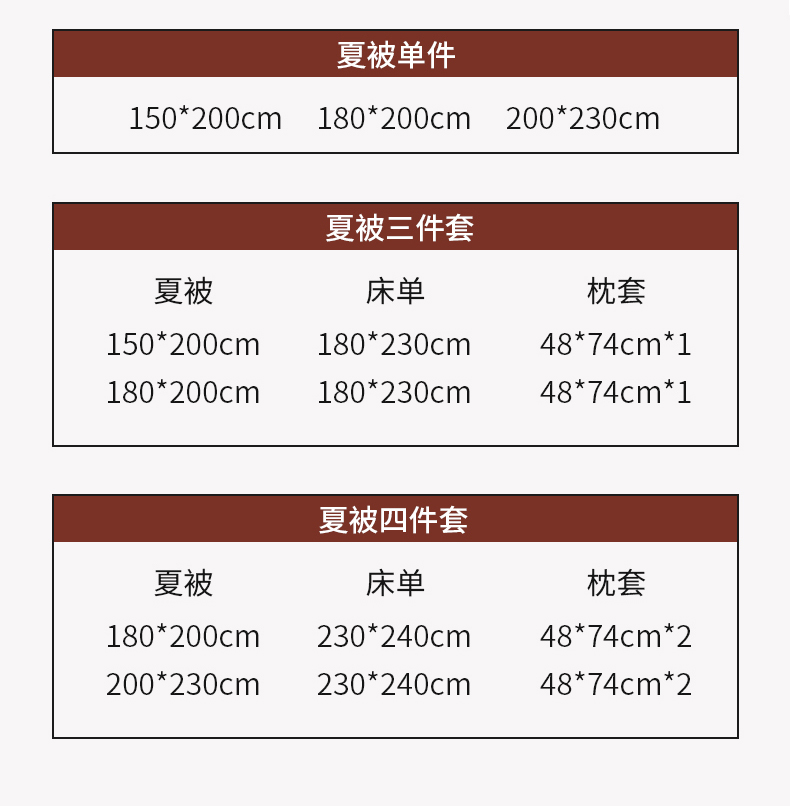 [{"sp_id":1,"sp_name":"\u989c\u8272\u5206\u7c7b","sp_format":2,"sp_list":[{"sp_value_id":648,"sp_value_name":"\u84dd\u767d\u6761","sp_value_image":{"id":999,"path":"https:\/\/img3.91jf.com\/ghelp\/2025\/20250220\/cd977941-6571-4537-91e5-7b1a3d3d8c8f20250220112459728.jpg_30_30.jpg"},"sp_value_video":{"id":0,"img":"","path":"","time":0,"download_num":0,"play_num":0},"price":"50.00","storage":3500,"weight":"1.000","is_check_weight":0,"plus_price":"","sp_sort":1}]},{"sp_id":27,"sp_name":"\u5c3a\u5bf8","sp_format":1,"sp_list":[{"sp_value_id":302,"sp_value_name":"150*200cm\u5355\u590f\u88ab","sp_value_image":{"id":0,"path":""},"sp_value_video":{"id":0,"img":"","path":"","time":0,"download_num":0,"play_num":0},"price":"50.00","storage":500,"weight":"1.000","is_check_weight":0,"plus_price":"","sp_sort":5},{"sp_value_id":303,"sp_value_name":"180*200cm\u5355\u590f\u88ab","sp_value_image":{"id":0,"path":""},"sp_value_video":{"id":0,"img":"","path":"","time":0,"download_num":0,"play_num":0},"price":"55.00","storage":500,"weight":"1.200","is_check_weight":0,"plus_price":"","sp_sort":6},{"sp_value_id":304,"sp_value_name":"200*230cm\u5355\u590f\u88ab","sp_value_image":{"id":0,"path":""},"sp_value_video":{"id":0,"img":"","path":"","time":0,"download_num":0,"play_num":0},"price":"60.00","storage":500,"weight":"1.500","is_check_weight":0,"plus_price":"","sp_sort":7},{"sp_value_id":305,"sp_value_name":"1.5\u590f\u88ab\u4e09\u4ef6\u5957\u5e8a\u5355180*230","sp_value_image":{"id":0,"path":""},"sp_value_video":{"id":0,"img":"","path":"","time":0,"download_num":0,"play_num":0},"price":"70.00","storage":500,"weight":"1.700","is_check_weight":0,"plus_price":"","sp_sort":8},{"sp_value_id":306,"sp_value_name":"1.8\u590f\u88ab\u4e09\u4ef6\u5957\u5e8a\u5355180*230","sp_value_image":{"id":0,"path":""},"sp_value_video":{"id":0,"img":"","path":"","time":0,"download_num":0,"play_num":0},"price":"78.00","storage":500,"weight":"1.900","is_check_weight":0,"plus_price":"","sp_sort":9},{"sp_value_id":307,"sp_value_name":"1.8\u590f\u88ab\u4e09\u4ef6\u5957\u5e8a\u5355230*240","sp_value_image":{"id":0,"path":""},"sp_value_video":{"id":0,"img":"","path":"","time":0,"download_num":0,"play_num":0},"price":"85.00","storage":500,"weight":"2.100","is_check_weight":0,"plus_price":"","sp_sort":10},{"sp_value_id":308,"sp_value_name":"2.0\u590f\u88ab\u56db\u4ef6\u5957\u5e8a\u5355230*240","sp_value_image":{"id":0,"path":""},"sp_value_video":{"id":0,"img":"","path":"","time":0,"download_num":0,"play_num":0},"price":"90.00","storage":500,"weight":"2.300","is_check_weight":0,"plus_price":"","sp_sort":11}]}]