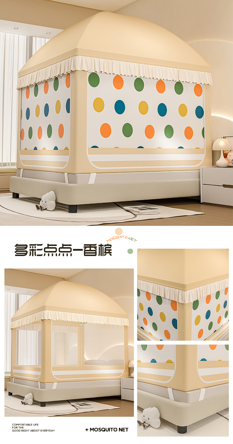 商品名称:冉美家纺 2025新款屋顶式遮光防尘防摔蚊帐 多彩点点-香槟