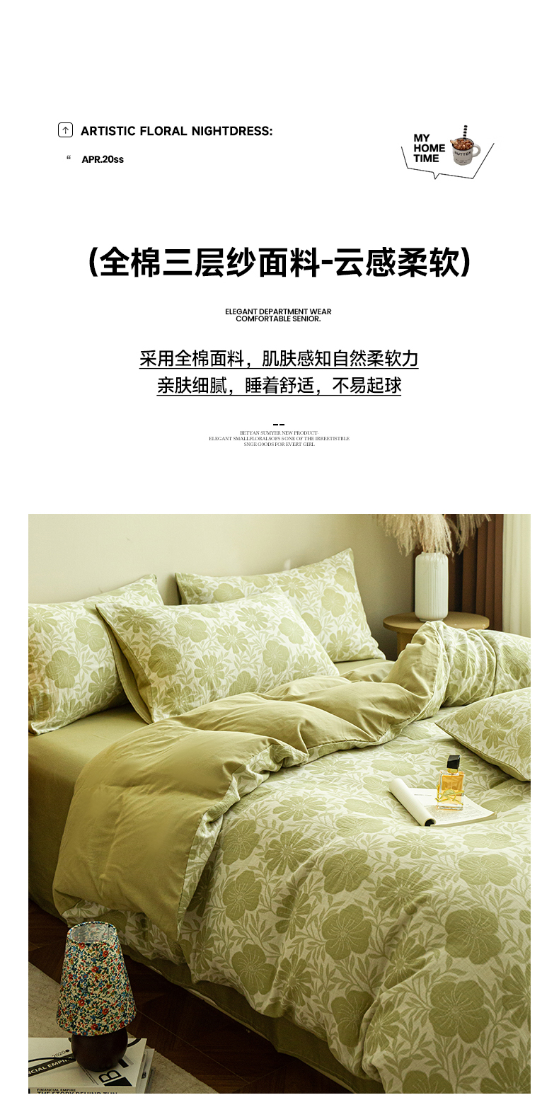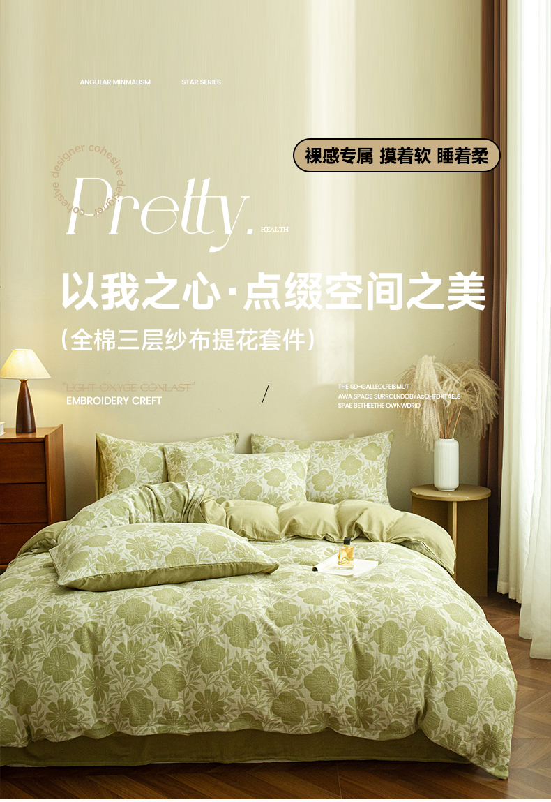 商品名称:2025新款A类全棉三层纱四件套 富贵花