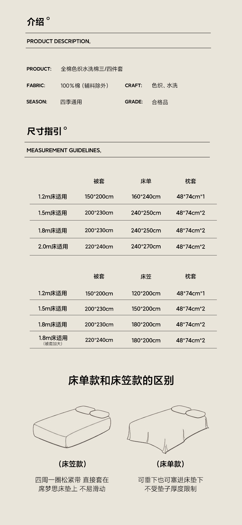 1.8米宽床:被套 200×230 床笠 180×200 枕套 48×74*2(只) | ¥125.00 |