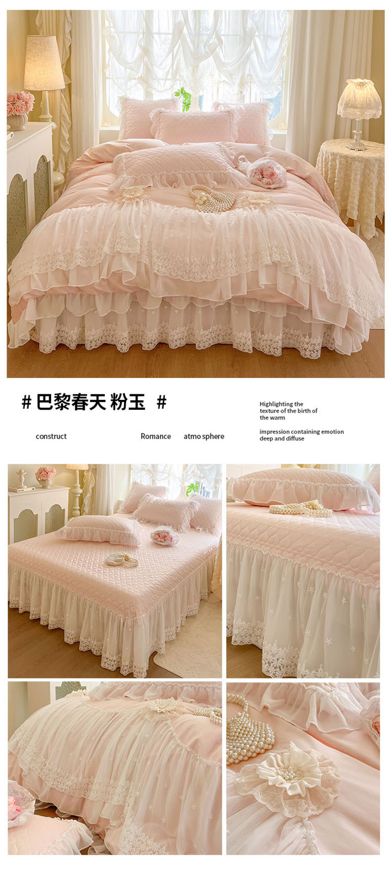 (总)亲亲公主家纺2025新款100支长绒棉全棉蕾丝夹棉床盖四件套-巴黎春天