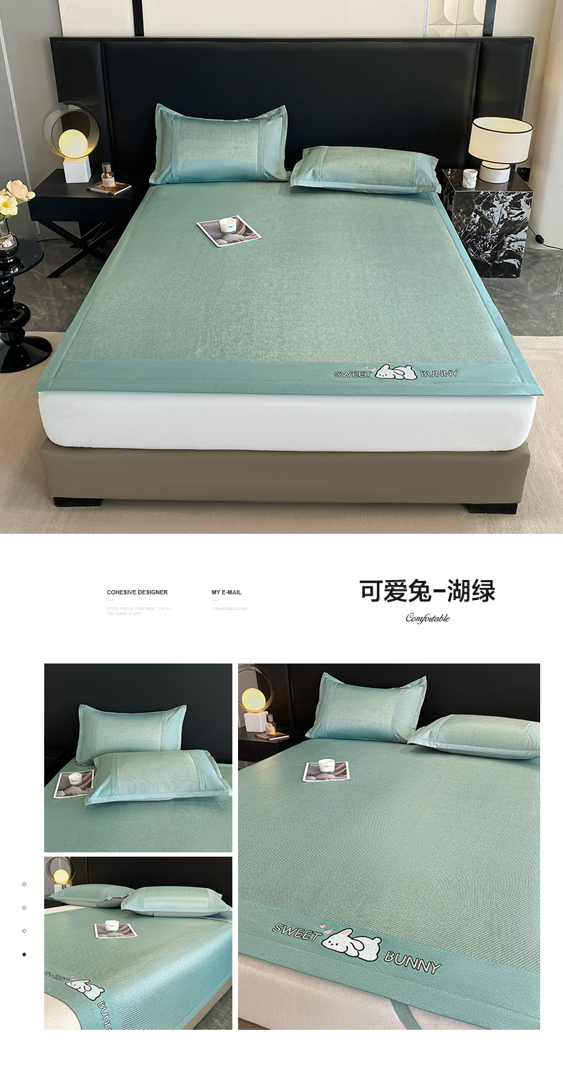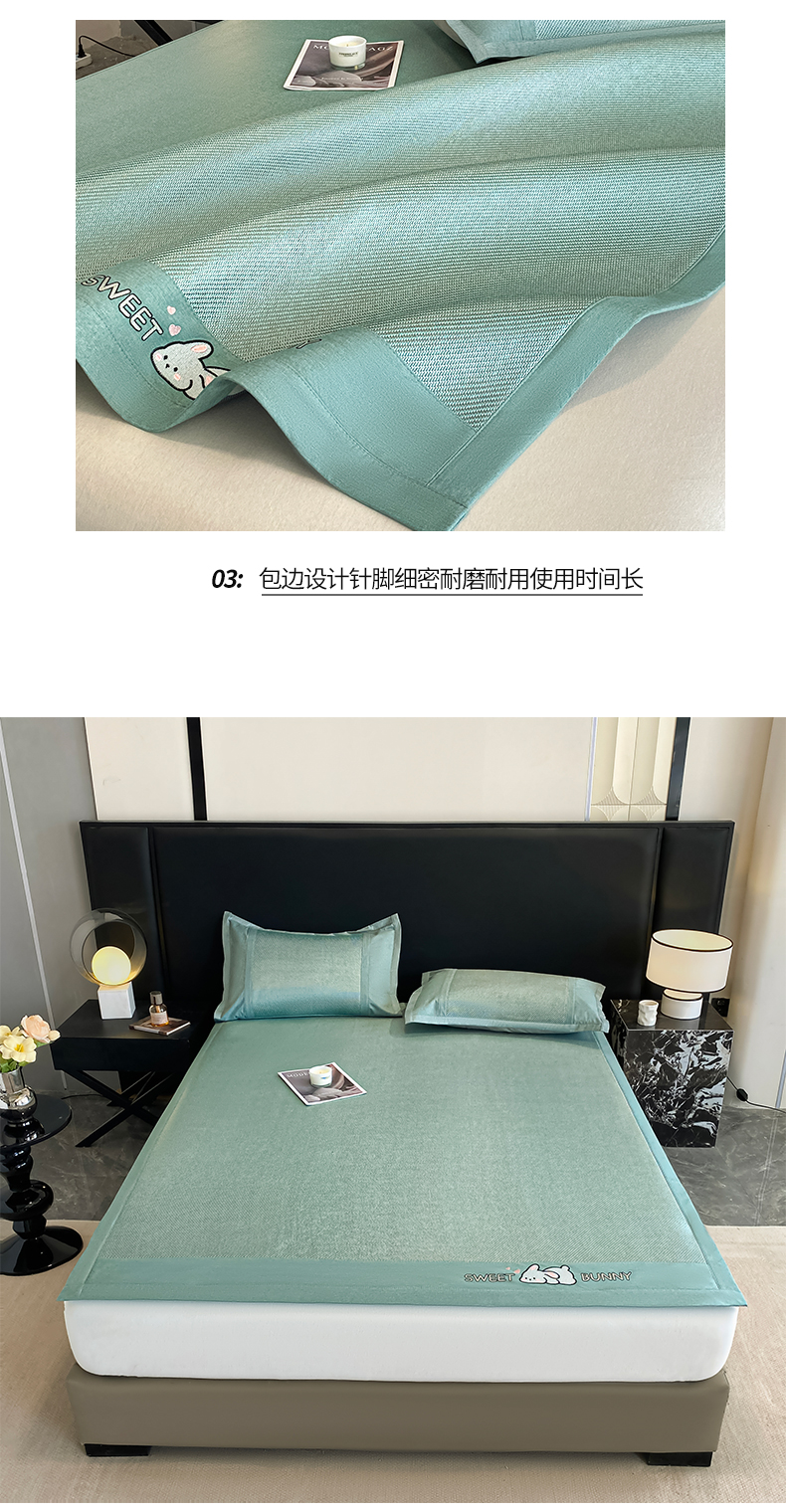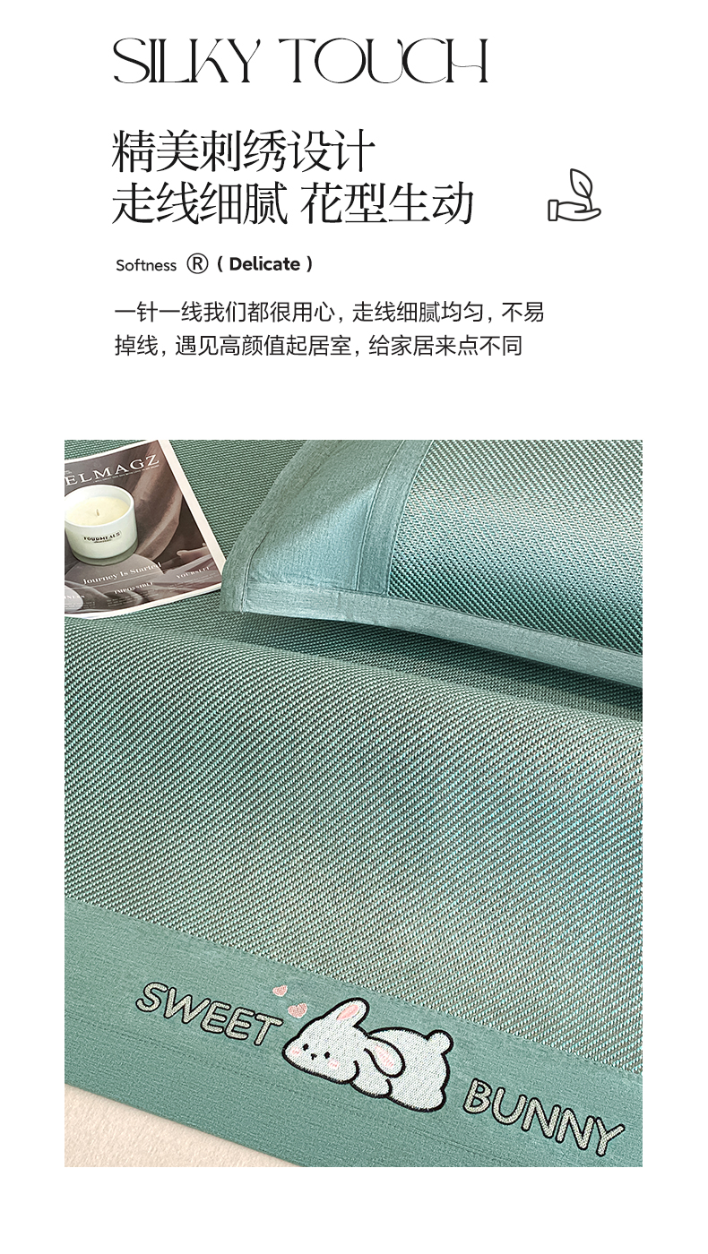 商品名称:莱米家纺 2025新款加厚凉感绣花冰藤席 可爱兔—湖绿-凉席