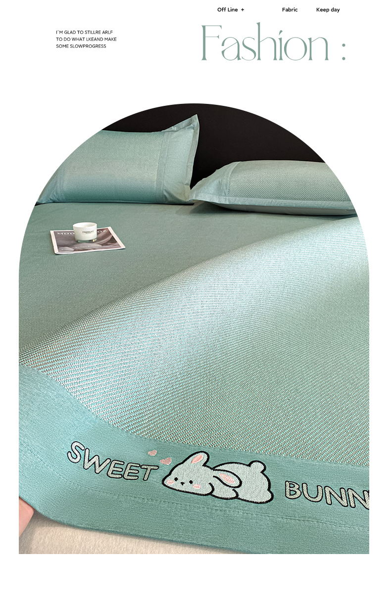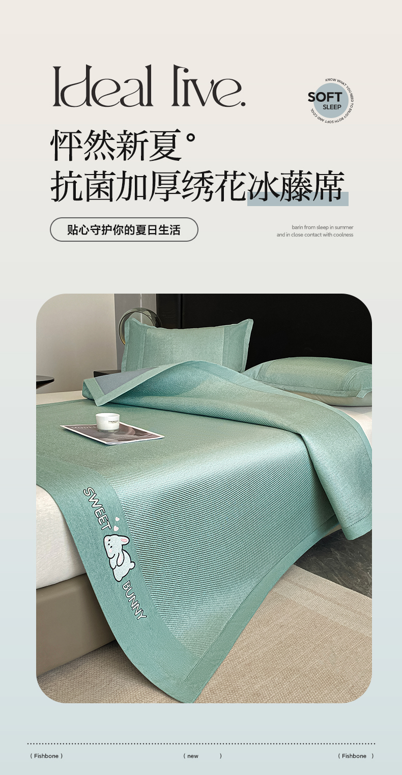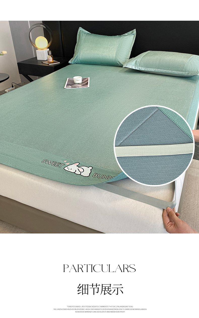 商品名称:莱米家纺 2025新款加厚凉感绣花冰藤席 可爱兔—湖绿-凉席