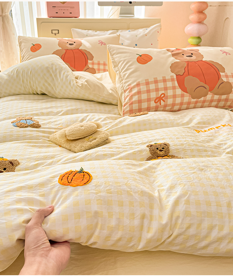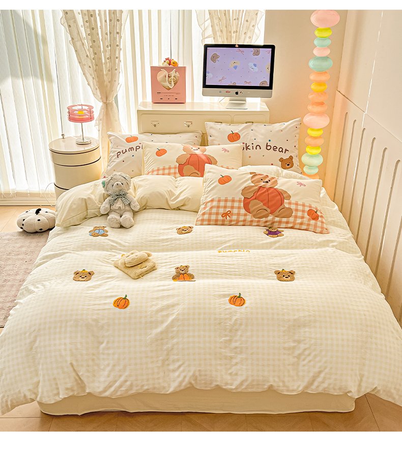 如一 2025新款A类数码枕套卡通毛巾绣水洗棉四件套 南瓜熊