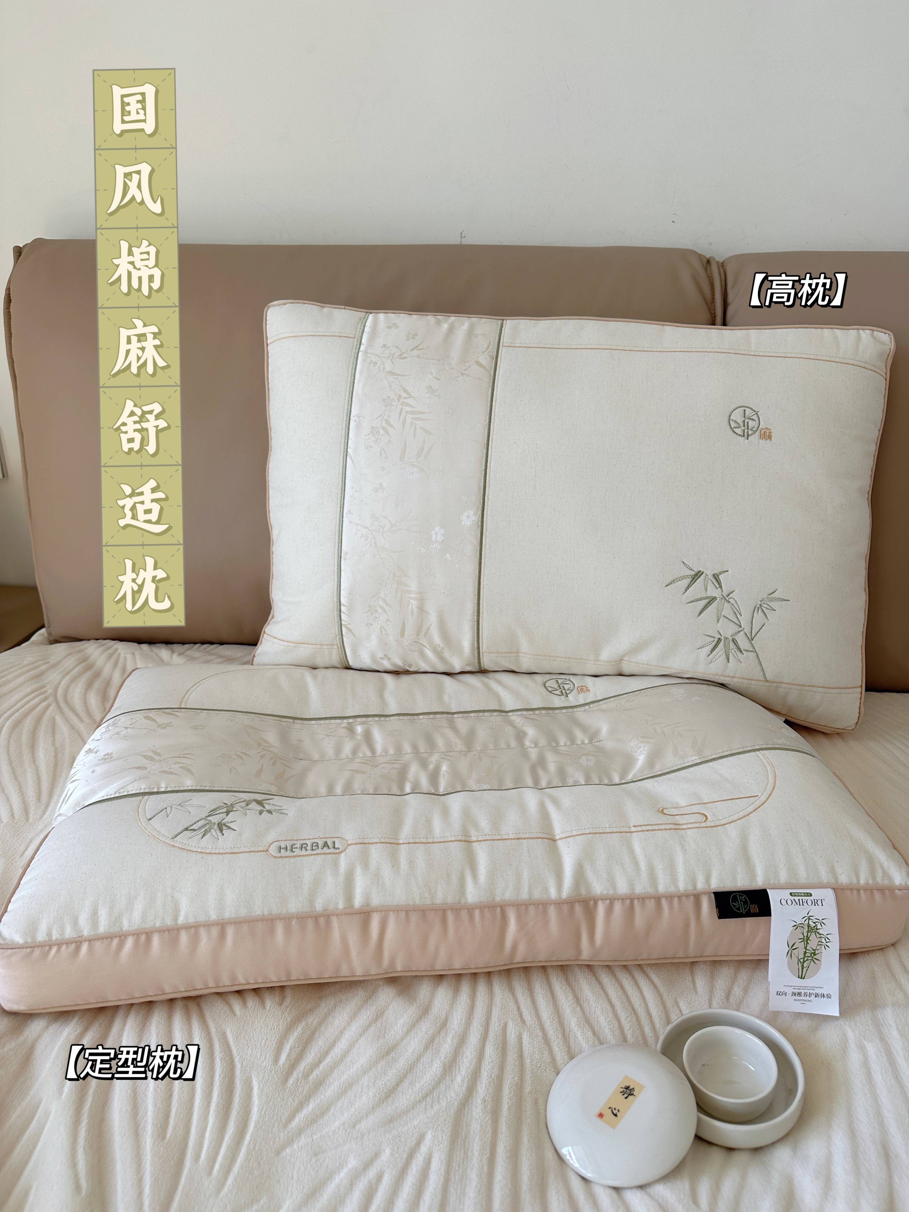 国风棉麻舒适枕】 面料1:94%棉+6%麻 (正面-有成分质检), 面料2:100%棉(反面-60s贡缎) 有质检, 面料3:100%聚酯纤维 (装饰); 填充:100%聚酯纤维 , 尺寸:48x74cm, 高度、重量: 高枕: 约15cm,睡下6-8cm,填充量约1000g,整体重量约1180g; 定型枕:约8cm,睡下3-5cm,填充量约1000g,整体重量约1180g