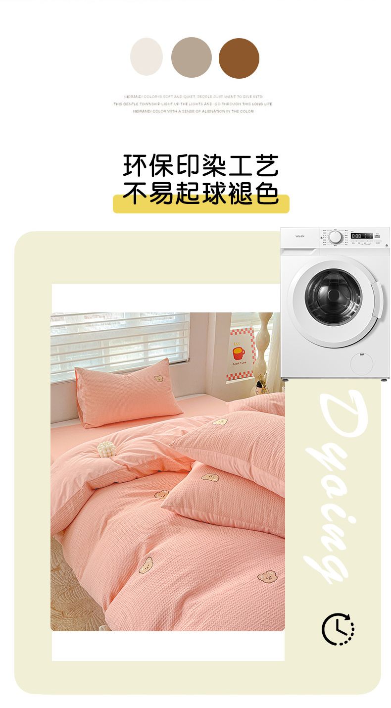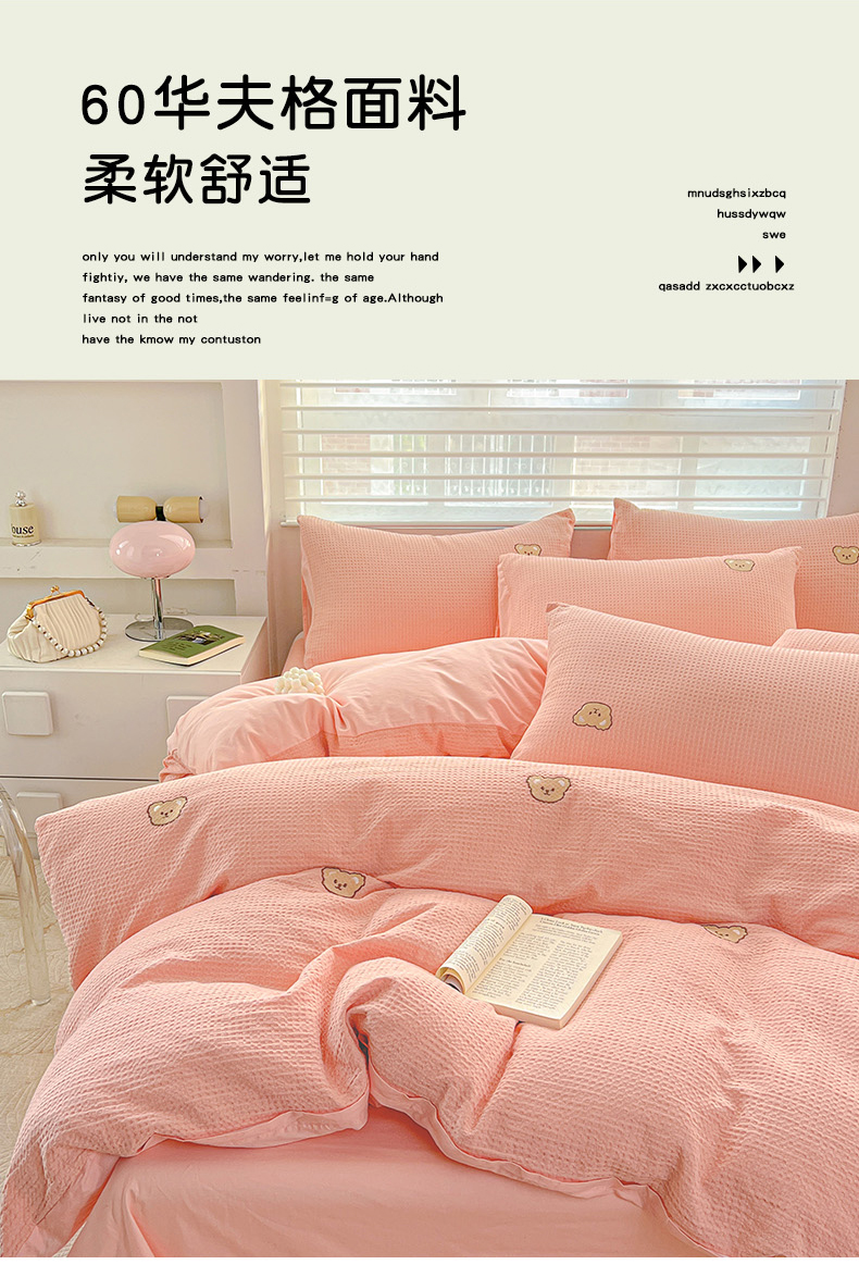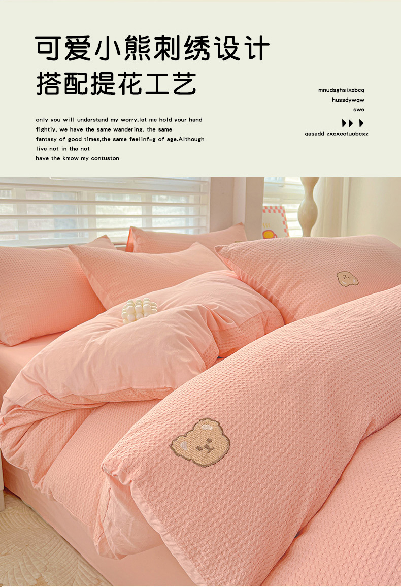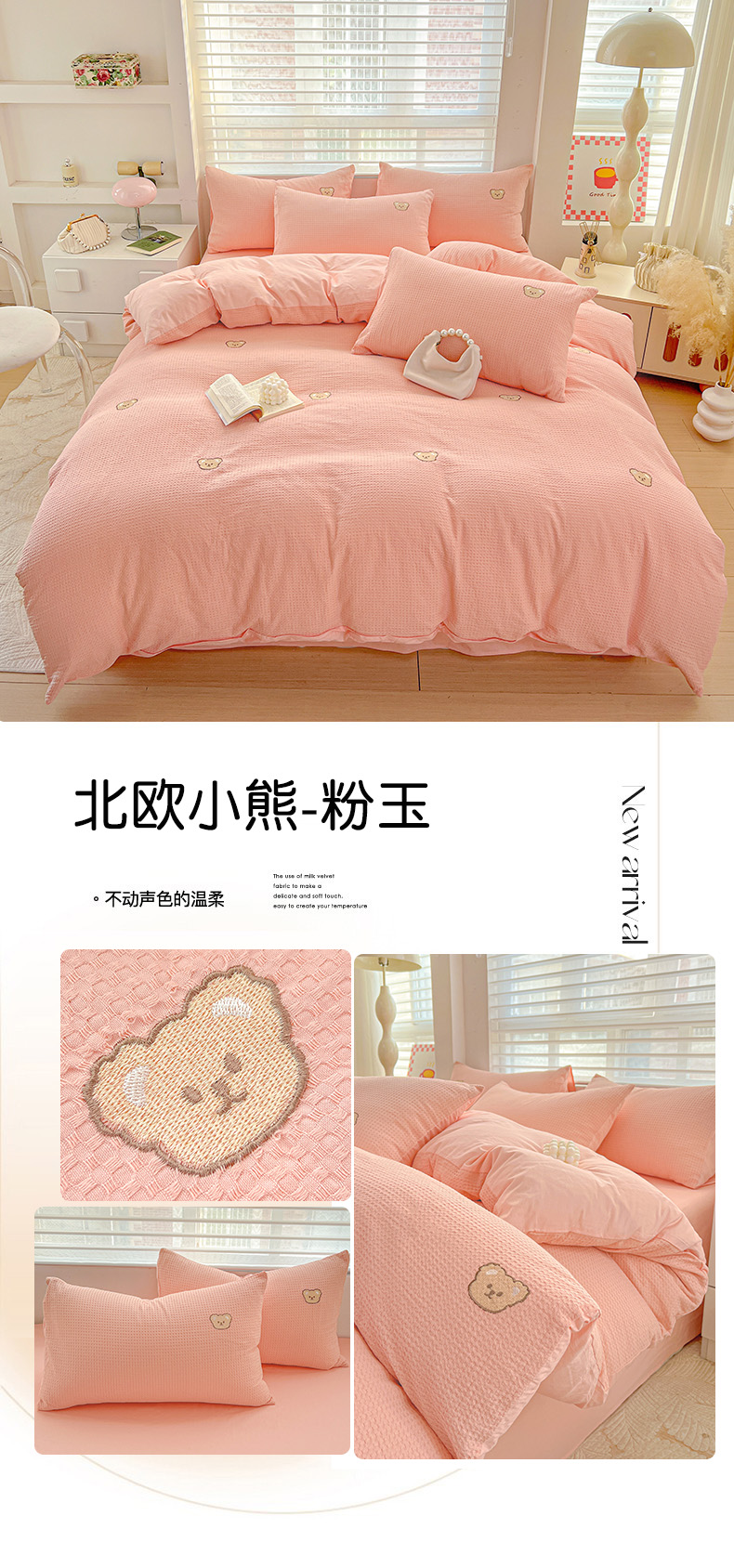 当前位置: 91家纺网 > 商品网购 > 床品套件 > 四件套 > 全棉普通四件套 > 静家居 2025新款全棉纯棉华夫格北欧小熊刺绣四件套系列-风格一 北欧小熊-粉玉
