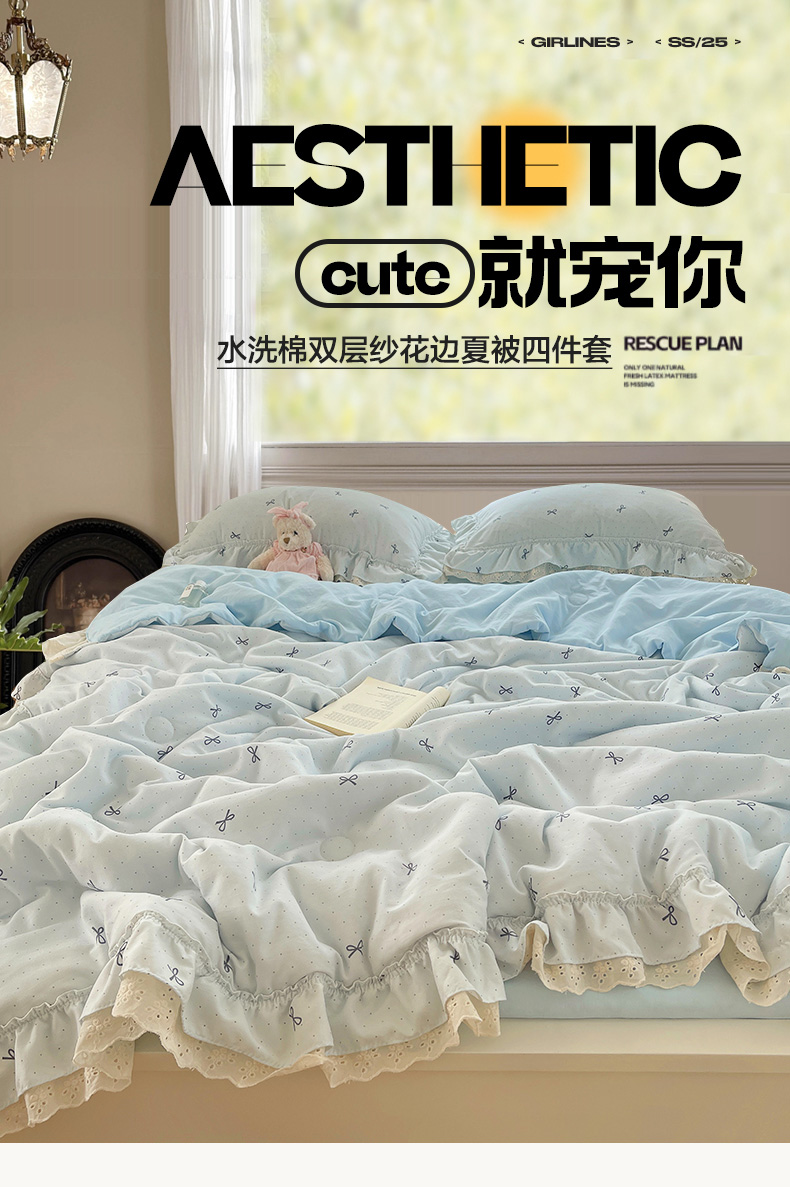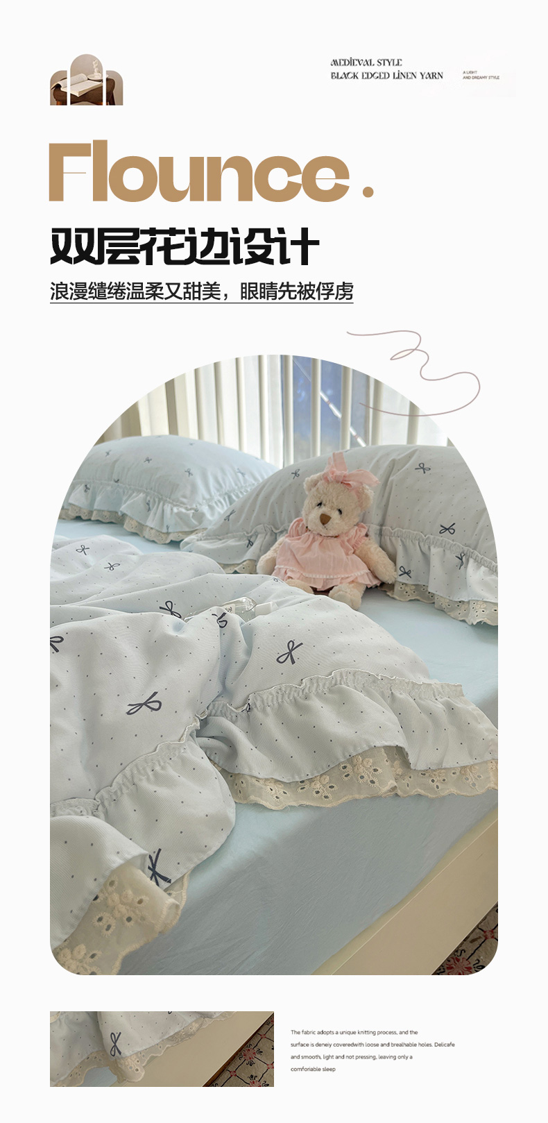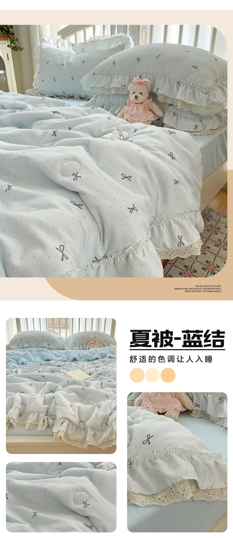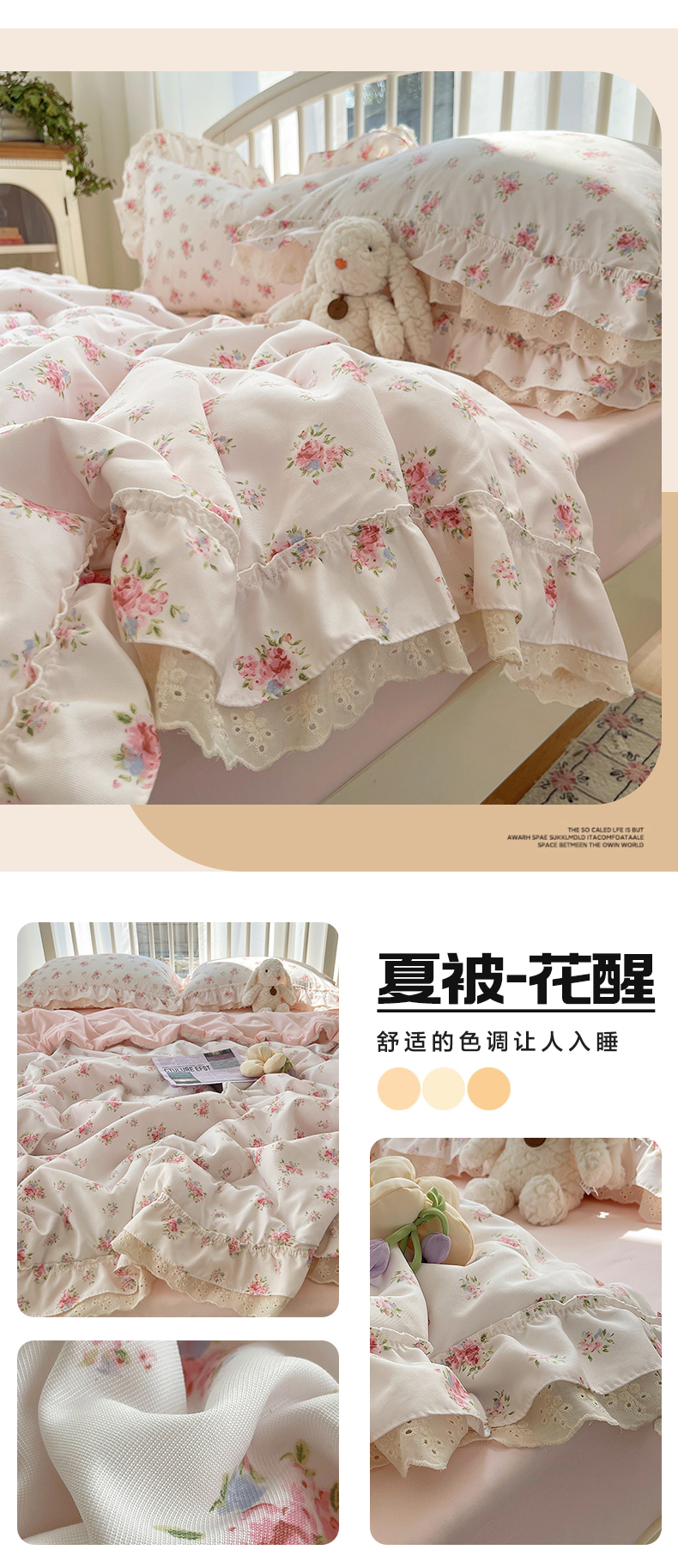 当前位置: 91家纺网 > 商品网购 > 床品套件 > 四件套 > 夏被四件套 > 轻奢坊 2025新款水洗棉双层纱双层花边夏被夏凉被空调被四件套 夏被-繁花