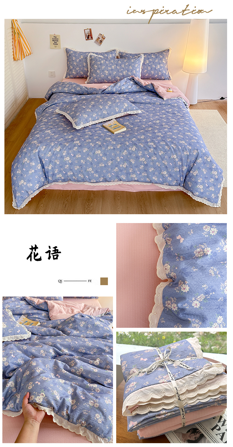 商品名称:斯卡诺家纺 2025新款纯棉花边双层纱四件套水洗棉四件套 幸福花开