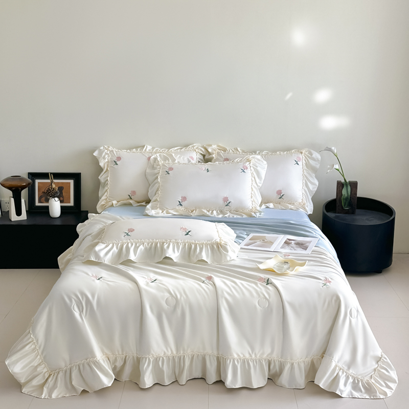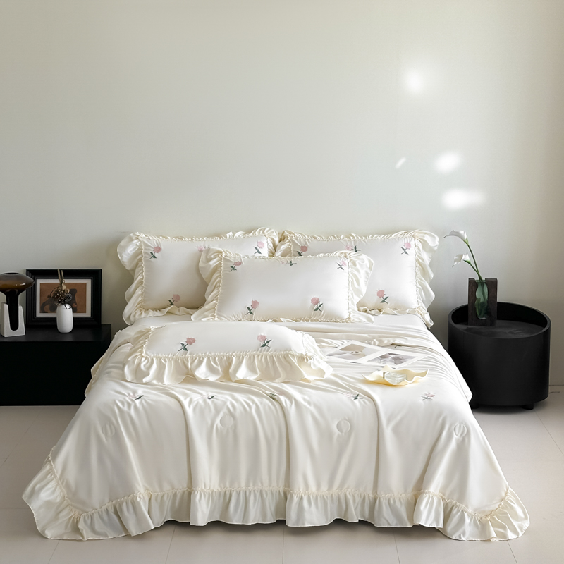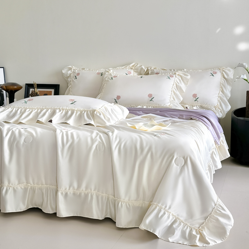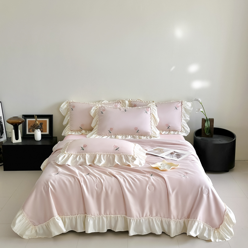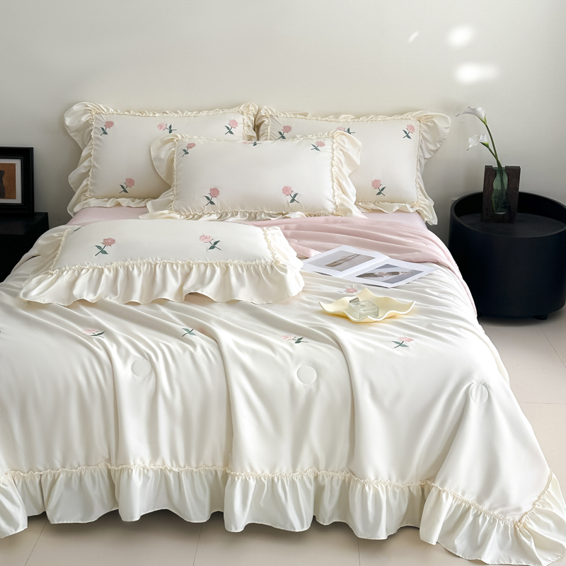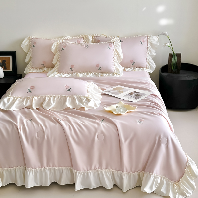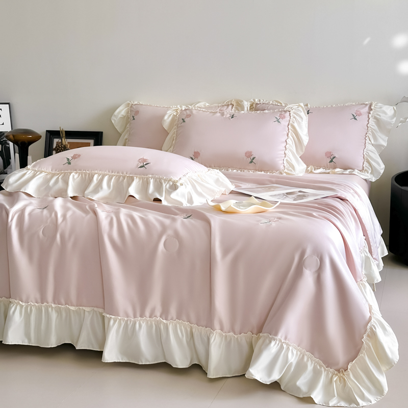 商品名称:红嘴企鹅 2025新款冰丝贴边花边夏被夏凉被空调被四件套 冰丝玫瑰花-白粉