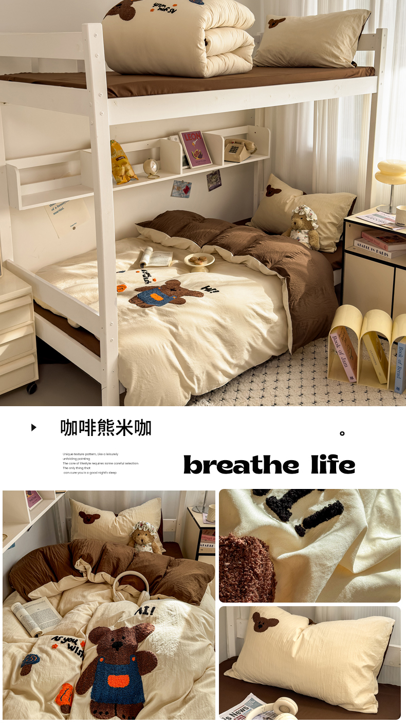 当前位置: 91家纺网 > 商品网购 > 床品套件 > 四件套 > 磨毛活性四件套 > 2025新款 985学姐推荐新款学生季宿舍可爱水洗棉毛巾绣四件套 咖啡熊米咖