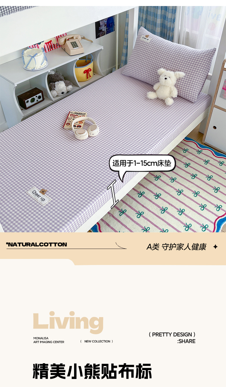 (总)佳笠家居 2026年新款kimi熊a类全棉色织水洗棉大尺寸单床笠,粉红小格,果绿小条,黑白格,灰小格,卡其小条,香芋紫格,野原-蓝,野原-绿,幽径-粉,丈蓝小条,组合