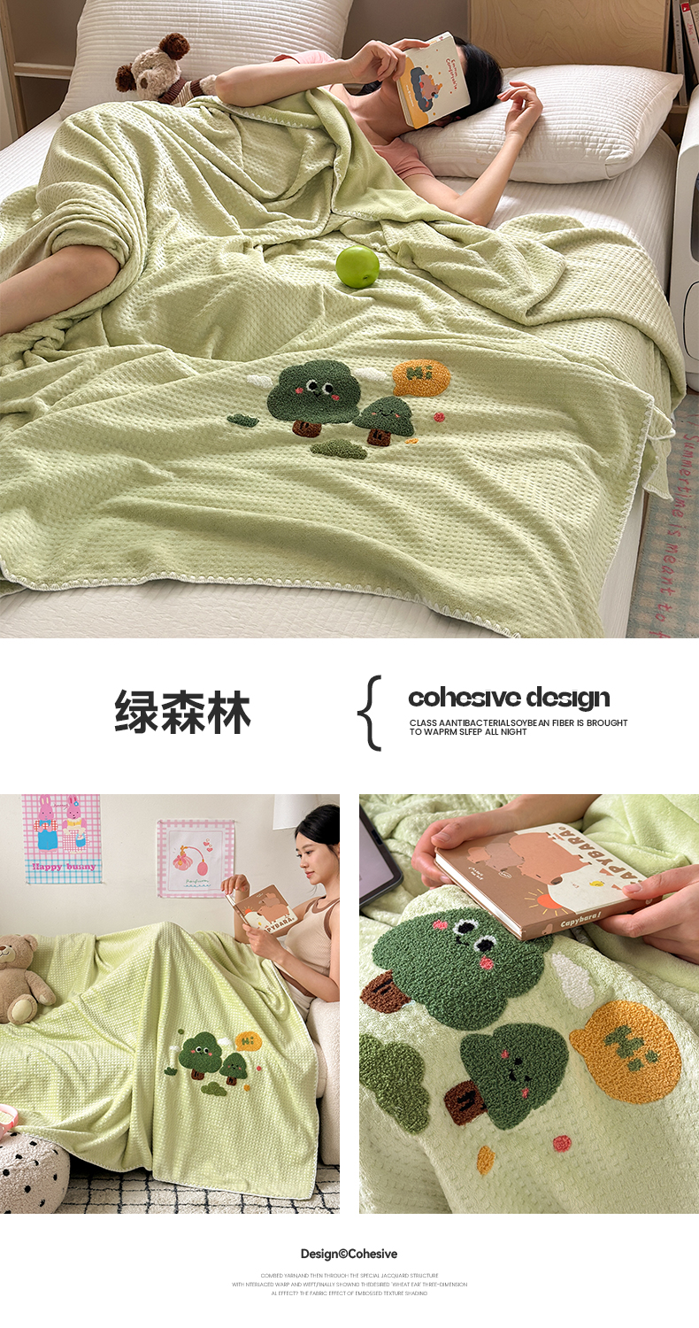 艾佳2025新款卡通绣花款小华夫格毛毯毯子 组合