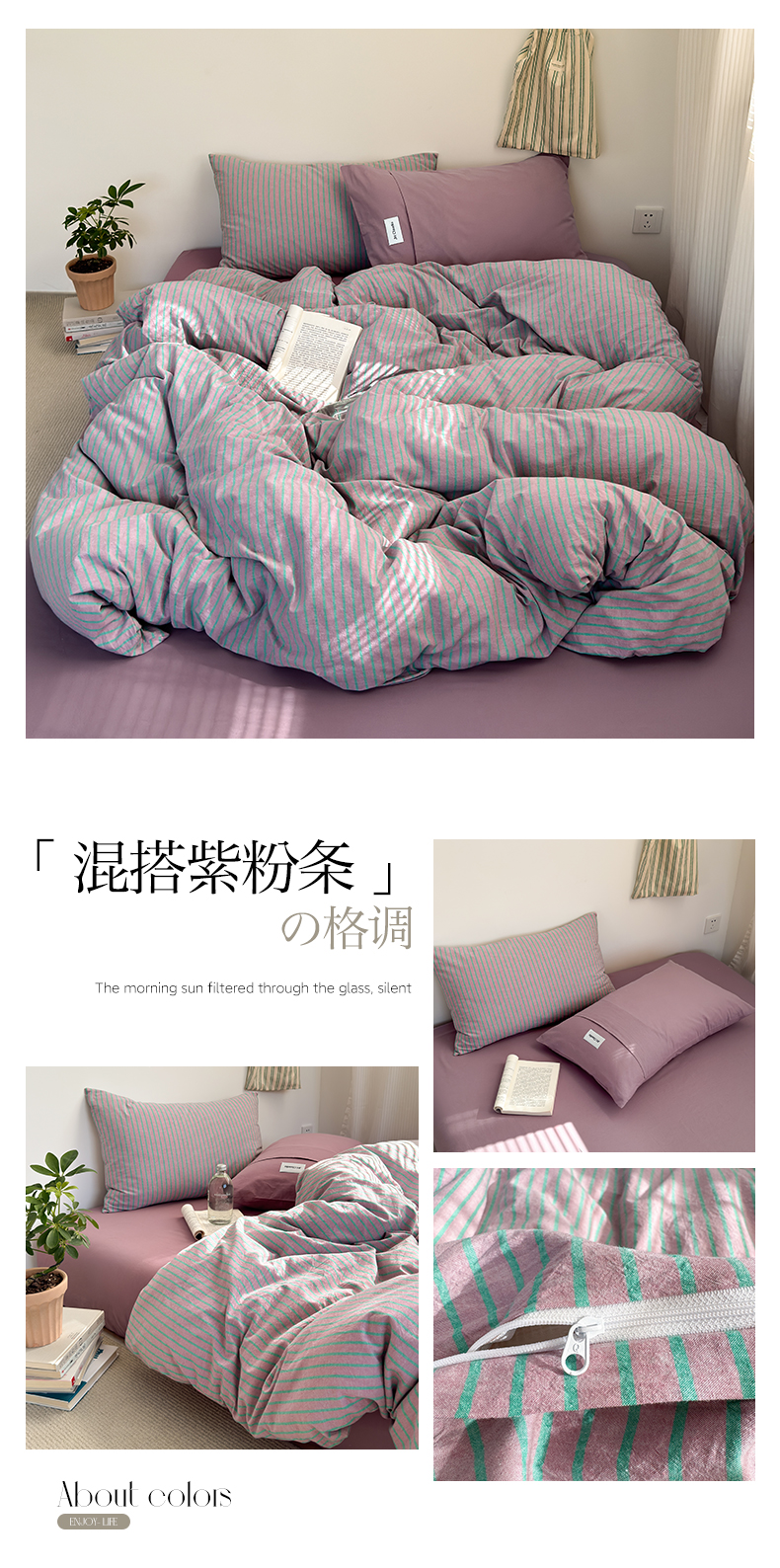 商品名称:玖弘家居 2025新款全棉纯棉水洗棉五色条纹混搭单被套 混搭绿紫条