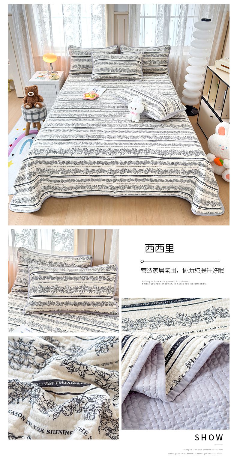 • 91家纺网 家纺一手货源 找家纺 橙子家居 2024新款A类木棉印花床盖三件套四季款夹层新疆棉花 组合图仅供展示