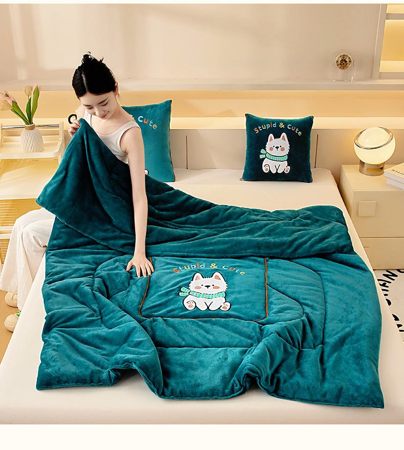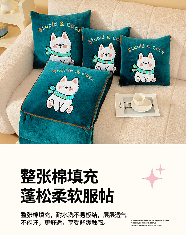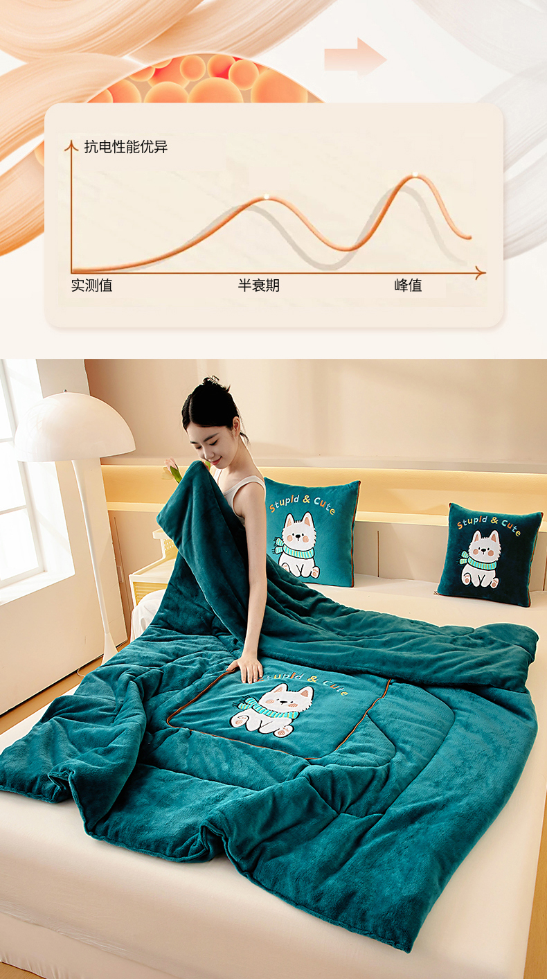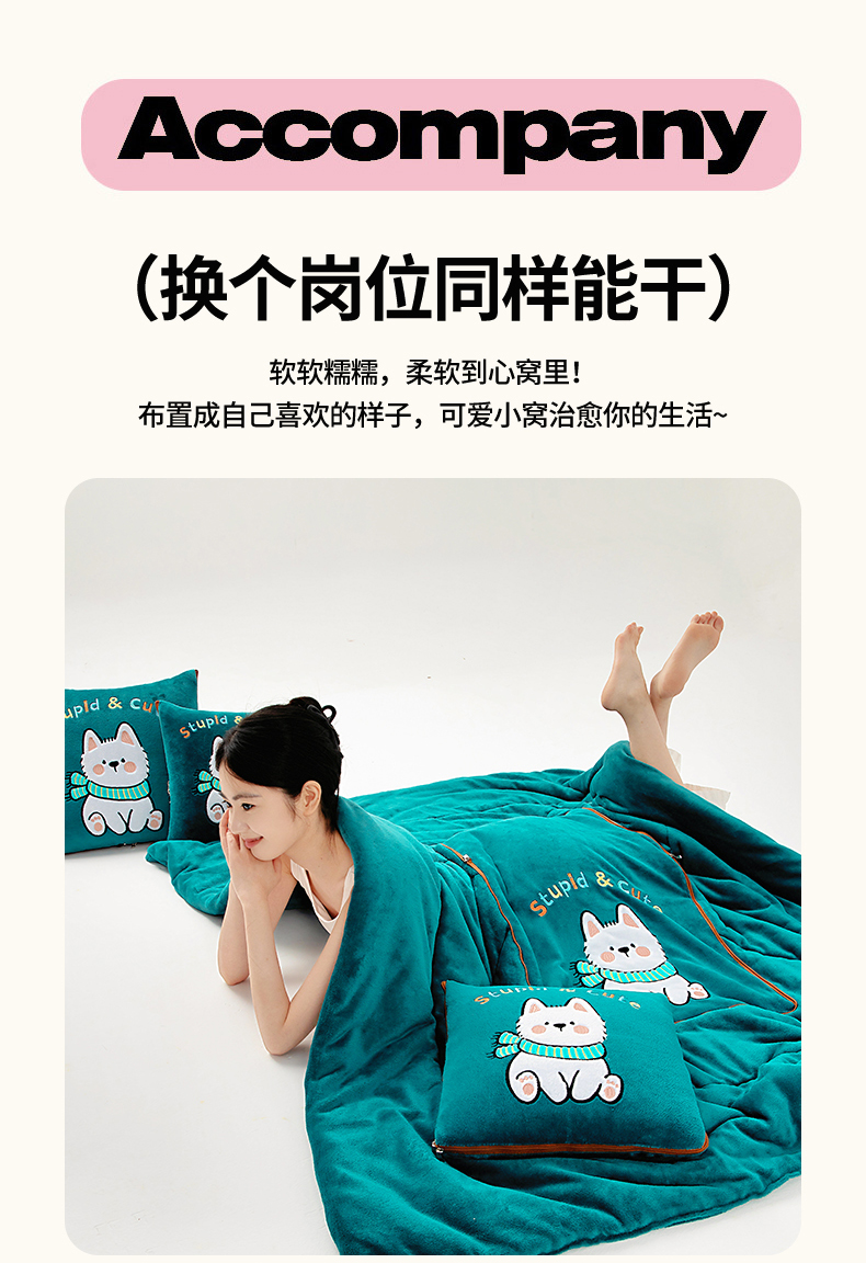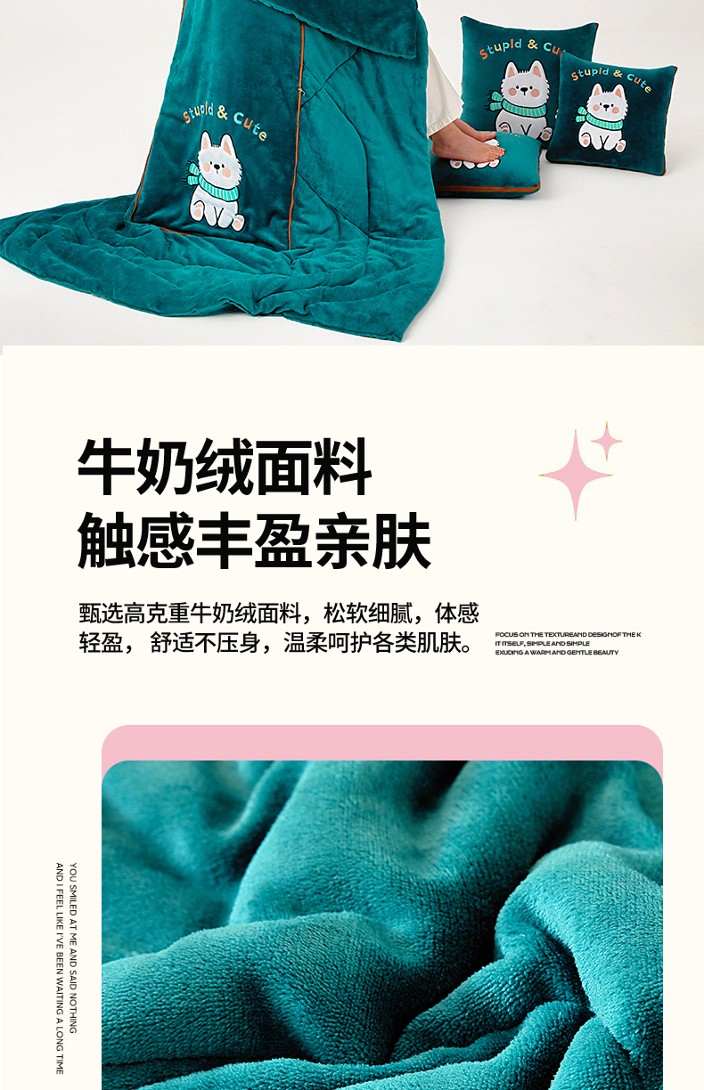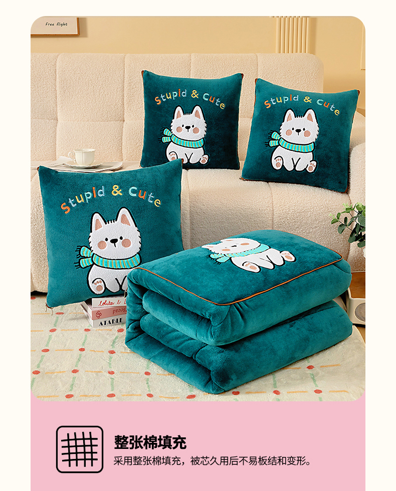 商品名称:阳光依佰抱枕被 2025秋冬新款牛奶绒多功能抱枕被系列-调皮狗 调皮狗---孔雀绿