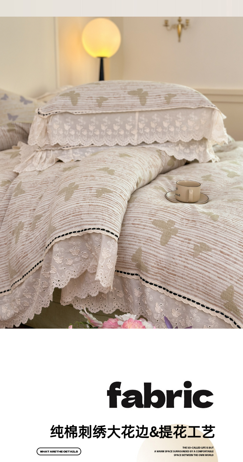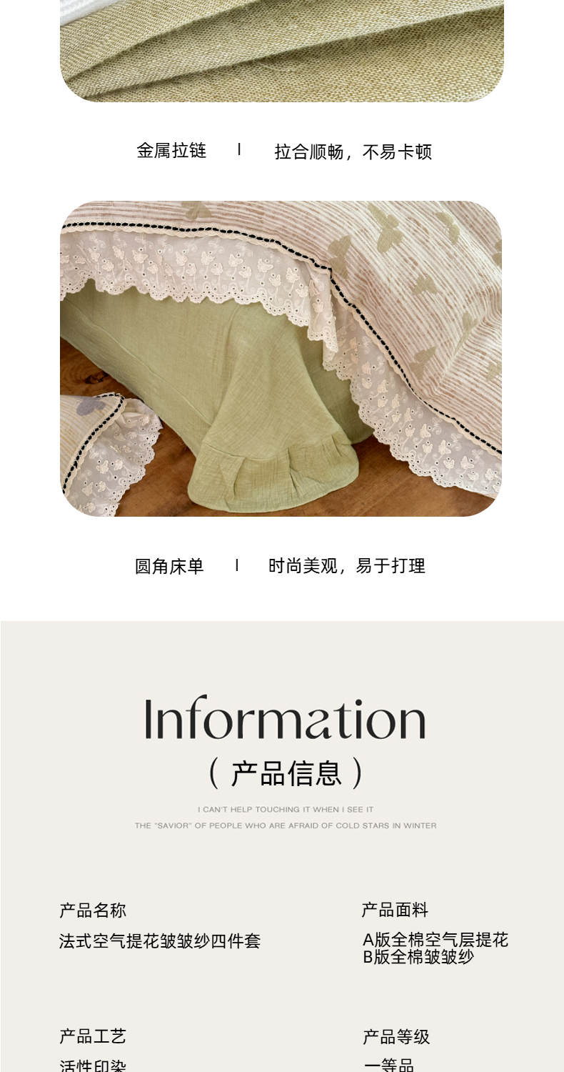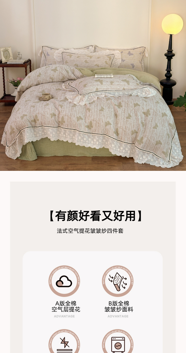 商品名称:淑女公社家纺 2025秋冬新款法式空气提花皱皱纱四件套-蝶舞 蝶舞 抹茶绿