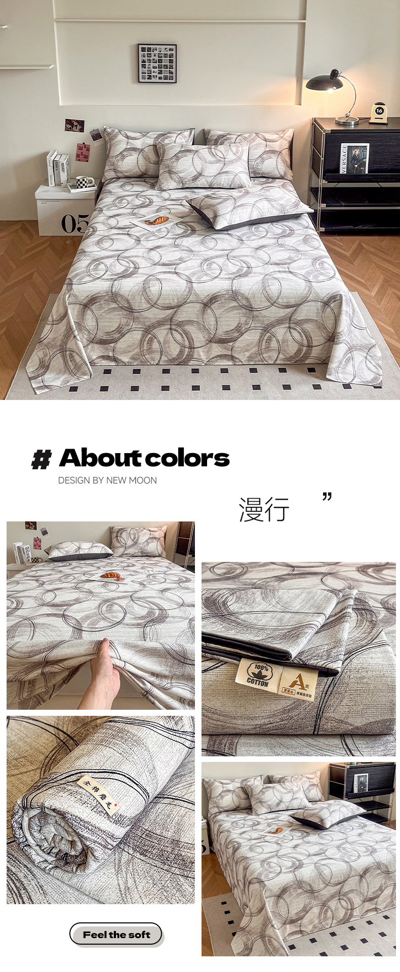(总)慕梵家居2025新款100%全棉磨毛单床单A类纯棉加厚,缤纷,炽热,几何灰,几何咖,律动黑,律动咖,漫行,墨白,七彩波点,晴空,糖果粉,星轨,跃梦,织语