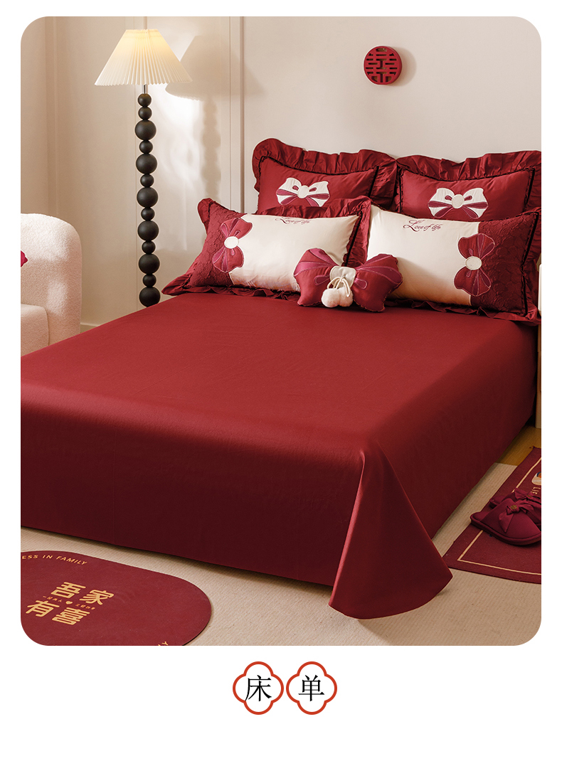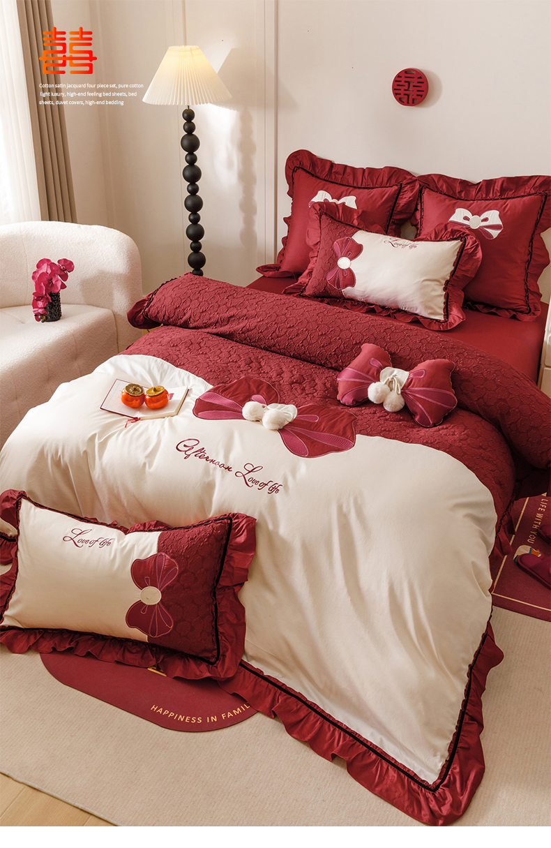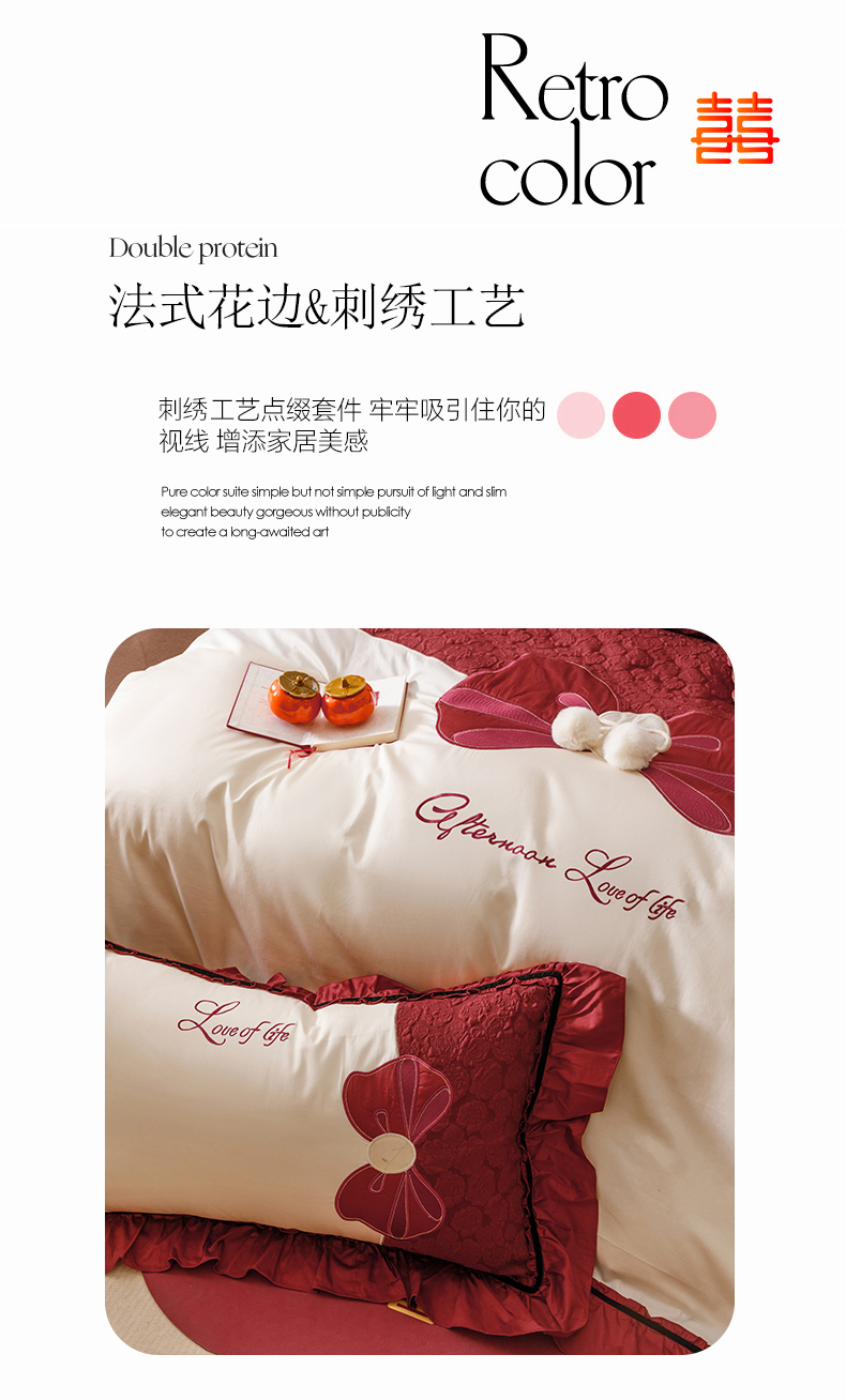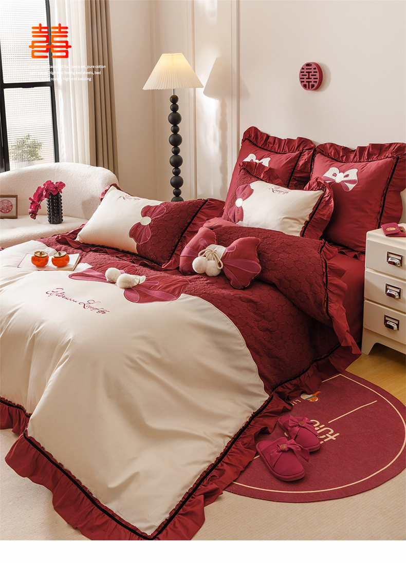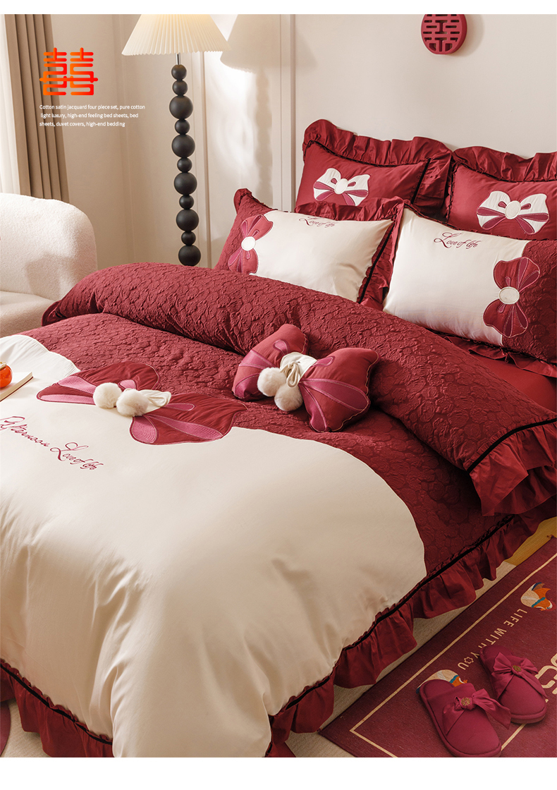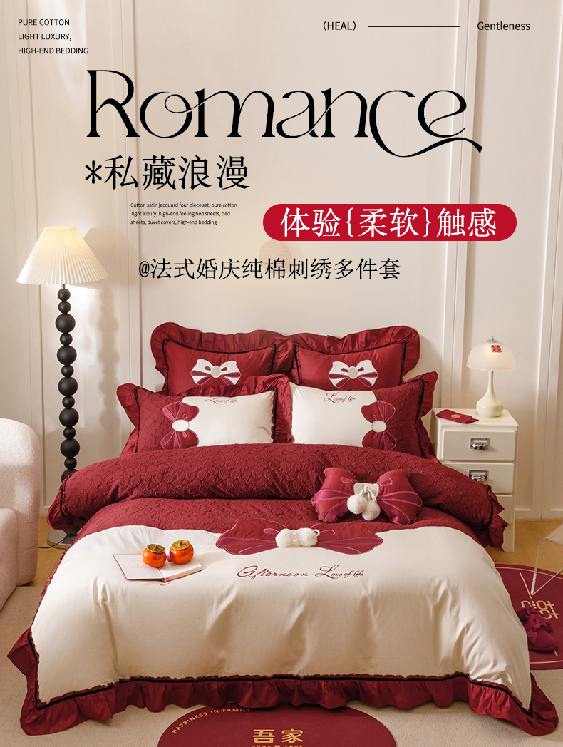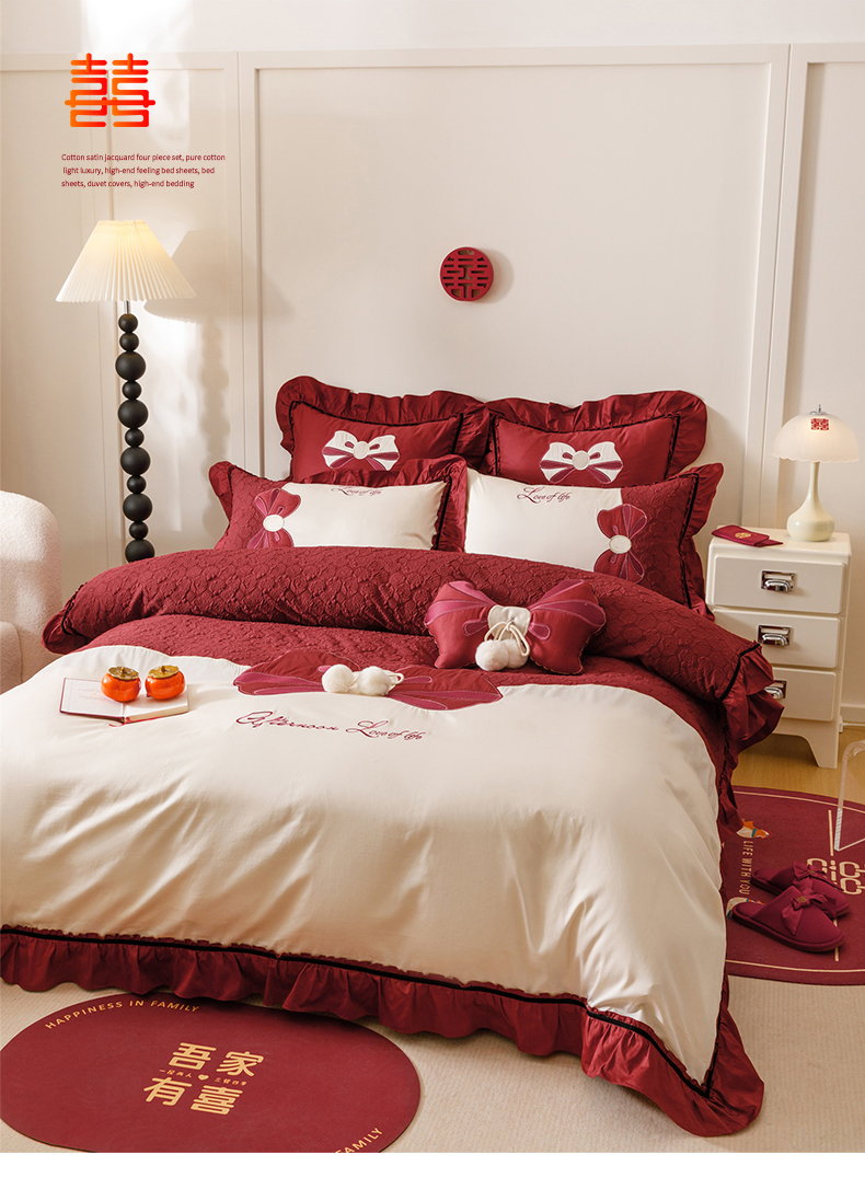 当前位置: 91家纺网 > 商品网购 > 床品套件 > 四件套 > 全棉普通四件套 > 宏羽纺家纺 2025新款100s全棉纯棉贡缎法式刺绣花边四件套 纯棉时尚-知喜-拼色