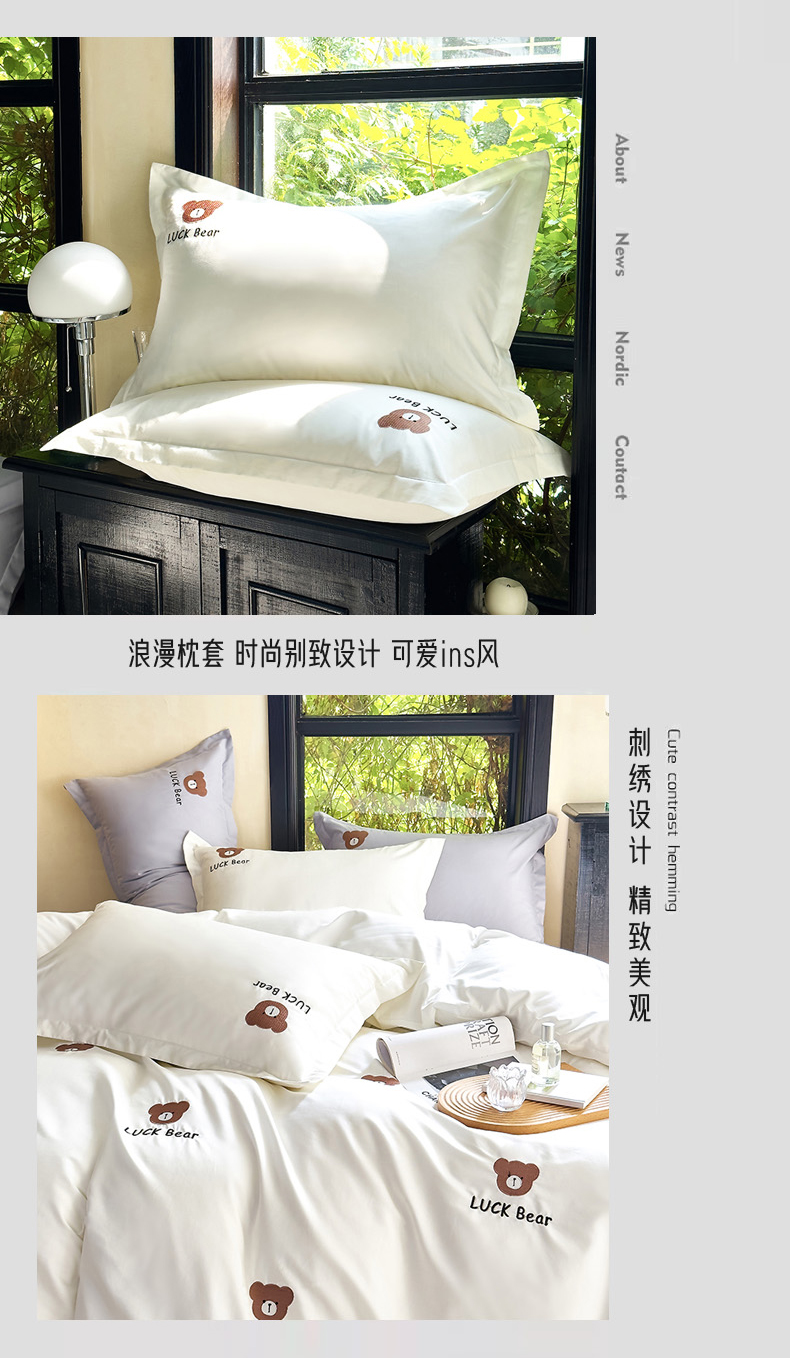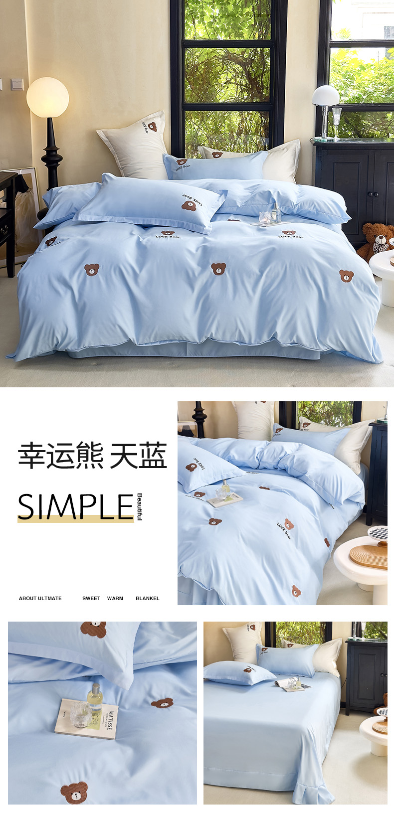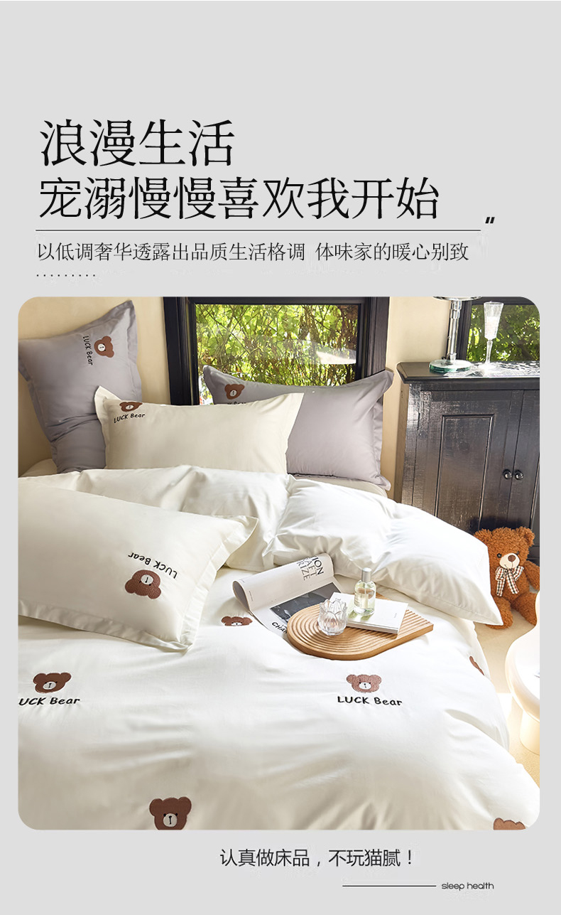 青泽家纺 2025新款水洗棉绣花磨毛四件套碳素磨毛床单款床笠款套件 幸运熊-白