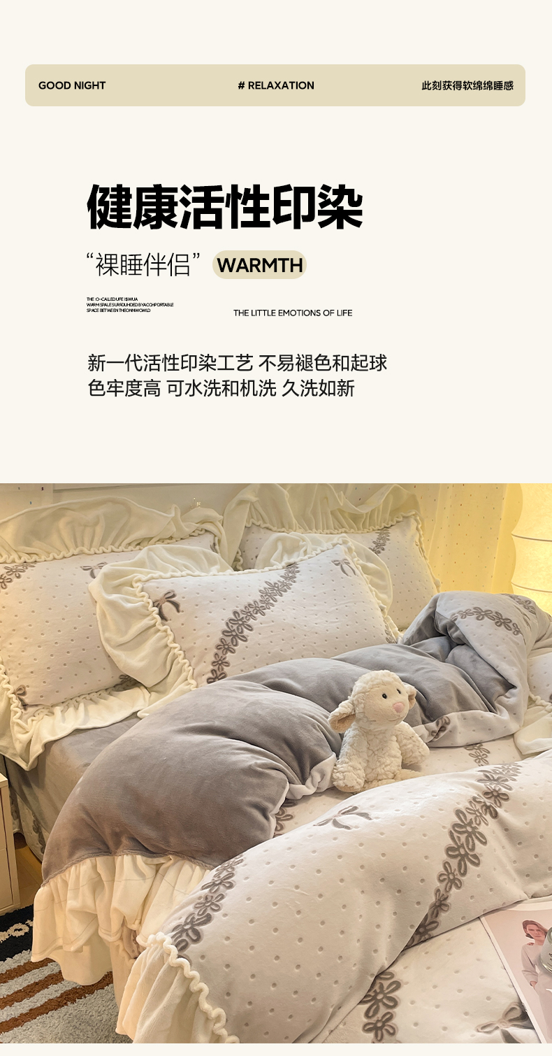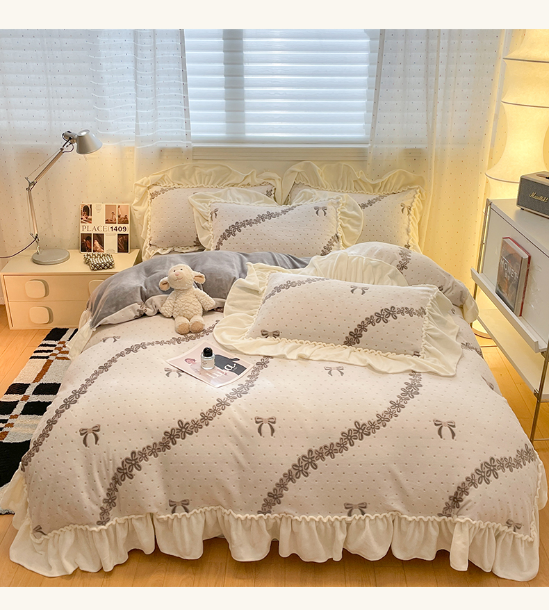(总)利欧 2025新款褶皱边雕花牛奶绒四件套,玫影-紫,蝶舞-蓝,蝶舞-绿,玫影-橙,少女结-粉,少女结-灰,少女结-蓝,舞蝶-粉