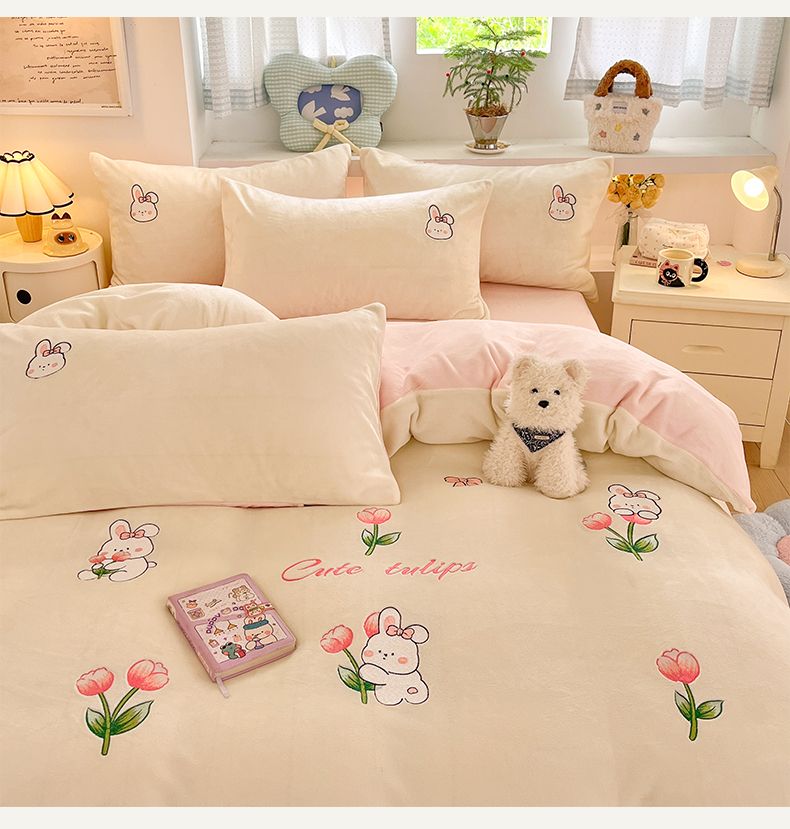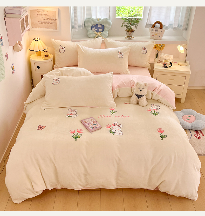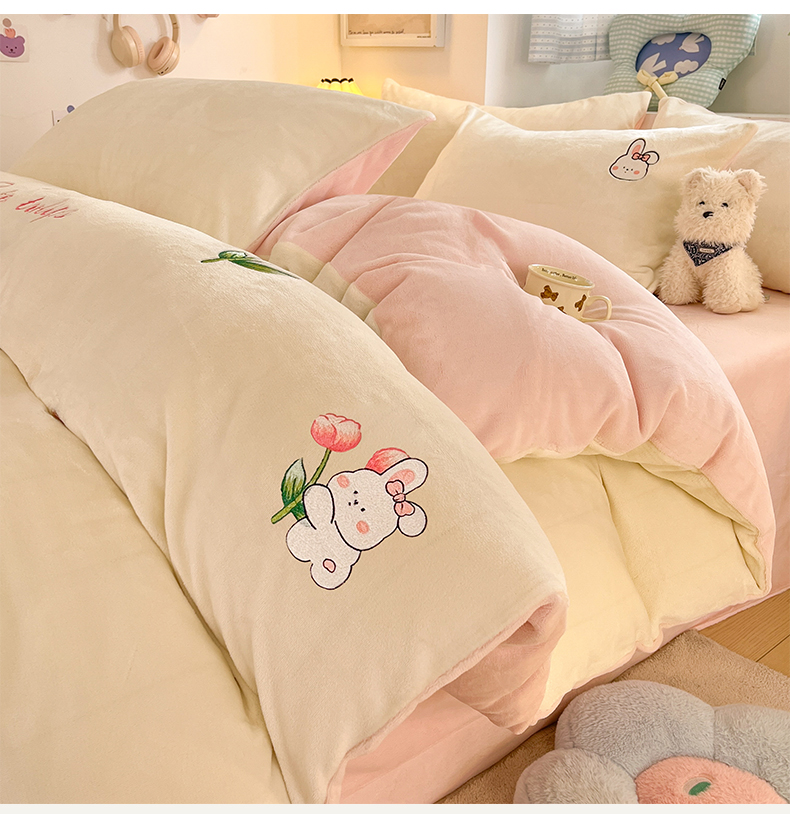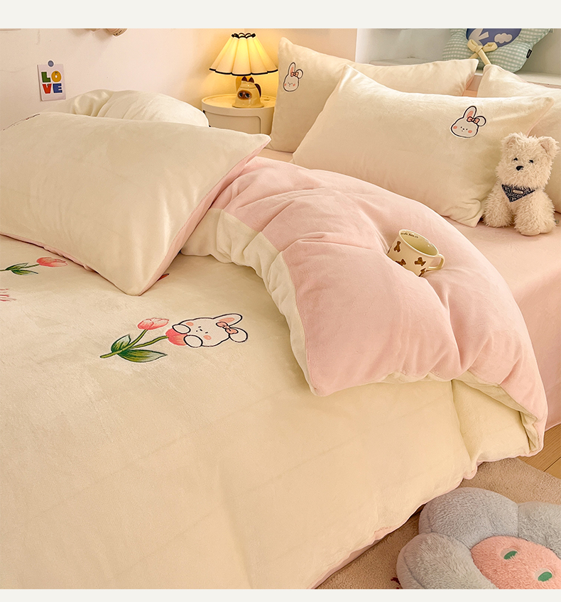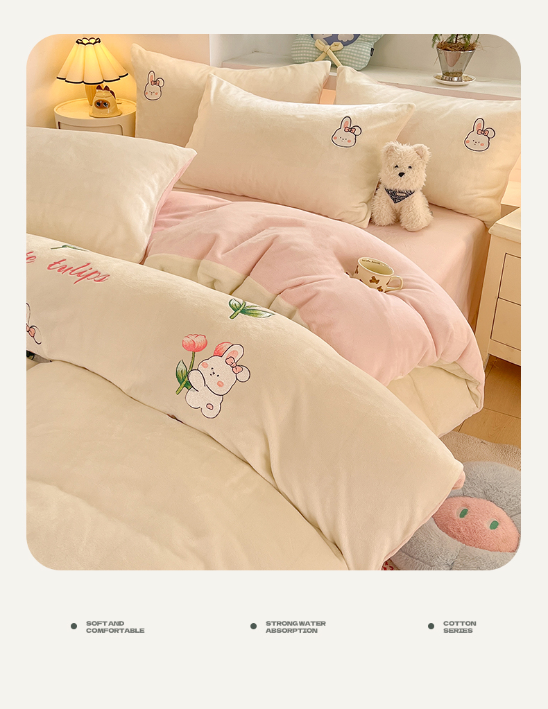 商品名称:利欧 2025新款满绣卡通牛奶绒刺绣四件套 鲜花小兔-米白