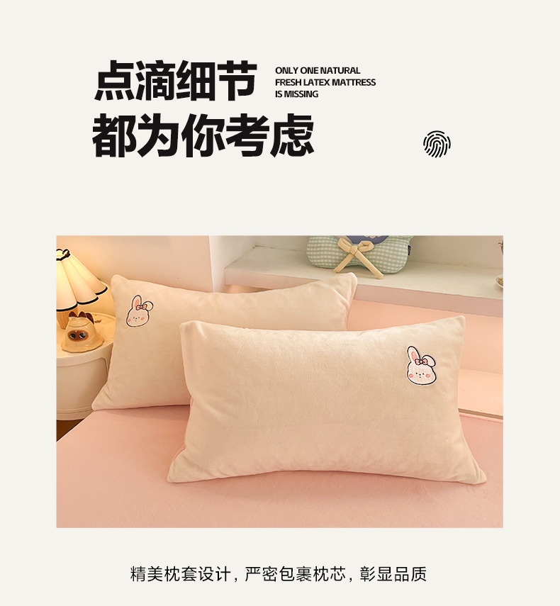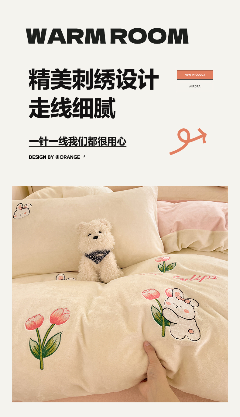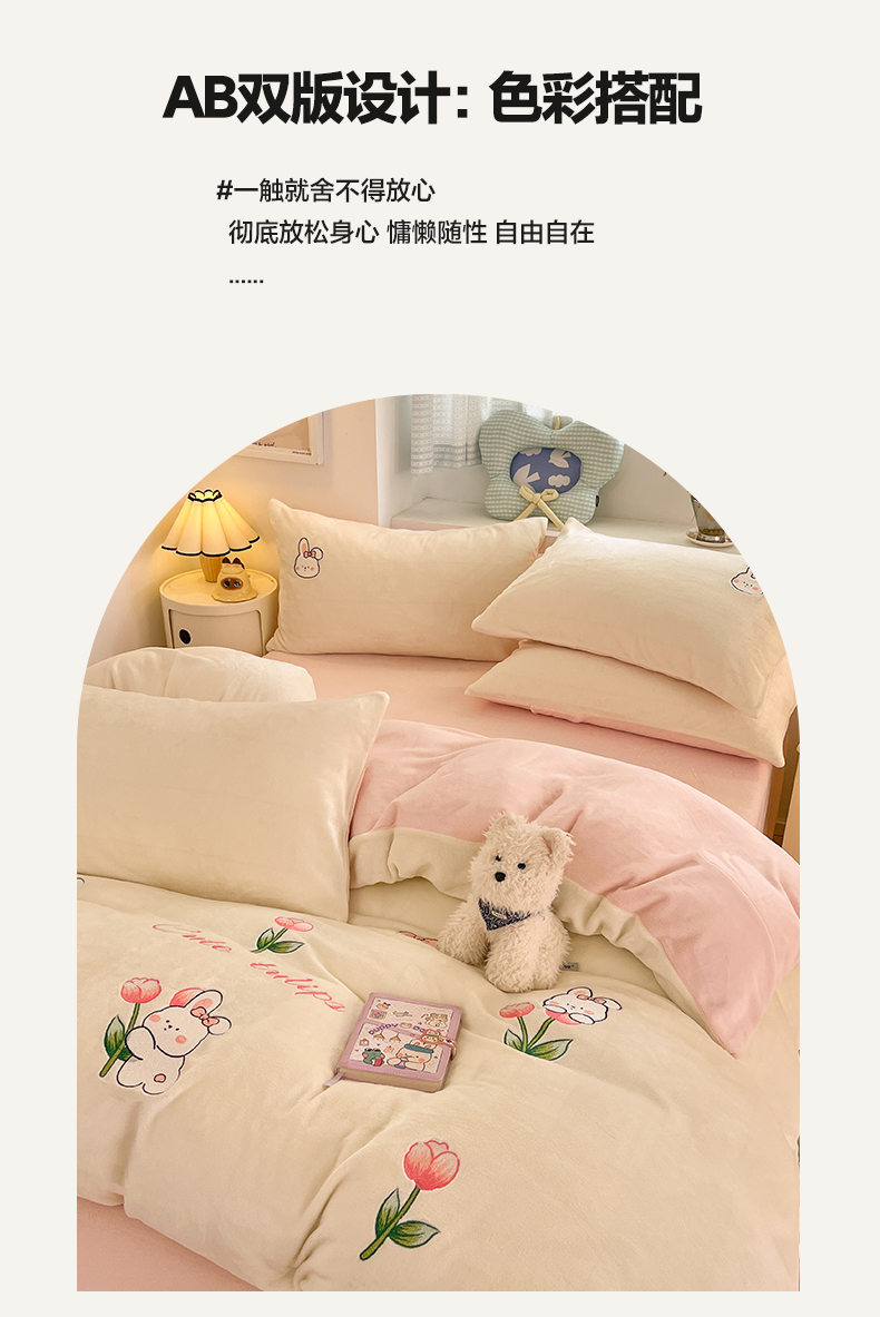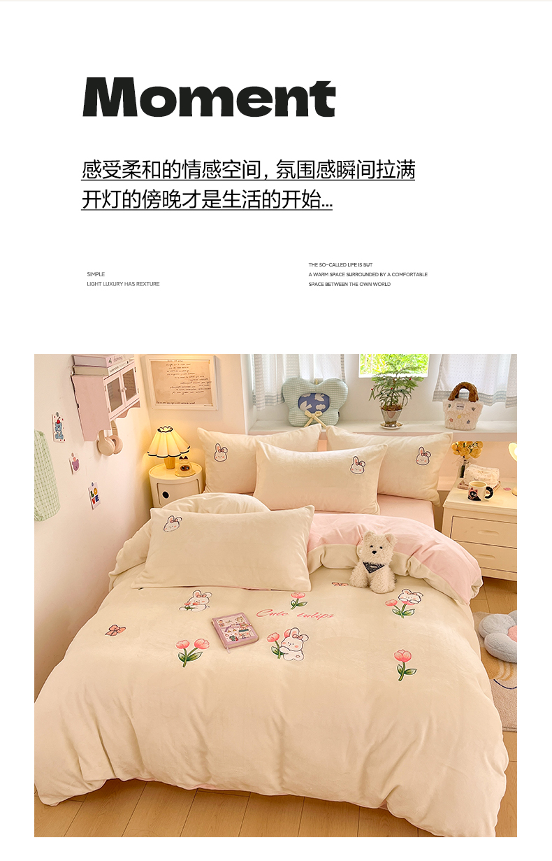 商品名称:利欧 2025新款满绣卡通牛奶绒刺绣四件套 鲜花小兔-米白