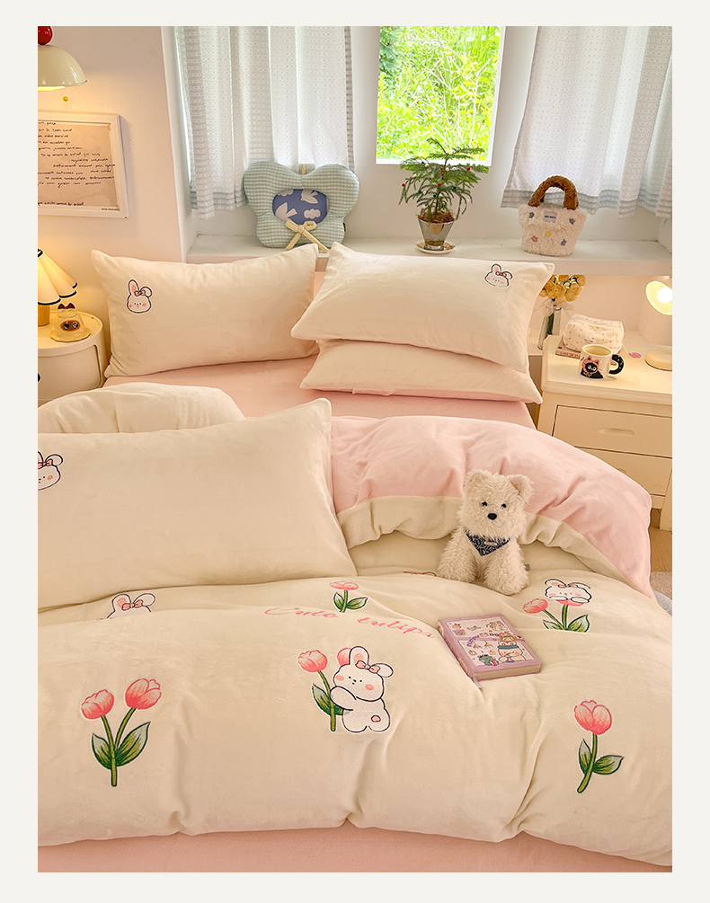 利欧 2025新款满绣卡通牛奶绒刺绣四件套 鲜花小兔-米白