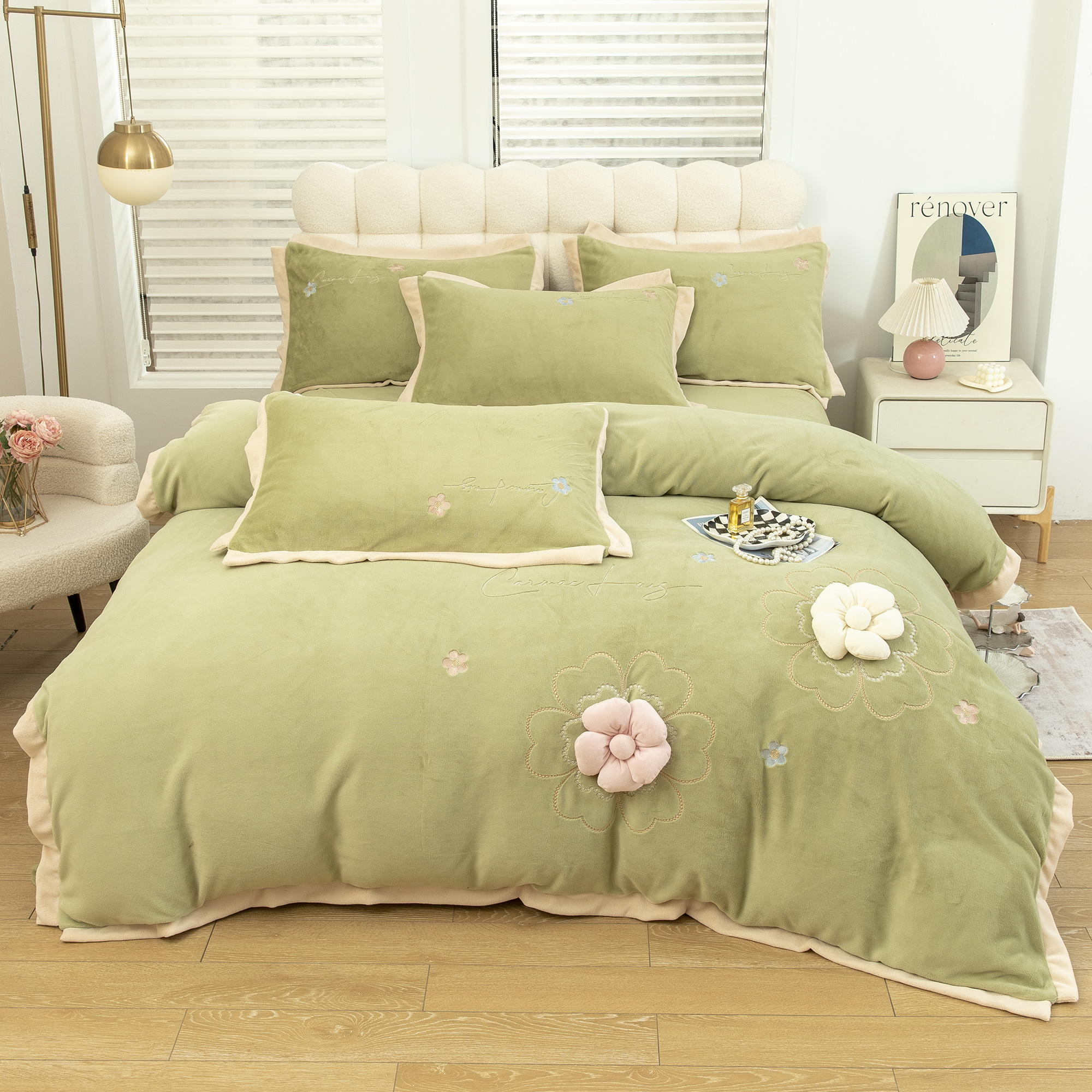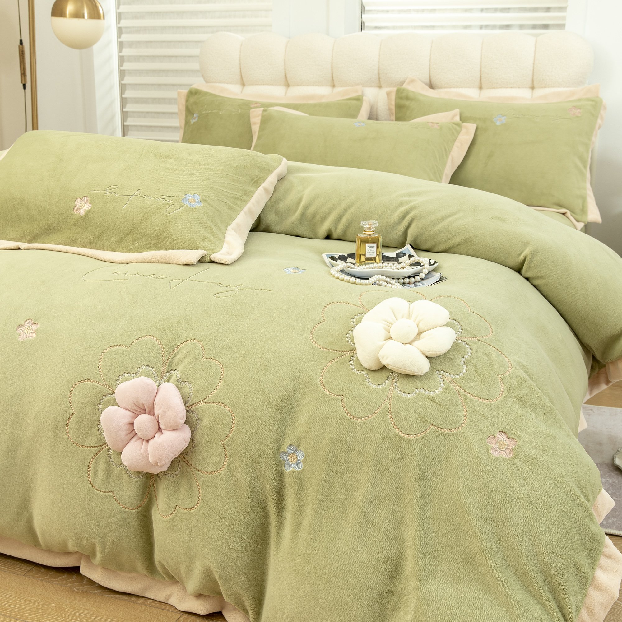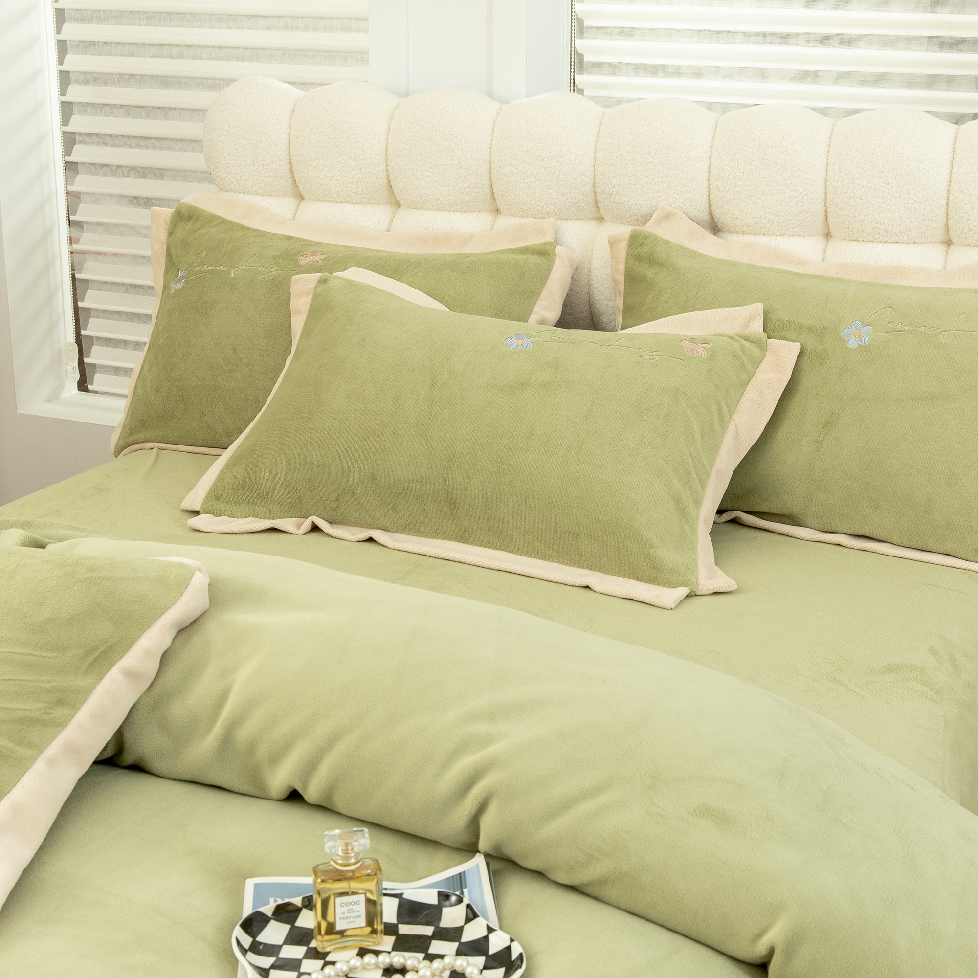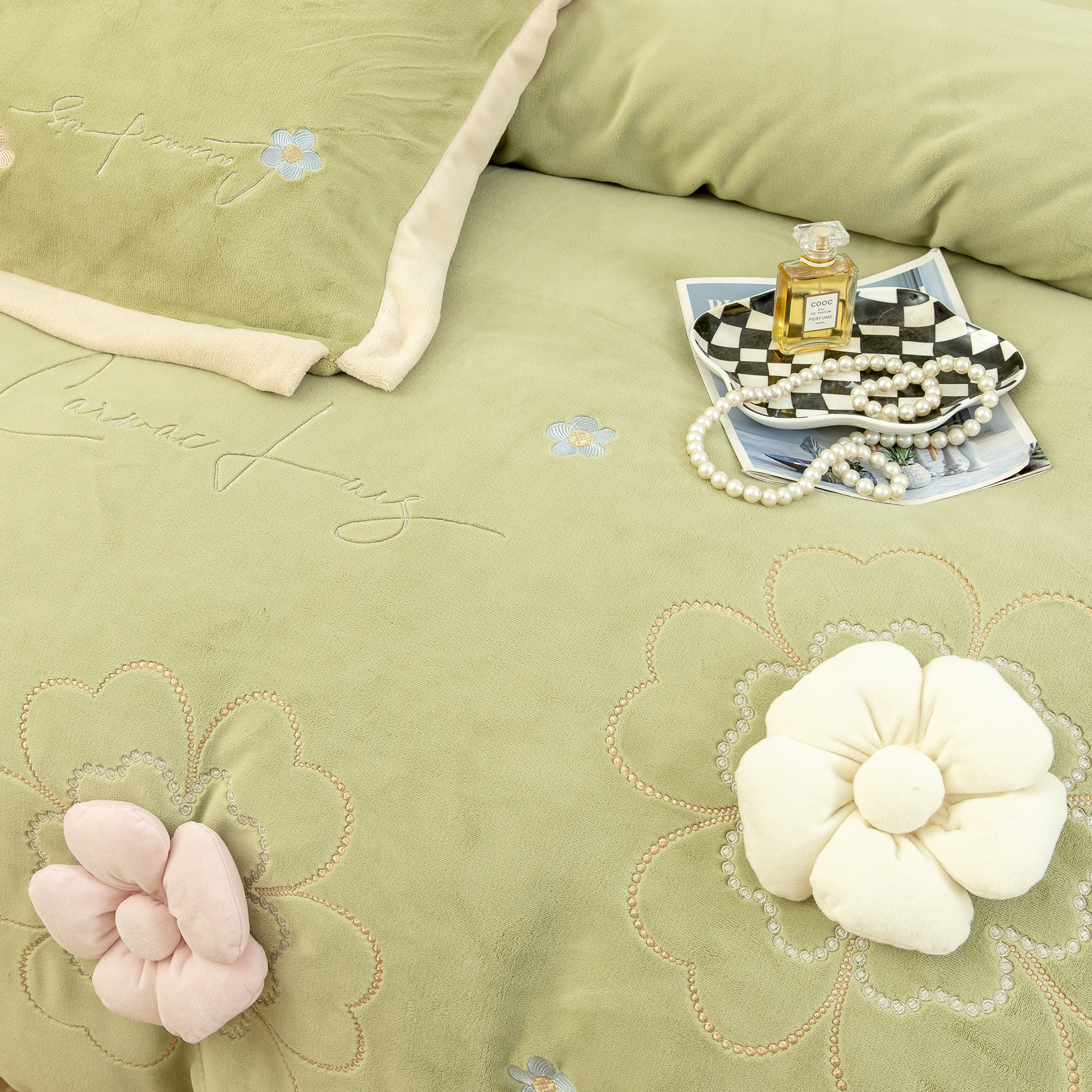 贝尔 2025新款纯色高克重牛奶绒刺绣四件套-羽魅 羽魅-浅绿,羽魅-浅绿