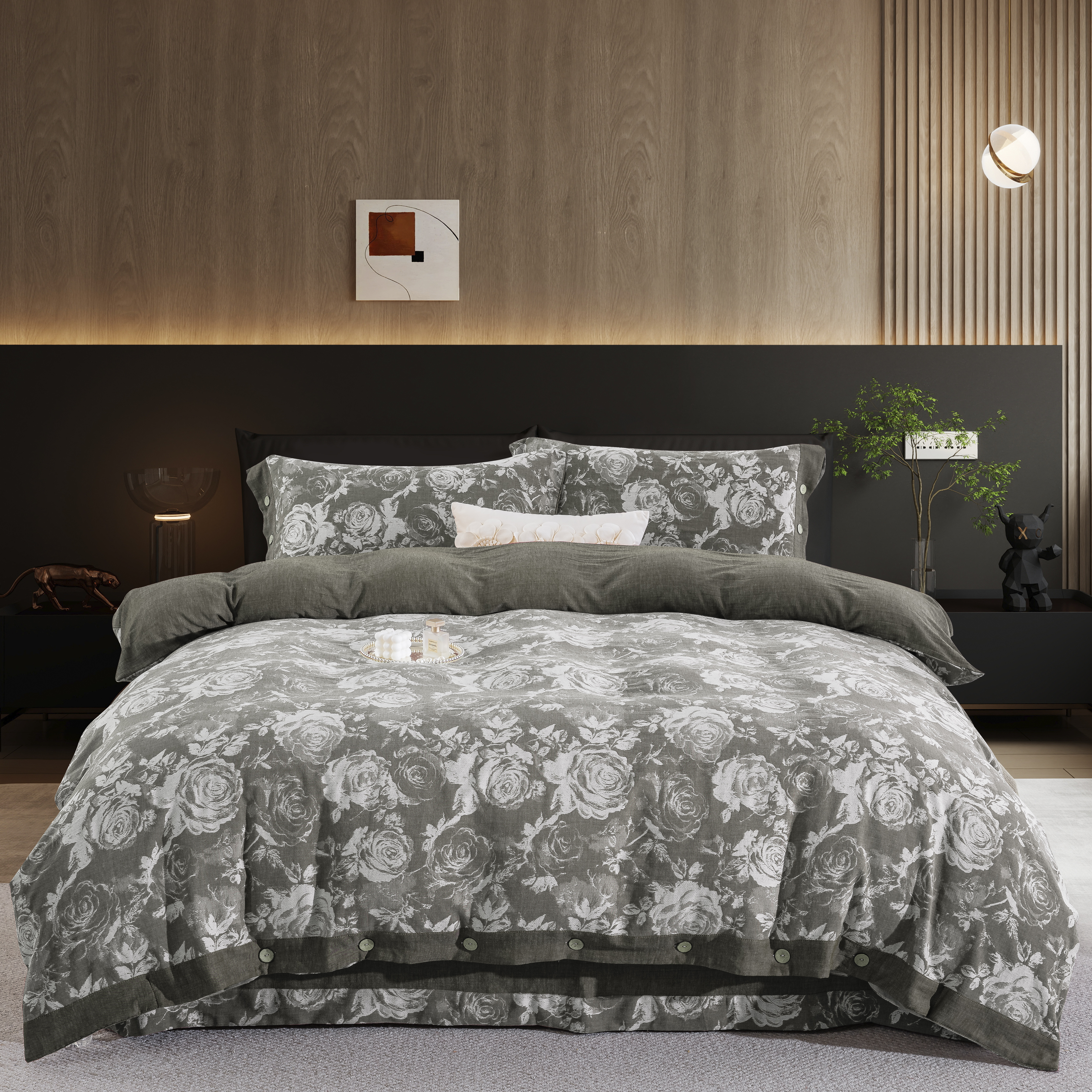 鲁爱家纺供货 2025新款全棉色织提花四件套 玫瑰庄园-绿