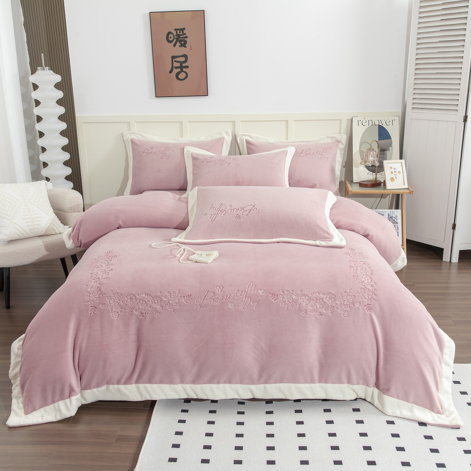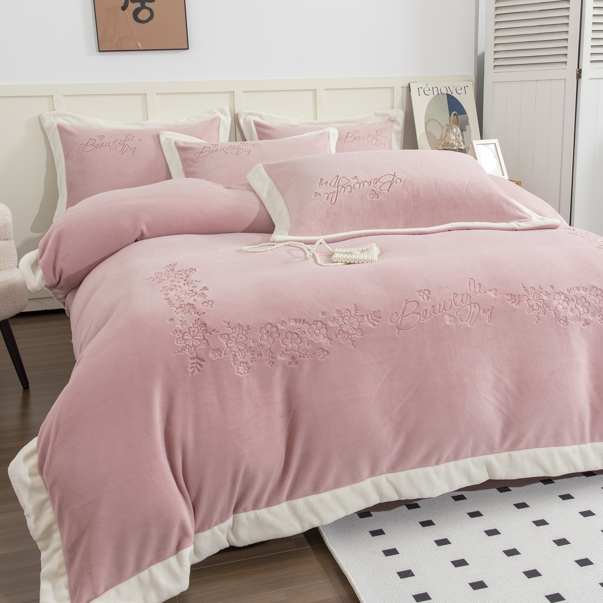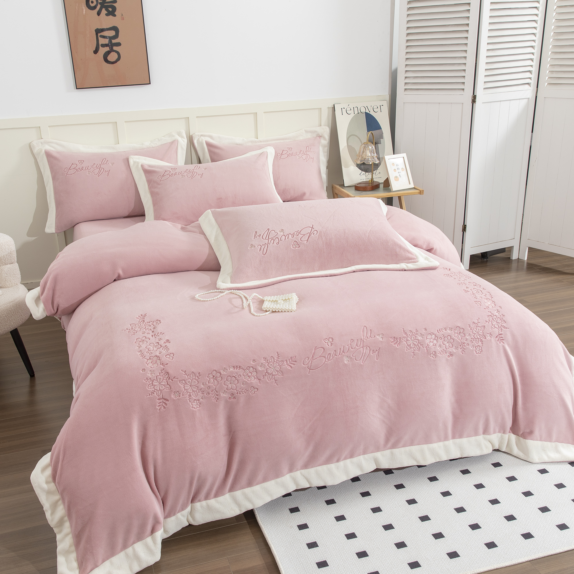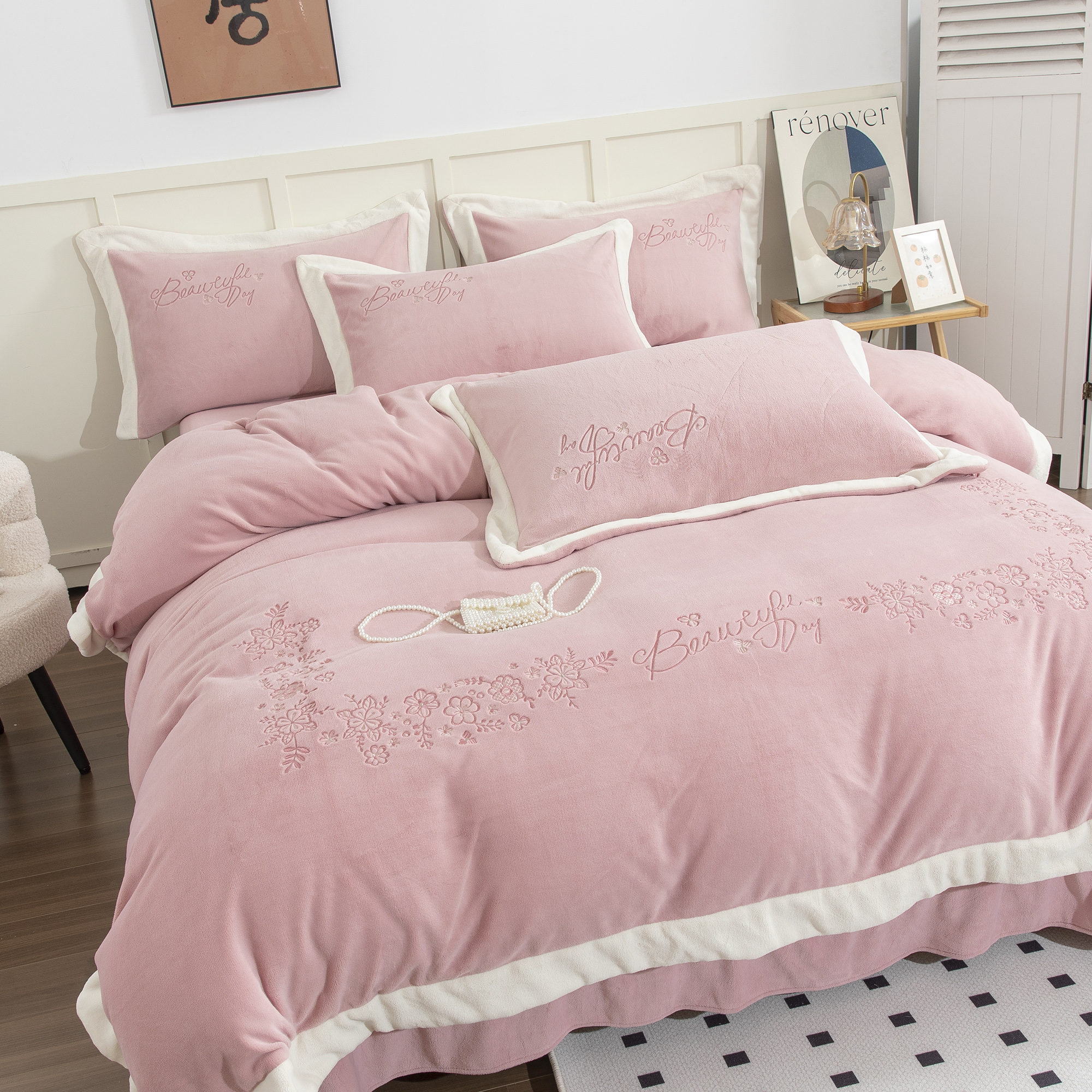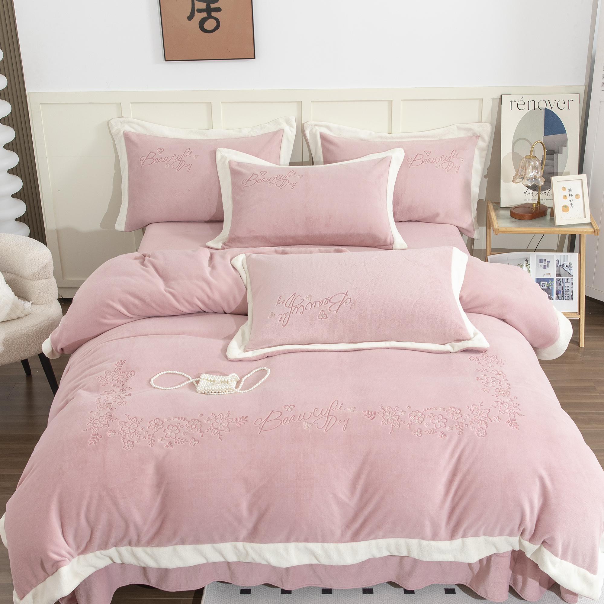 (总)贝尔 2025新款牛奶绒刺绣四件套-花语系列,花语-豆沙,花语-粉色,花语-高级灰,花语-蓝色,花语-浅绿,花语-玉色