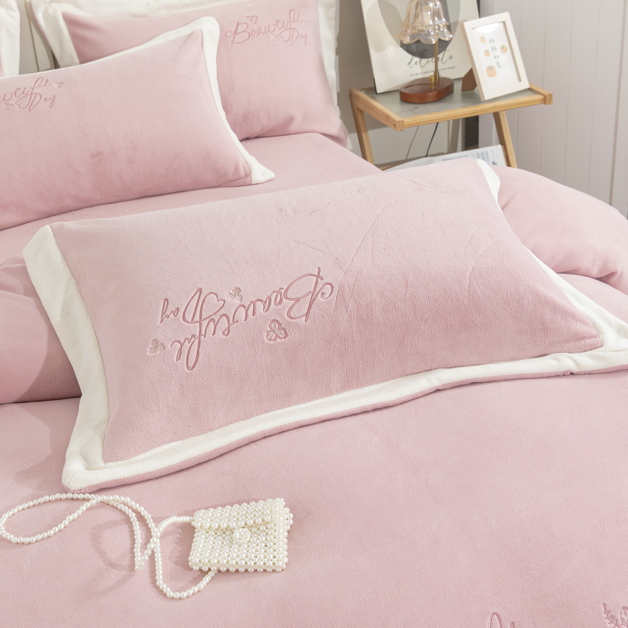 商品名称:贝尔 2025新款青黛-纯色高克重全消光蚕丝绒(赠送拎袋)拼角刺绣四件套 豆沙粉