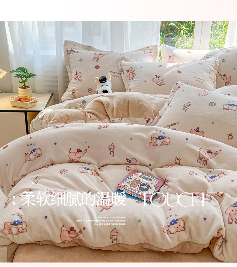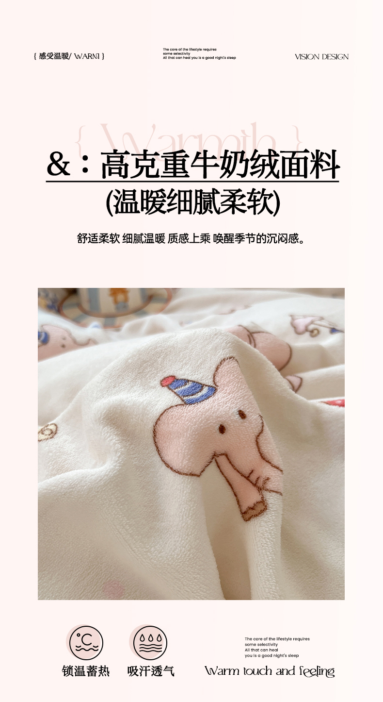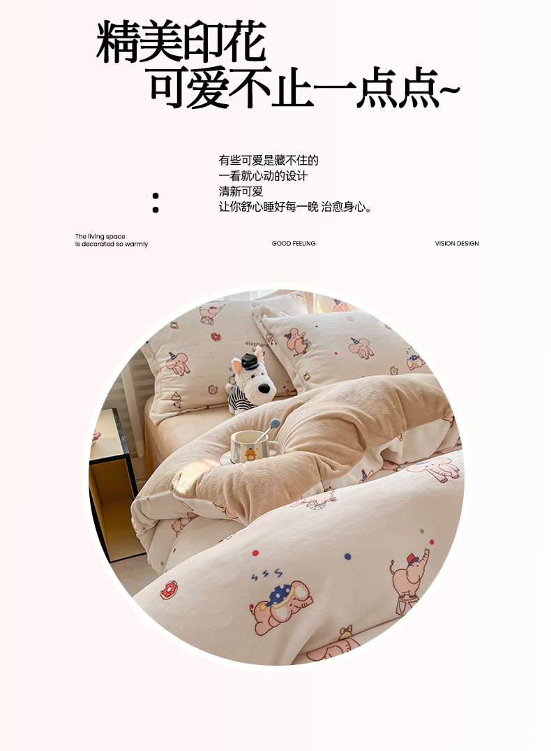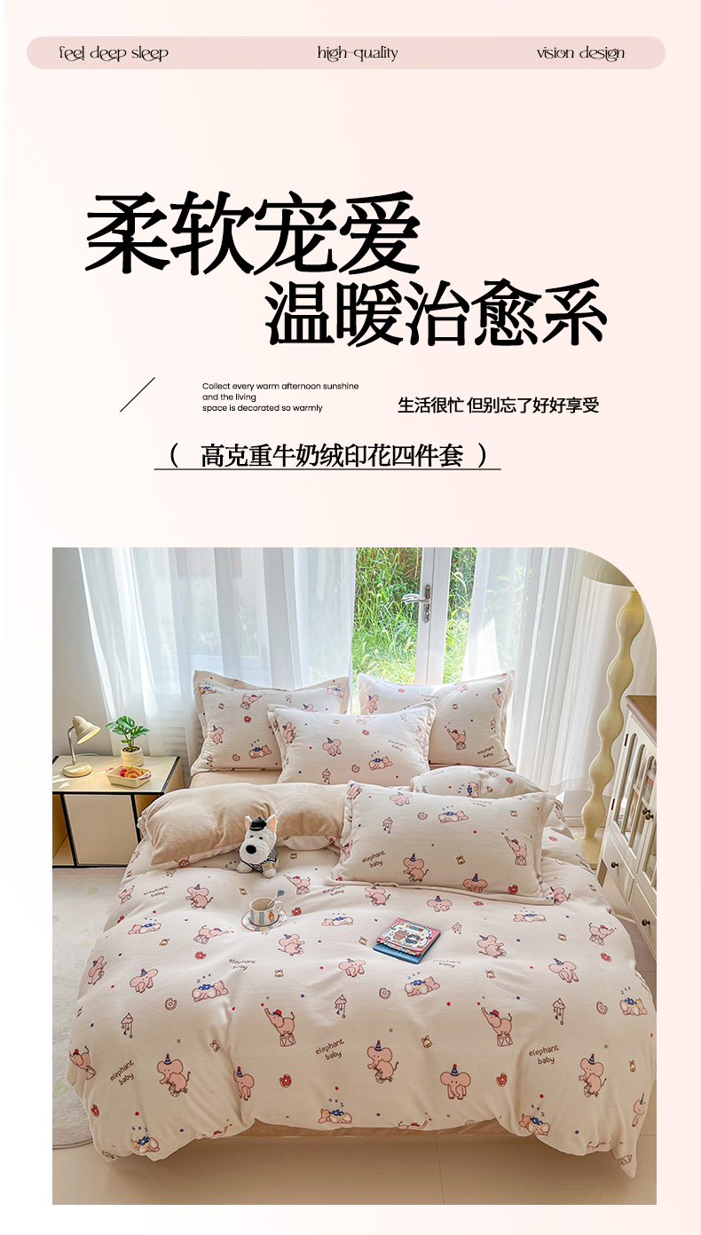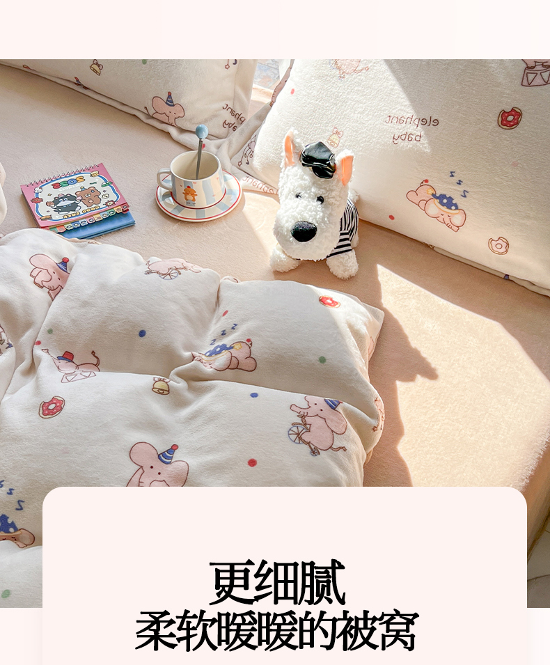 当前位置: 91家纺网 > 商品网购 > 床品套件 > 四件套 > 牛奶绒四件套 > 妖妖家纺 2025新款高克重200克牛奶绒印花四件套 软鼻象宝