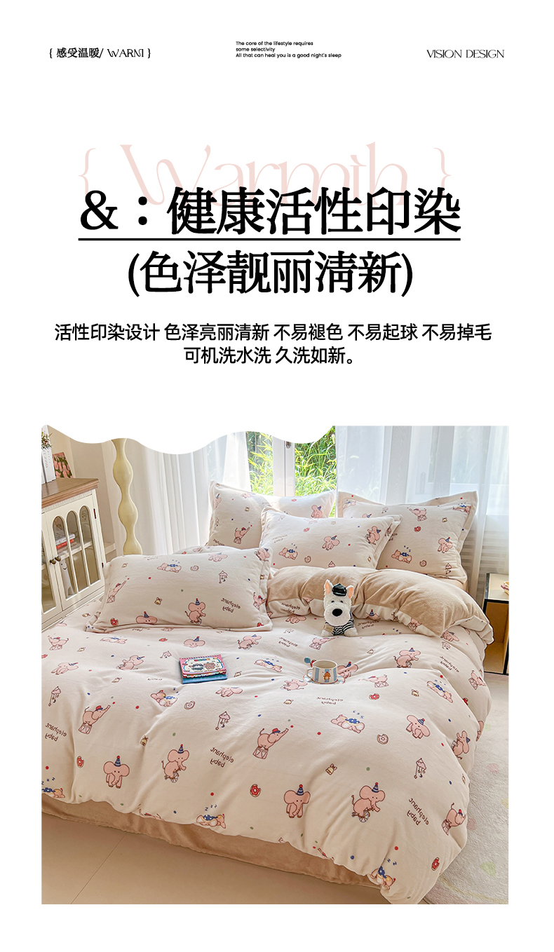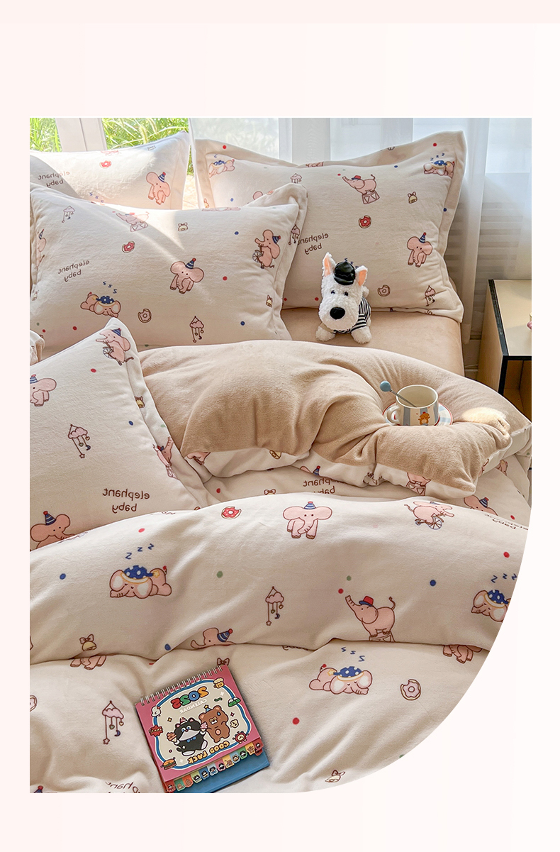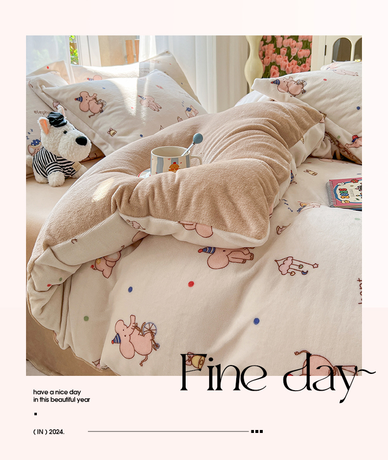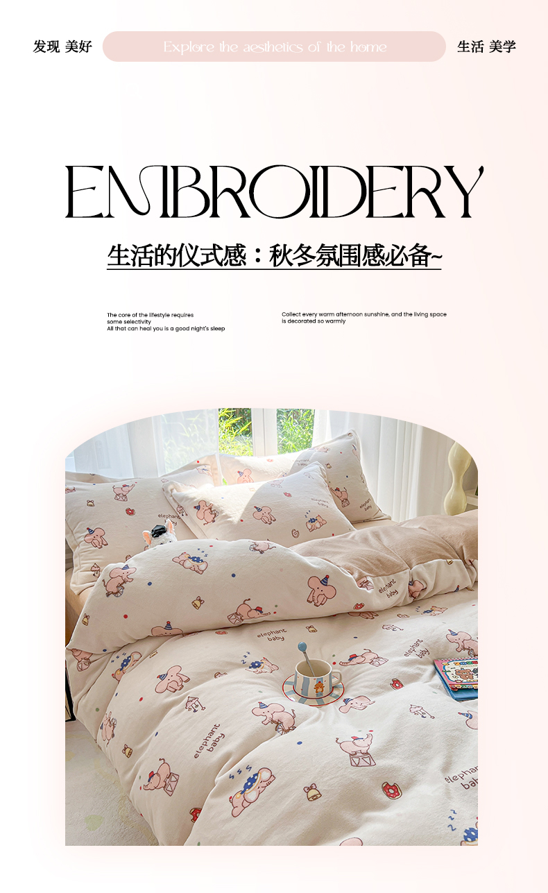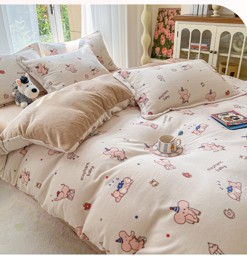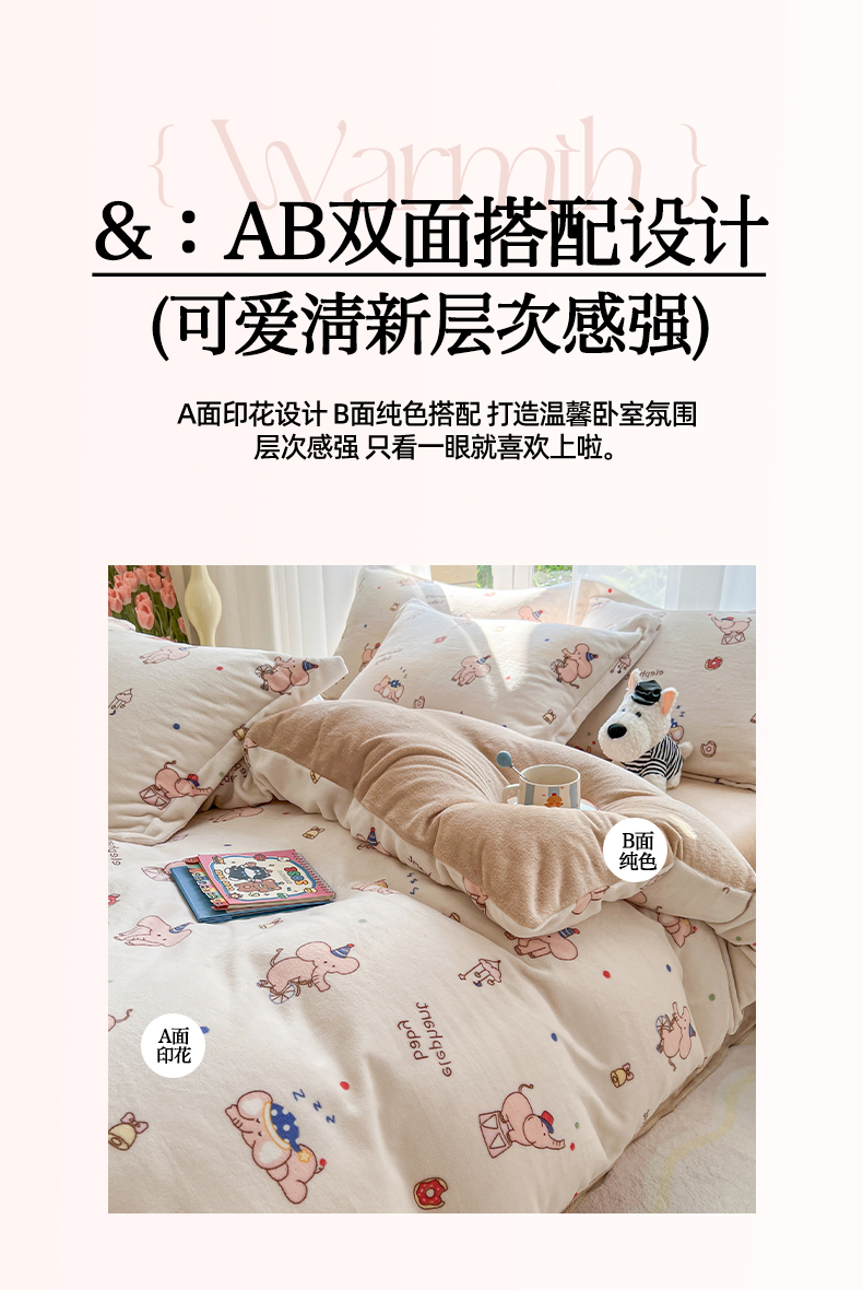 当前位置: 91家纺网 > 商品网购 > 床品套件 > 四件套 > 牛奶绒四件套 > 妖妖家纺 2025新款高克重200克牛奶绒印花四件套 软鼻象宝