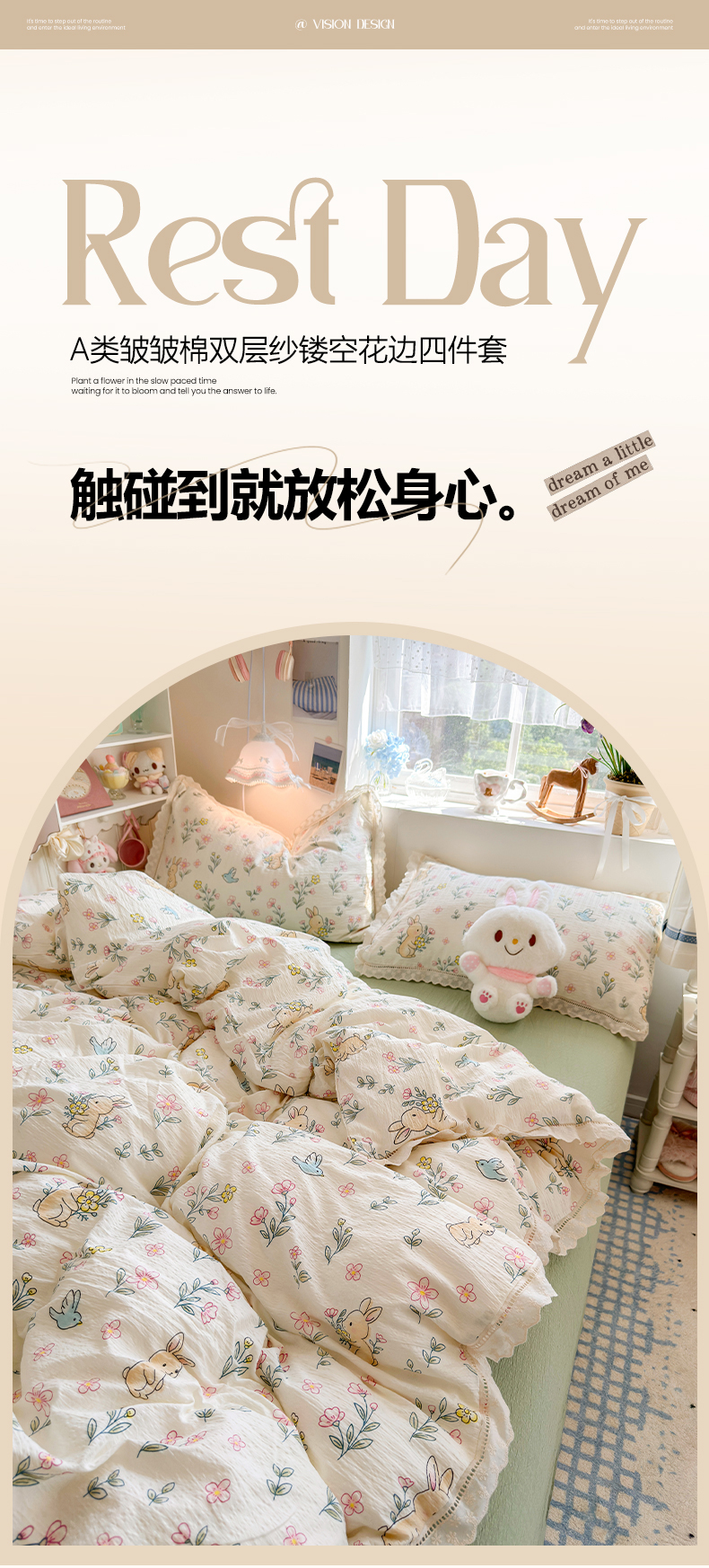 当前位置: 91家纺网 > 商品网购 > 床品套件 > 四件套 > 双层纱四件套 > 优卡迪家纺馆 2025新款A类全棉镂空花边皱皱棉双层纱四件套 好伙伴