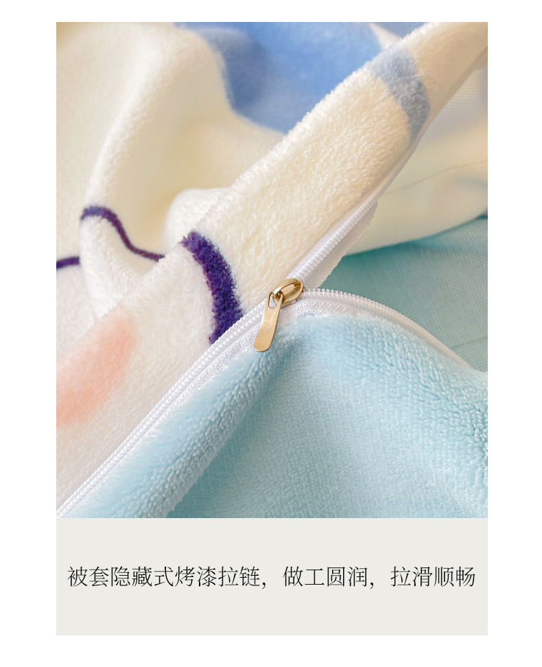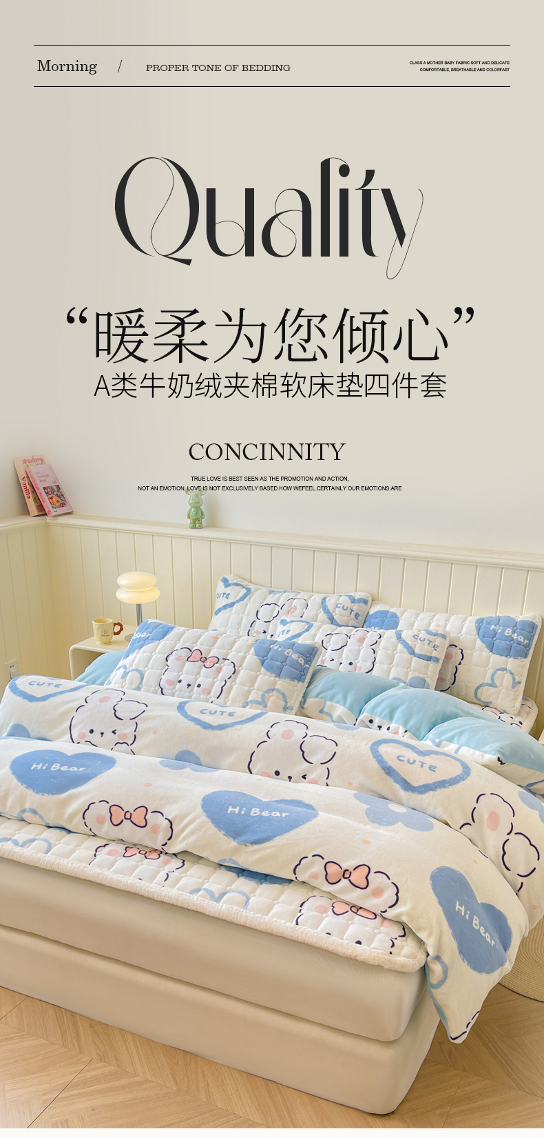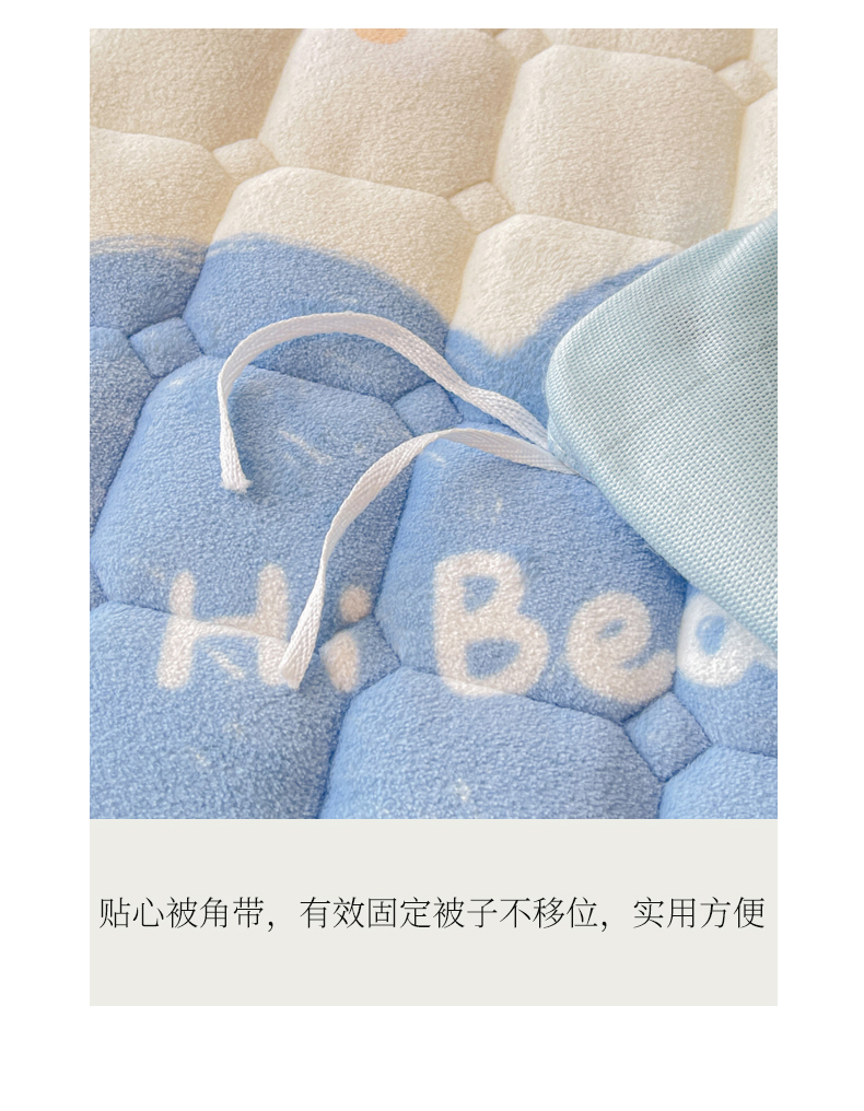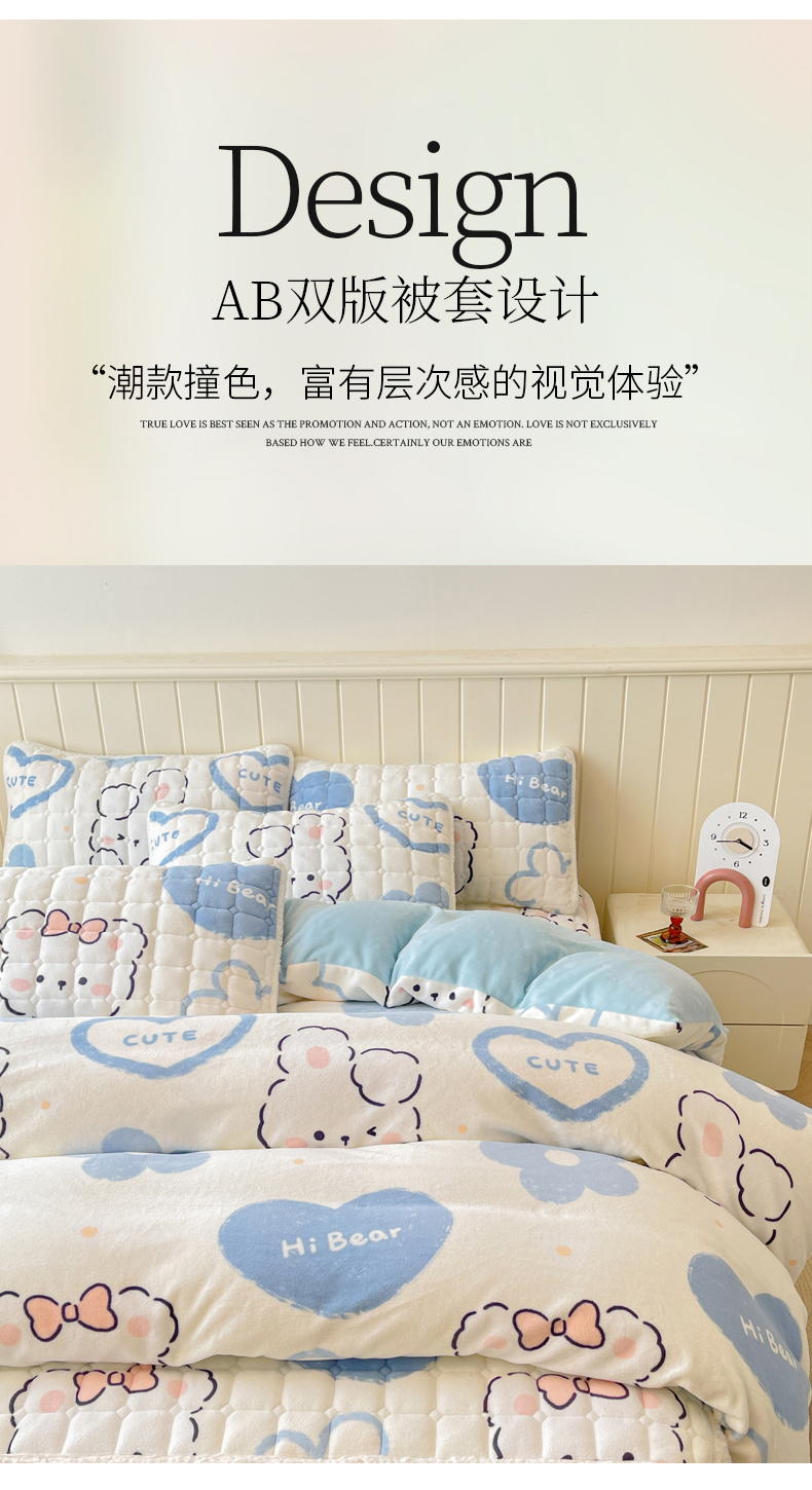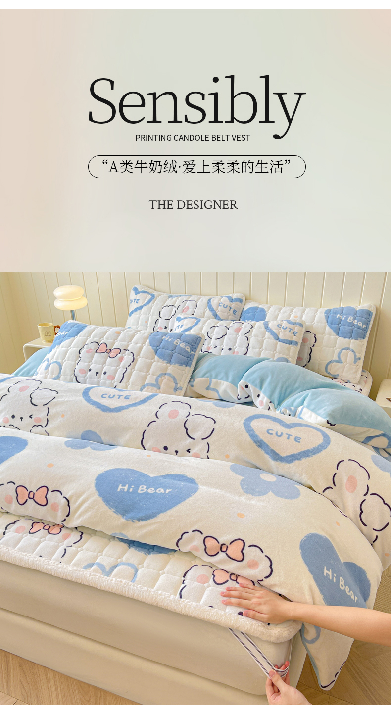商品名称:LIFE.丽芙 2025秋冬新款A类牛奶绒加厚夹棉床褥垫+被套组合四件套 爱心小宠-蓝