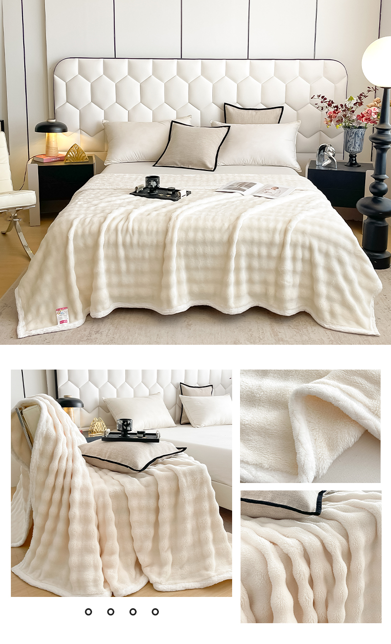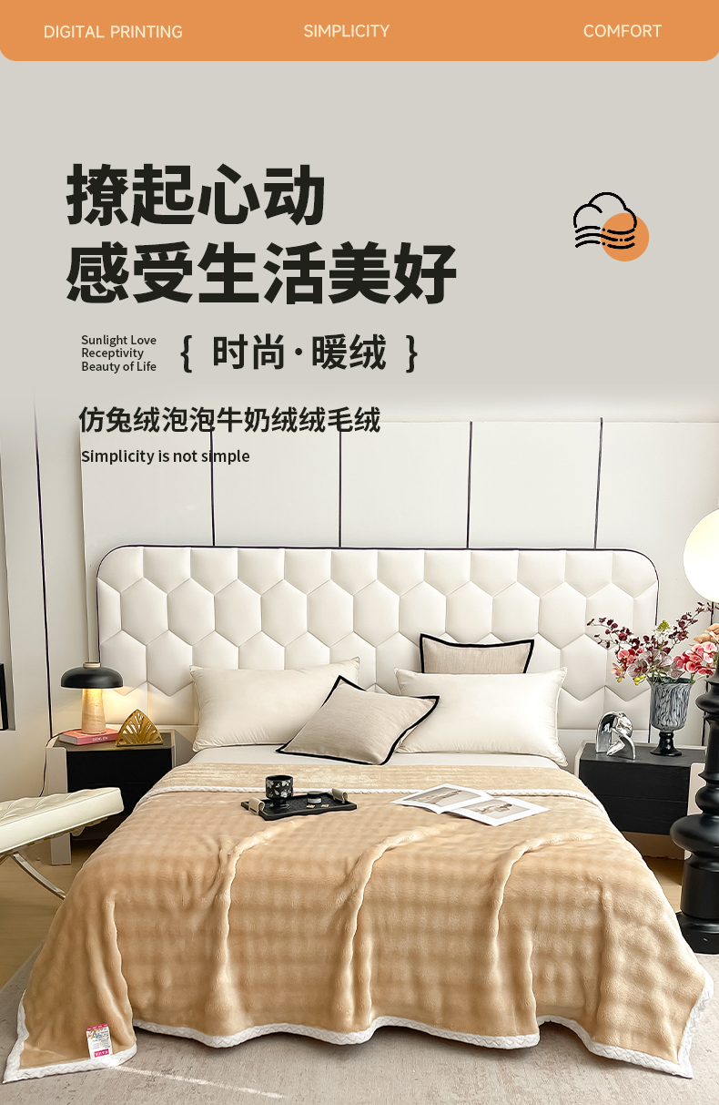 商品名称:梵克保罗 2025新款仿兔毛泡泡绒牛奶绒毛毯盖毯包边毛毯 驼色