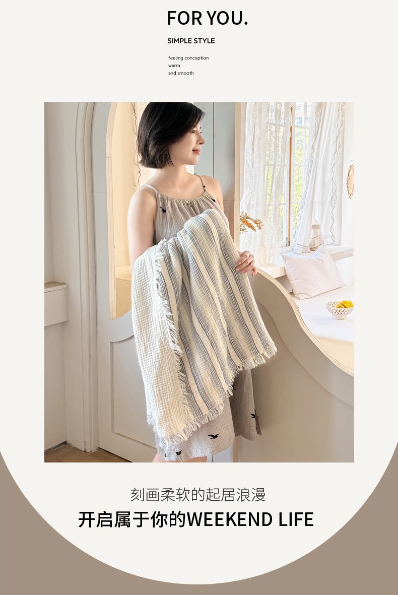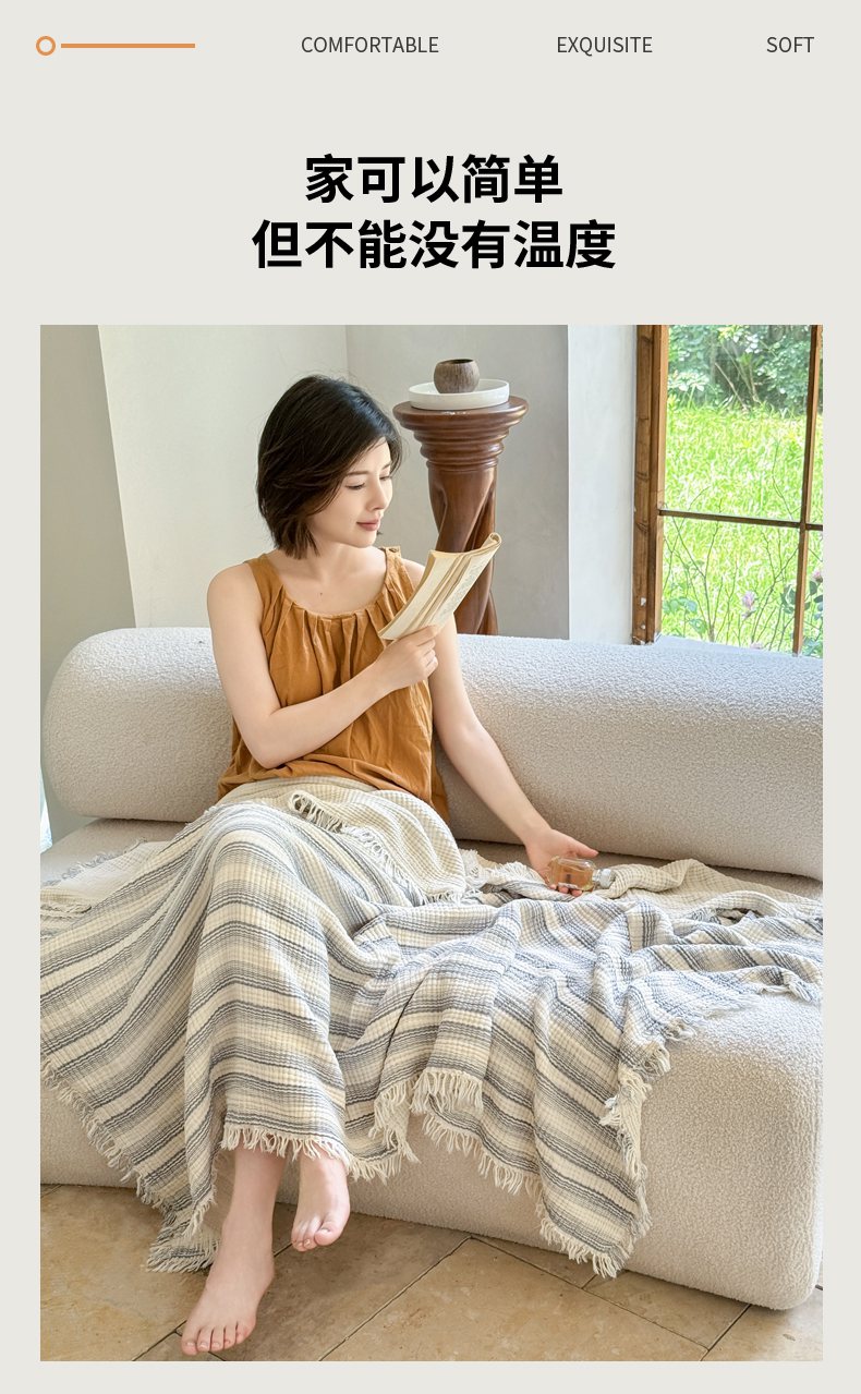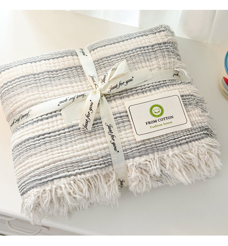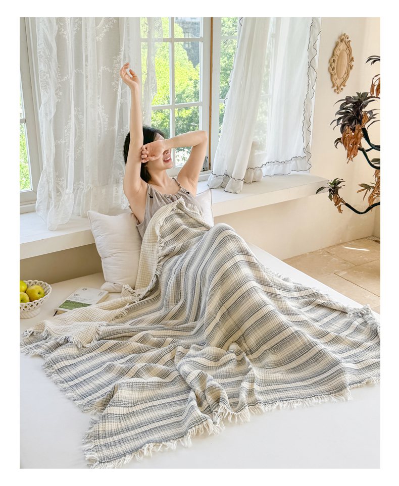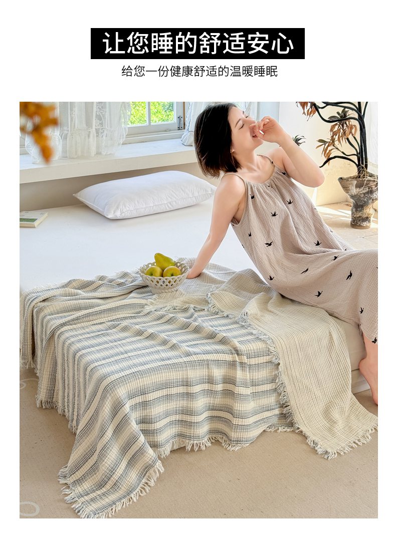 商品名称:梵克保罗 2025新款双层纱流苏全棉纯棉毯纯棉流苏款盖毯毯子夏被夏凉被空调被 条纹蓝