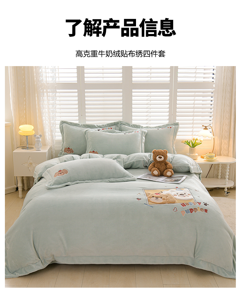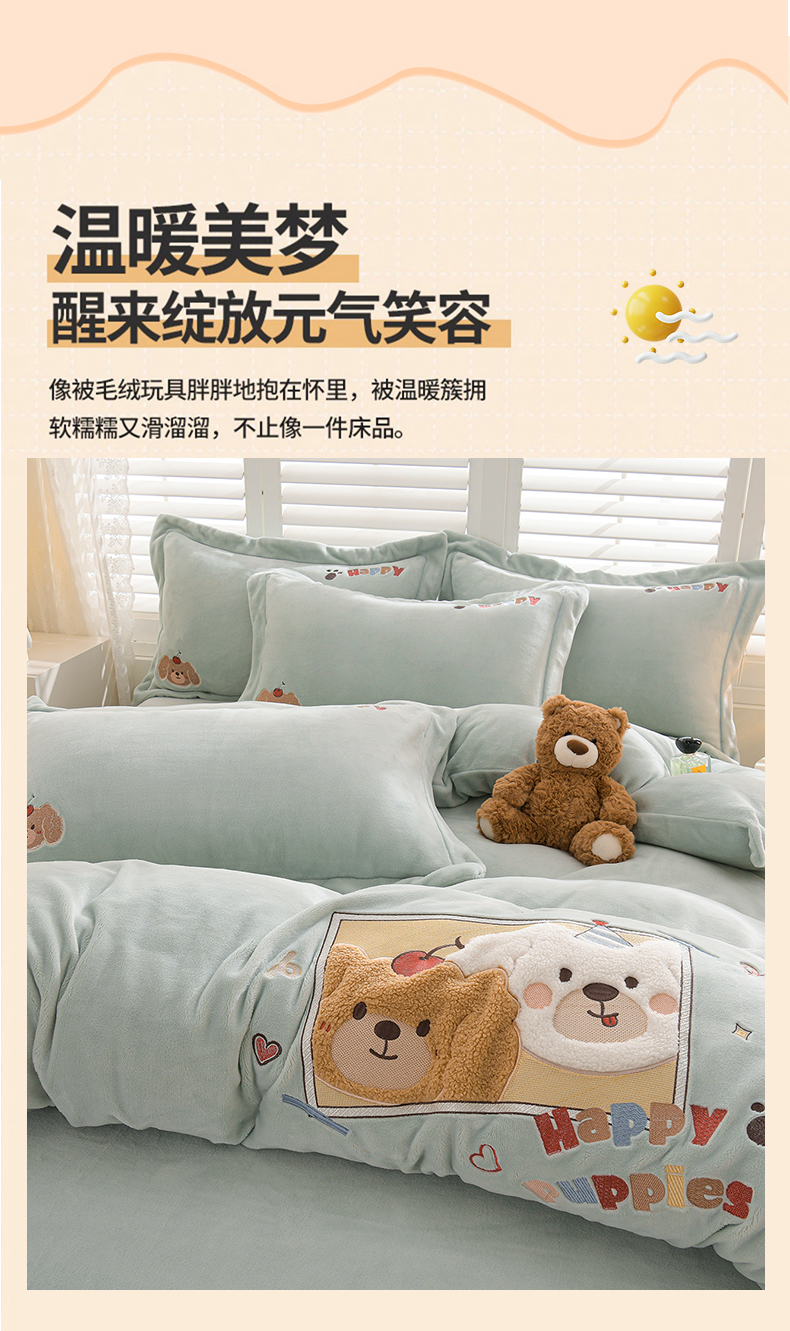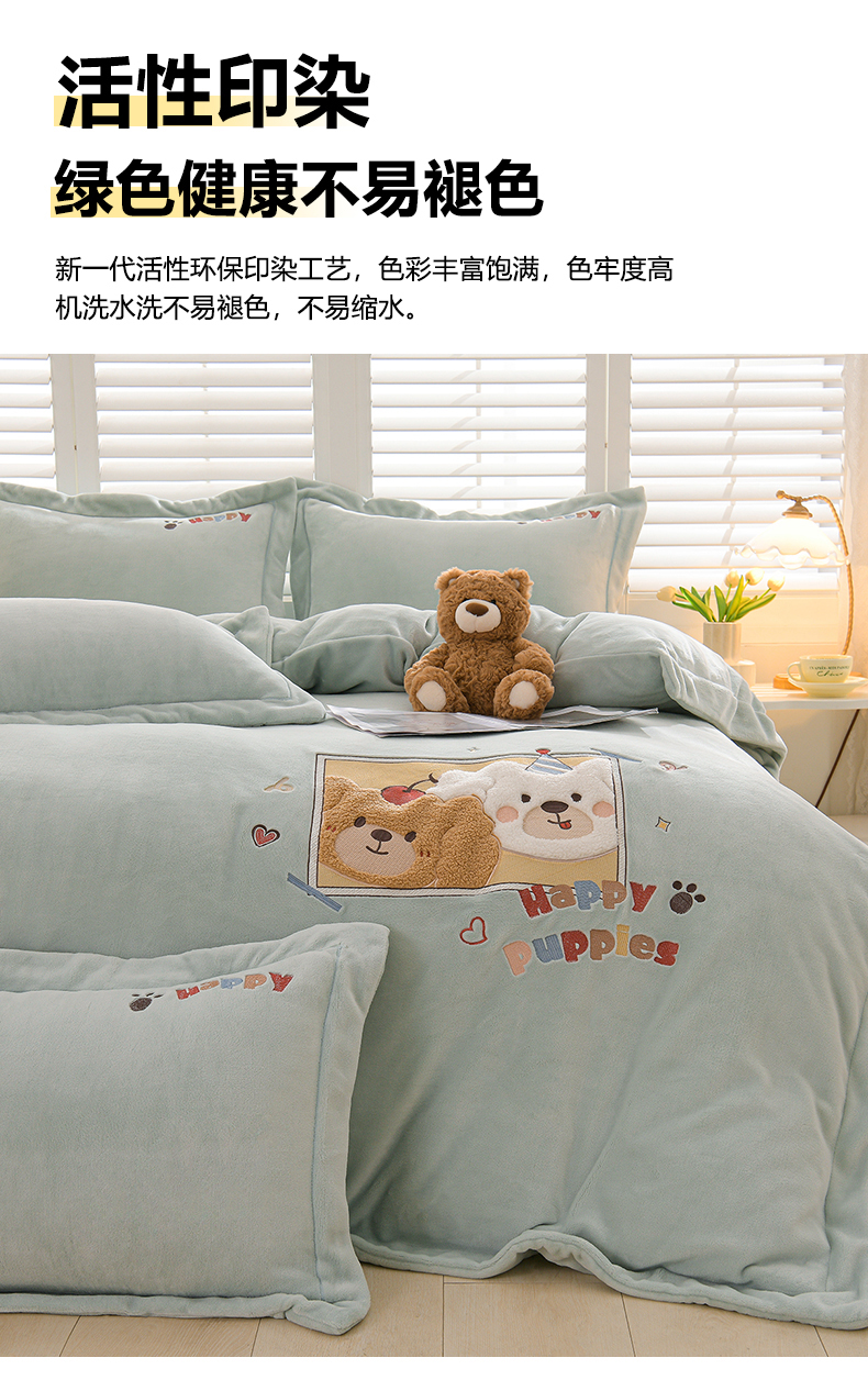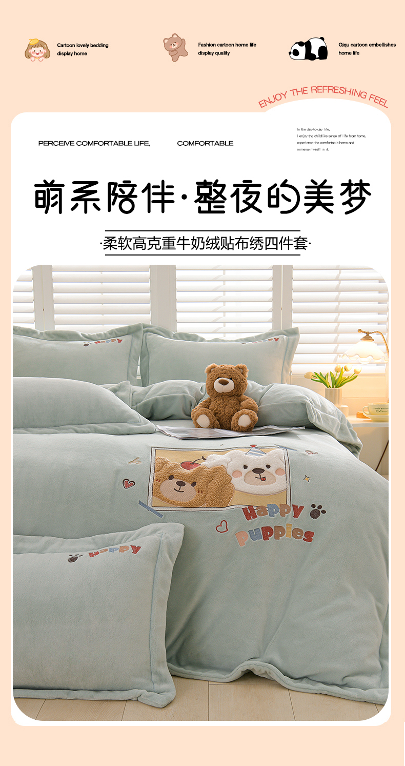当前位置: 91家纺网 > 商品网购 > 床品套件 > 四件套 > 牛奶绒四件套 > 金昱纺 2025新款230克柔软高克重牛奶绒贴布绣四件套 可爱联盟-浅蓝绿