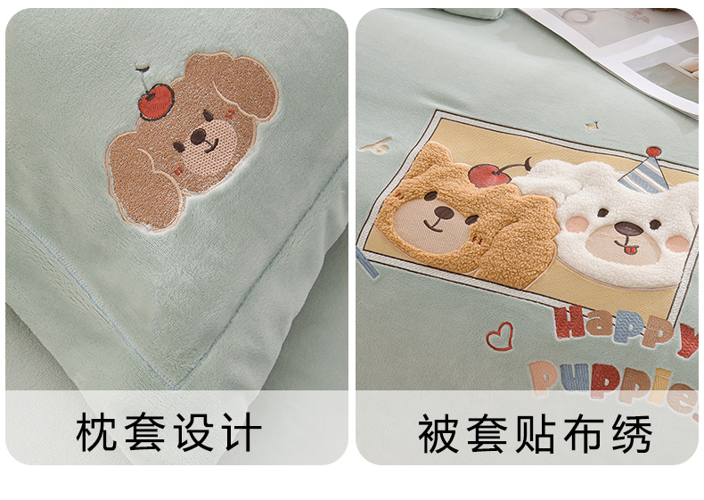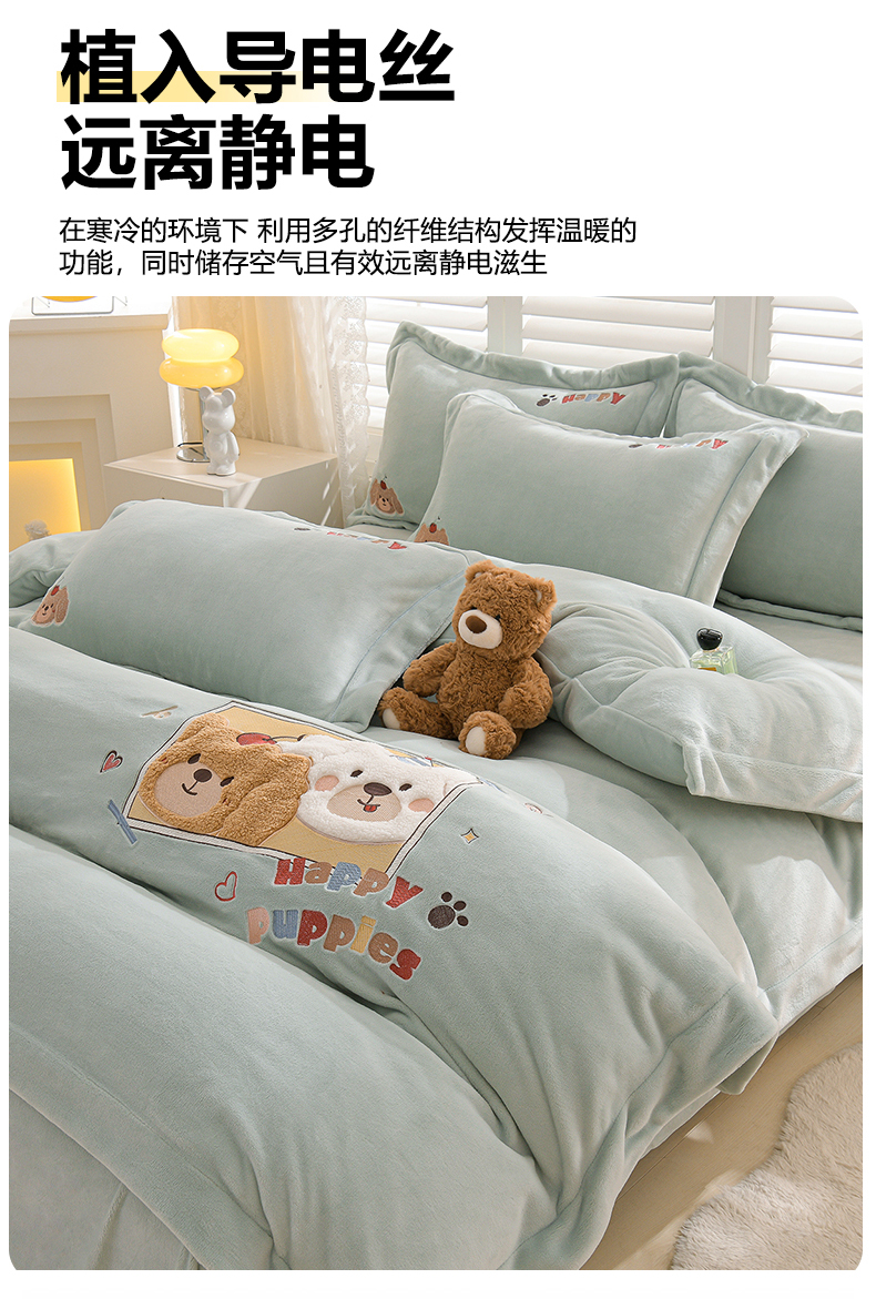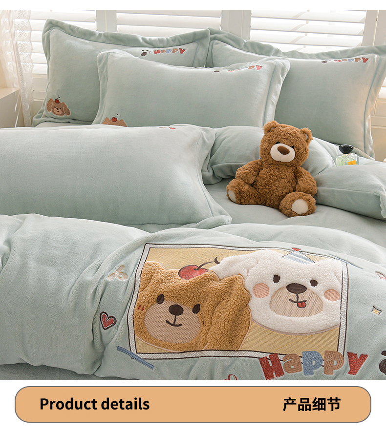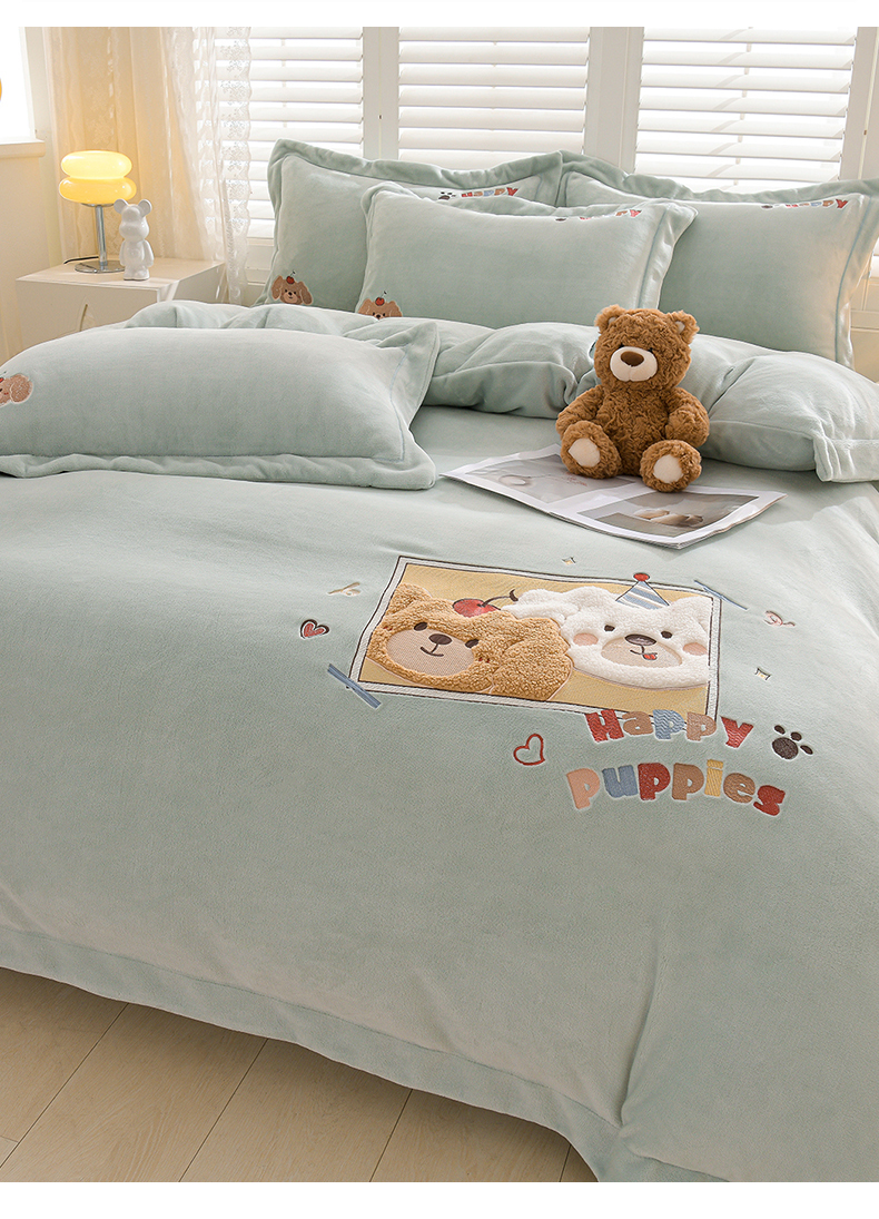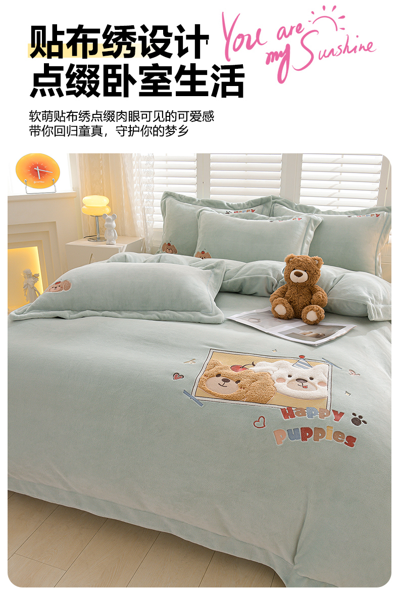 当前位置: 91家纺网 > 商品网购 > 床品套件 > 四件套 > 牛奶绒四件套 > 金昱纺 2025新款230克柔软高克重牛奶绒贴布绣四件套 可爱联盟-浅蓝绿