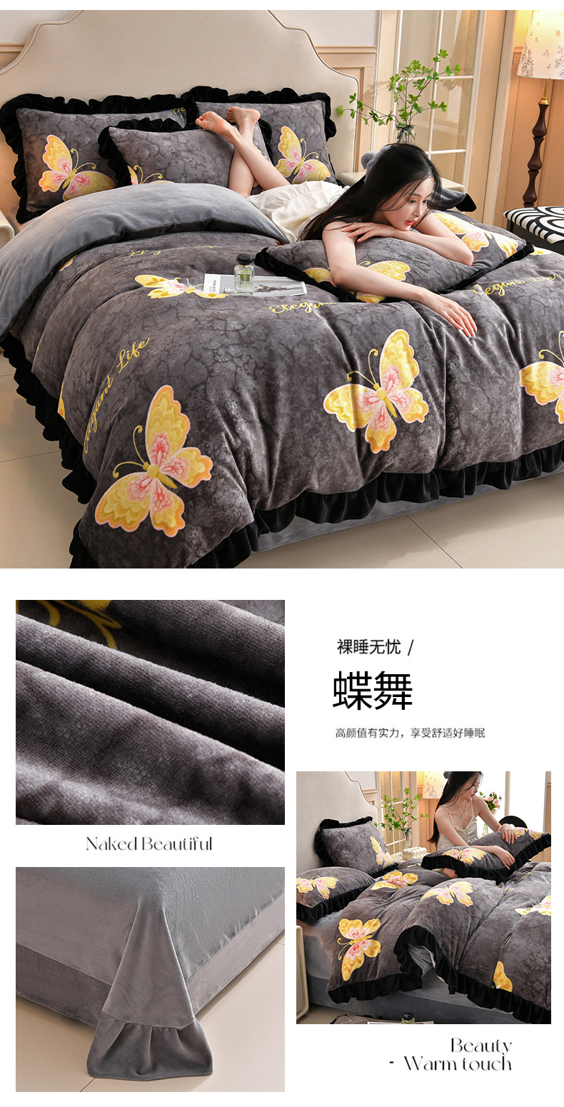 商品名称:曼尼 2025新款韩版花边牛奶绒四件套 韩版-蝶舞