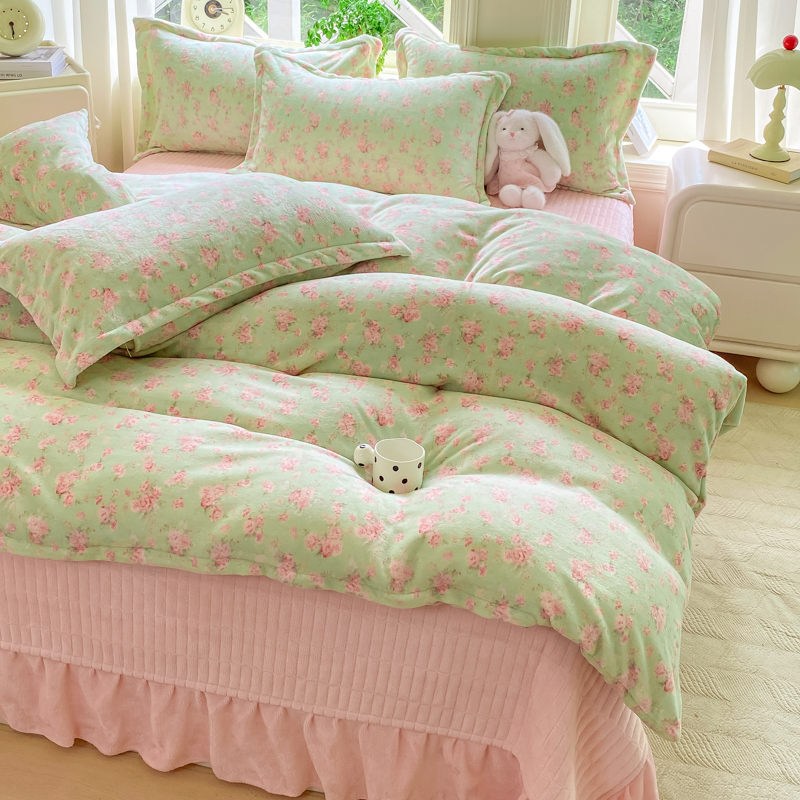 商品名称:梦可莱家居 2025冬新款牛奶绒加厚保暖花边床盖四件套系列简单款 爱心字母