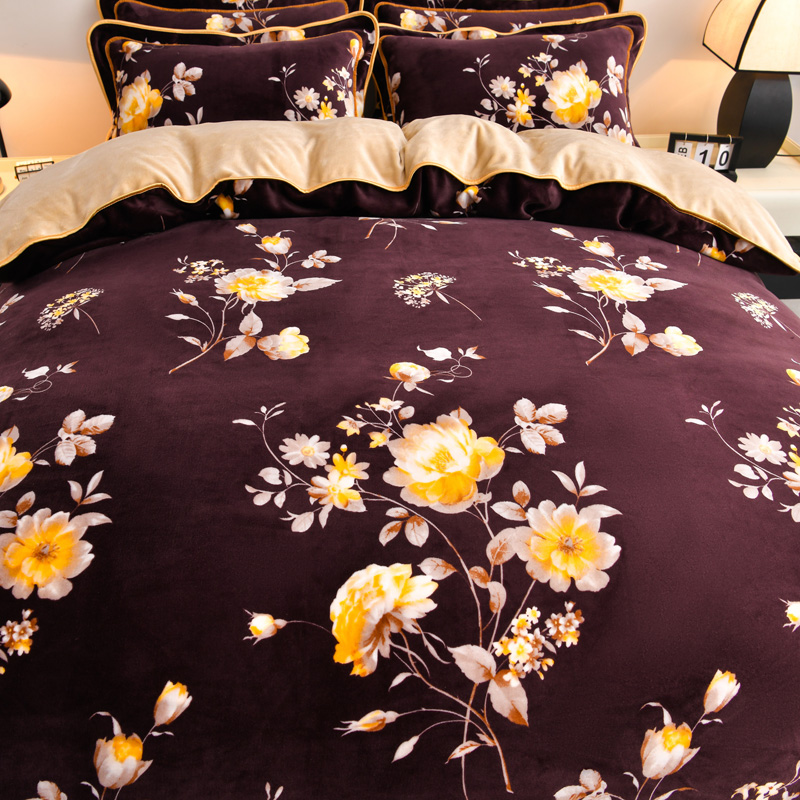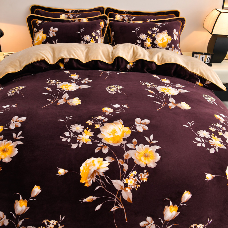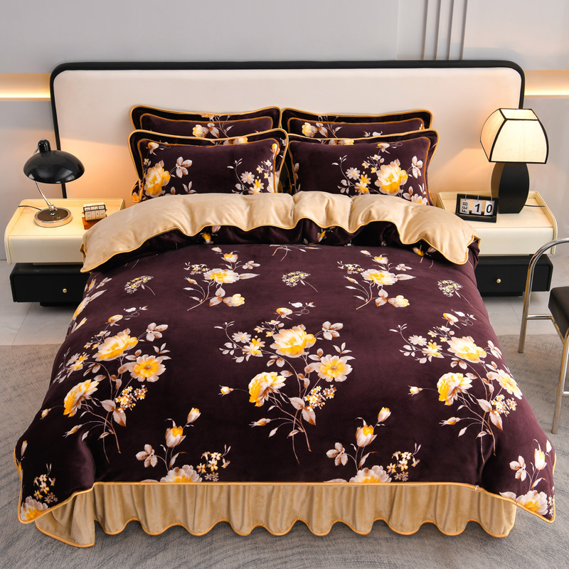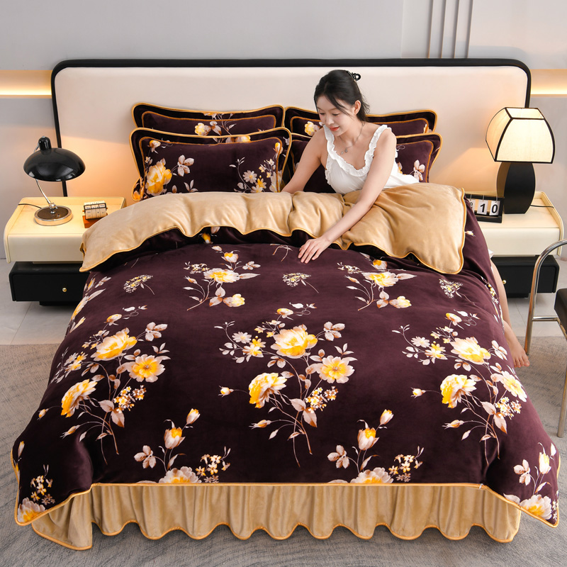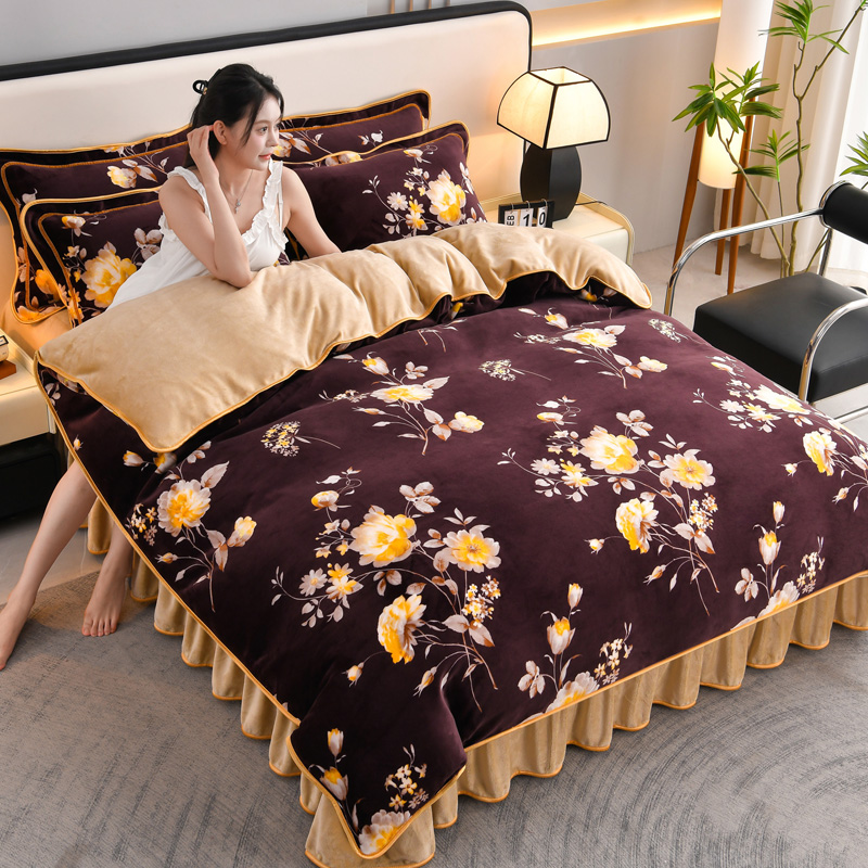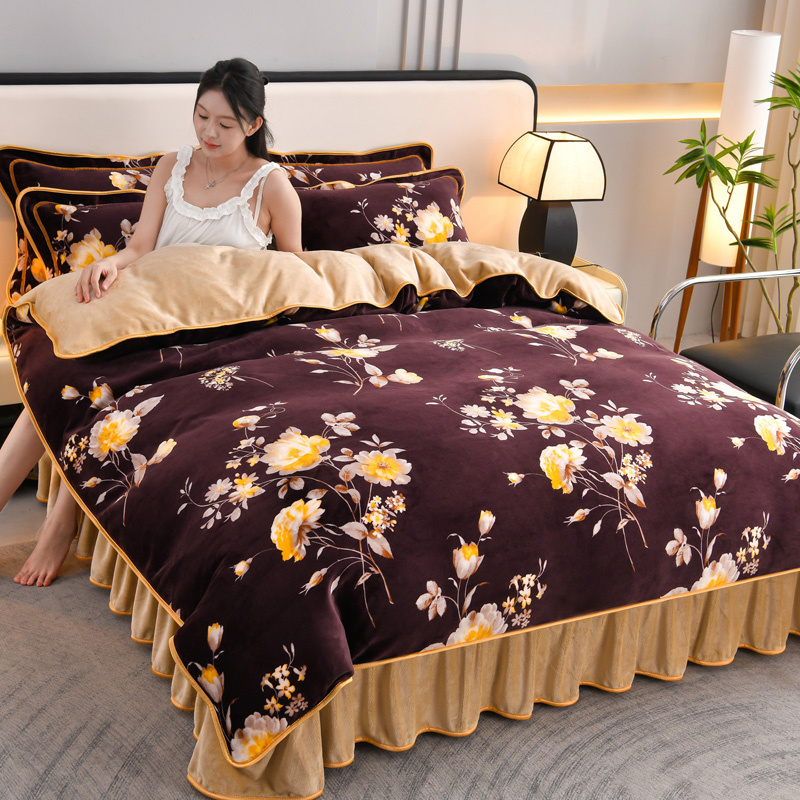 妮恒美 2025新款牛奶绒印花床裙款四件套法莱绒四件套珊瑚金貂绒四件套 梦境花开