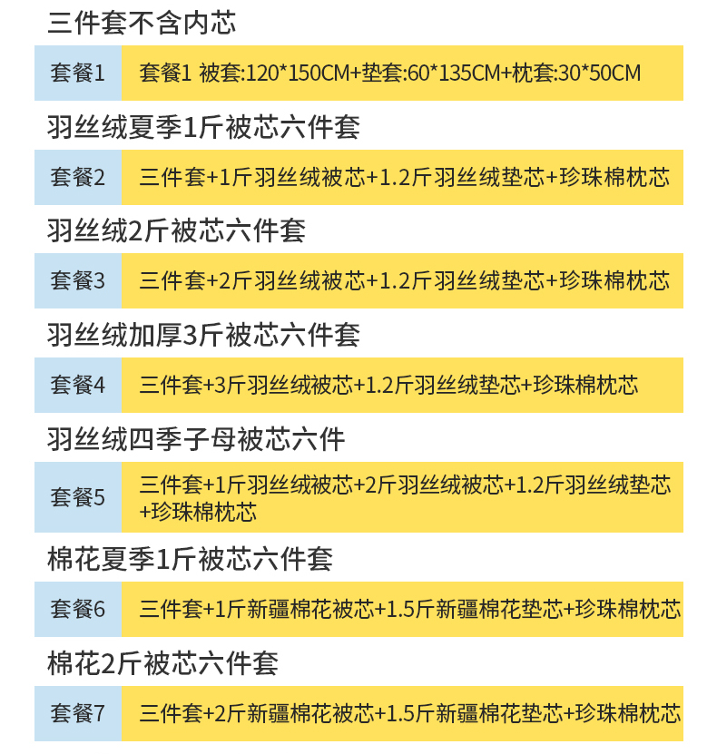 三件套不含芯 (被套+垫套+枕 套) | ¥50.00 |