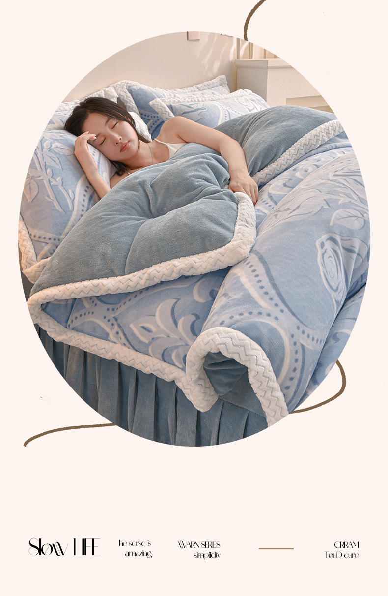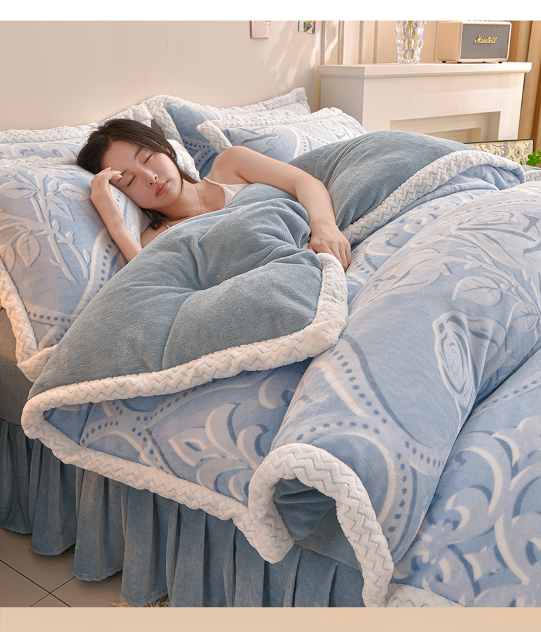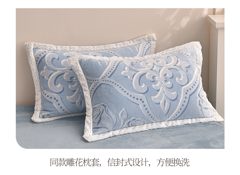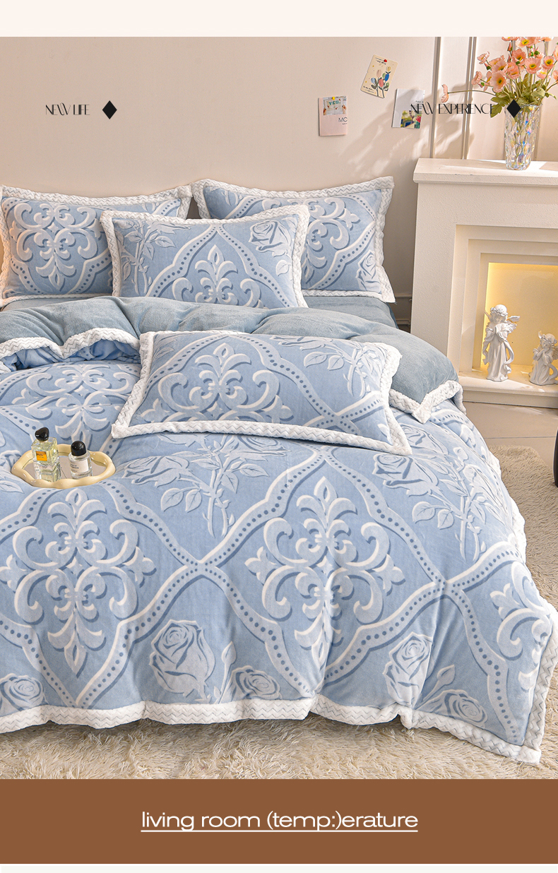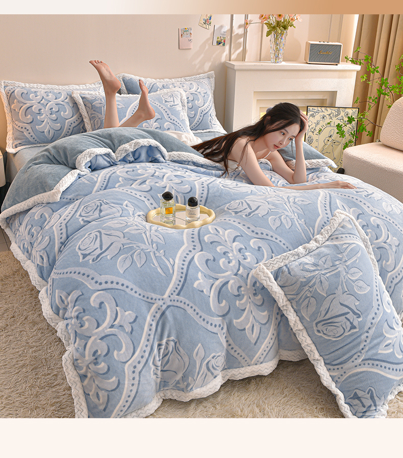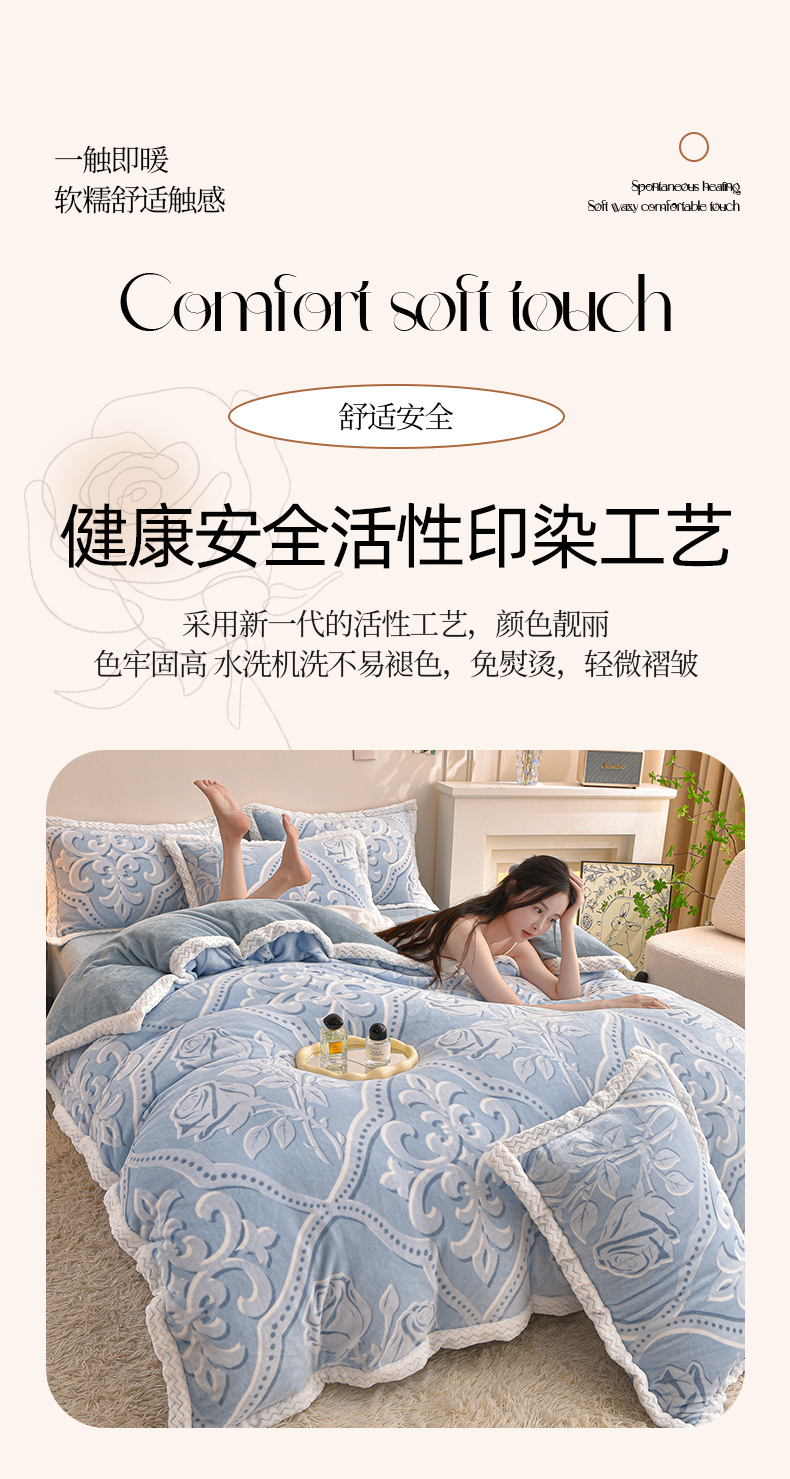 商品名称:董成龙家纺 2025新款直播爆款牛奶绒四件套雕花压线款法莱绒四件套11 欧雅-兰