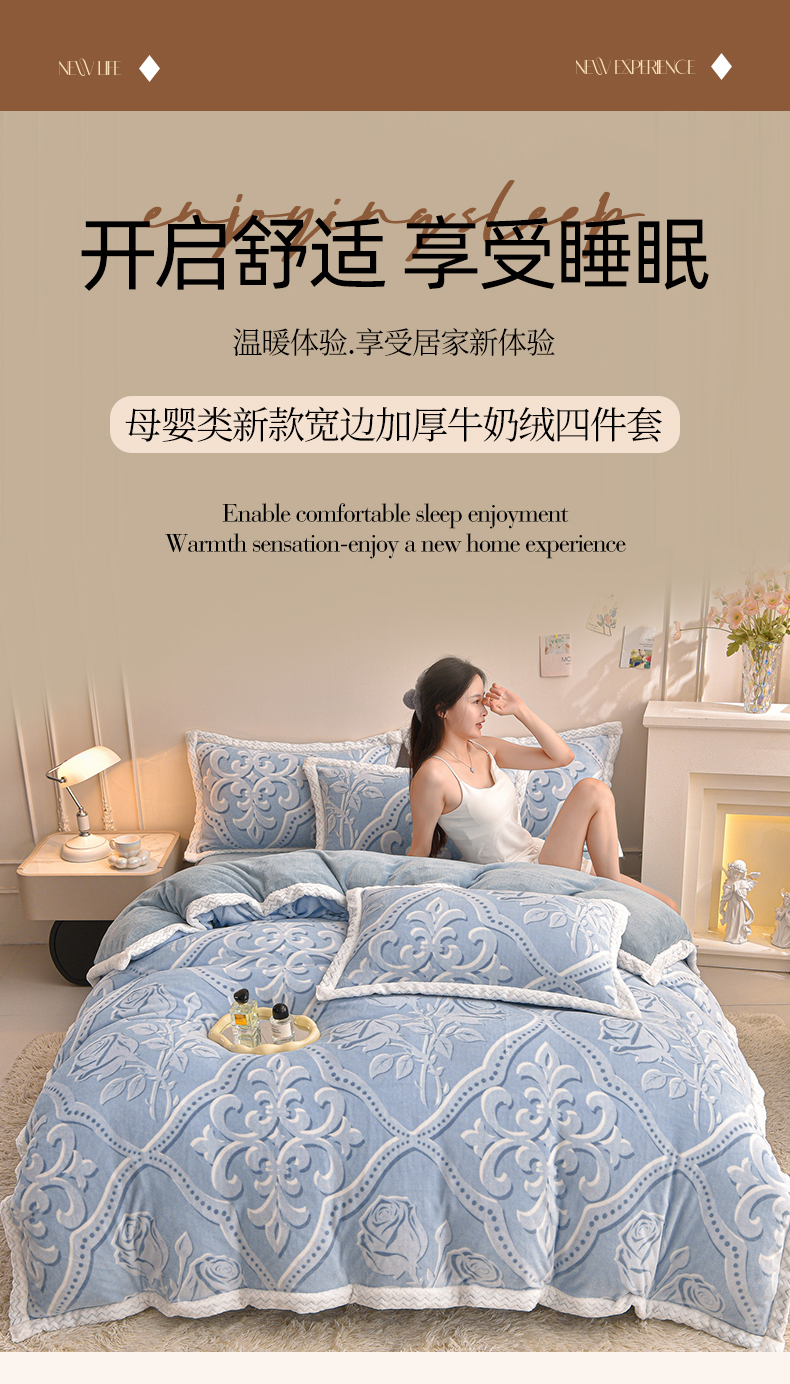 董成龙家纺 2025新款直播爆款牛奶绒四件套雕花压线款法莱绒四件套11 欧雅-兰