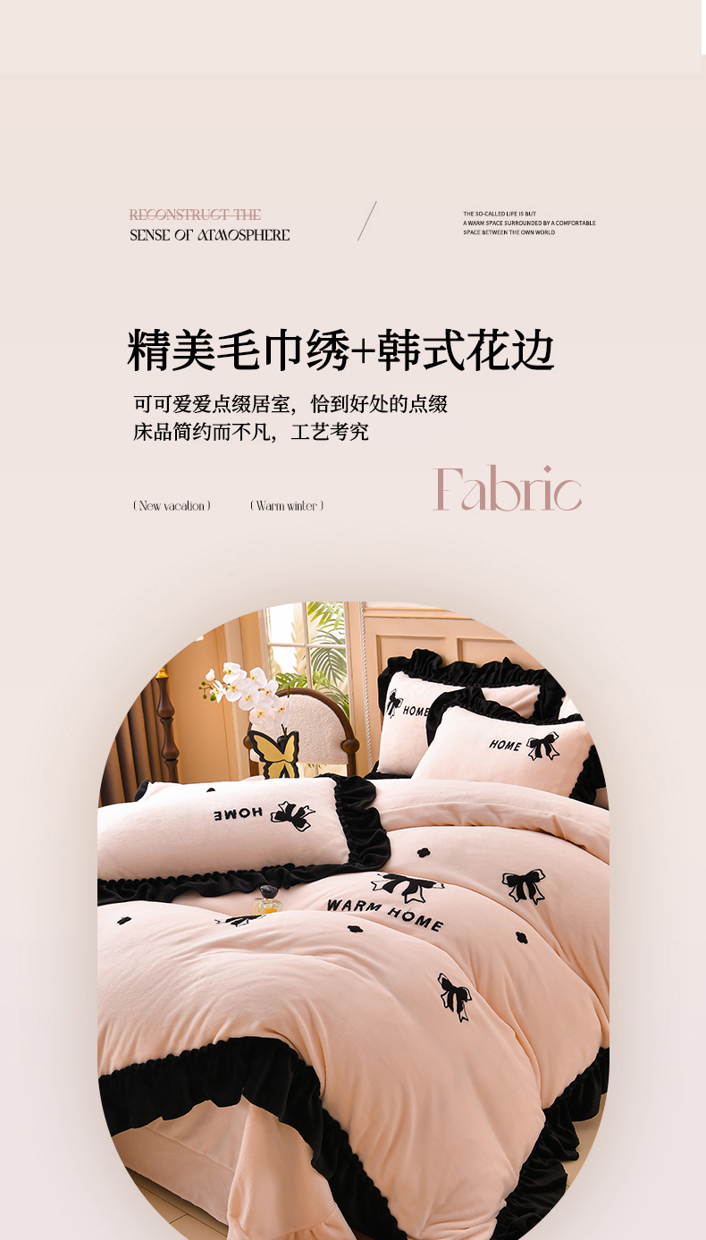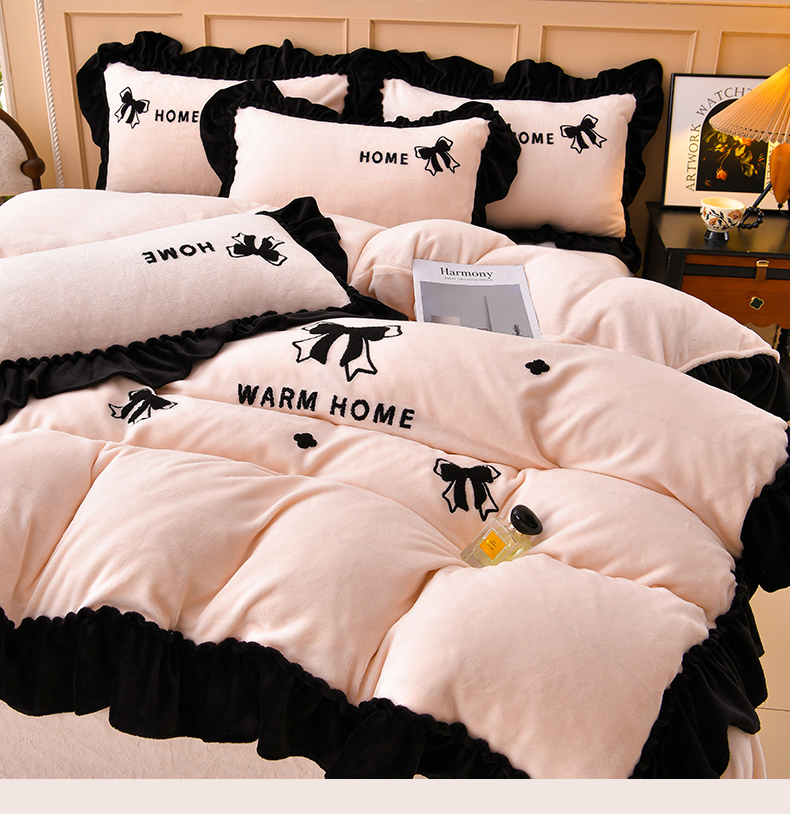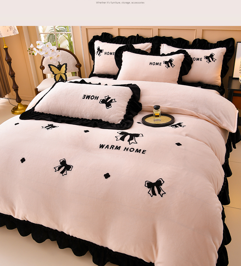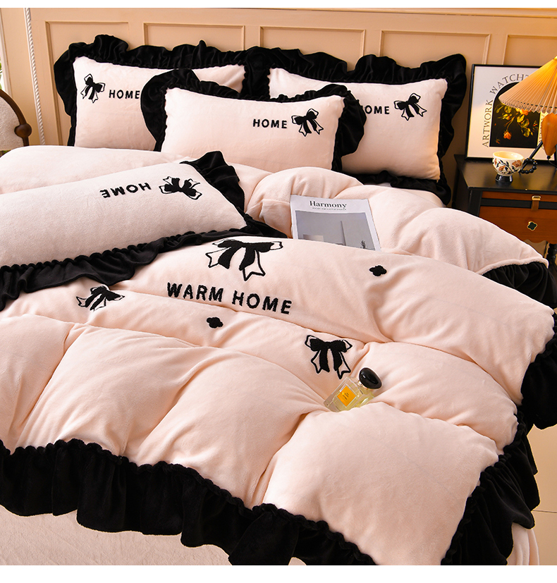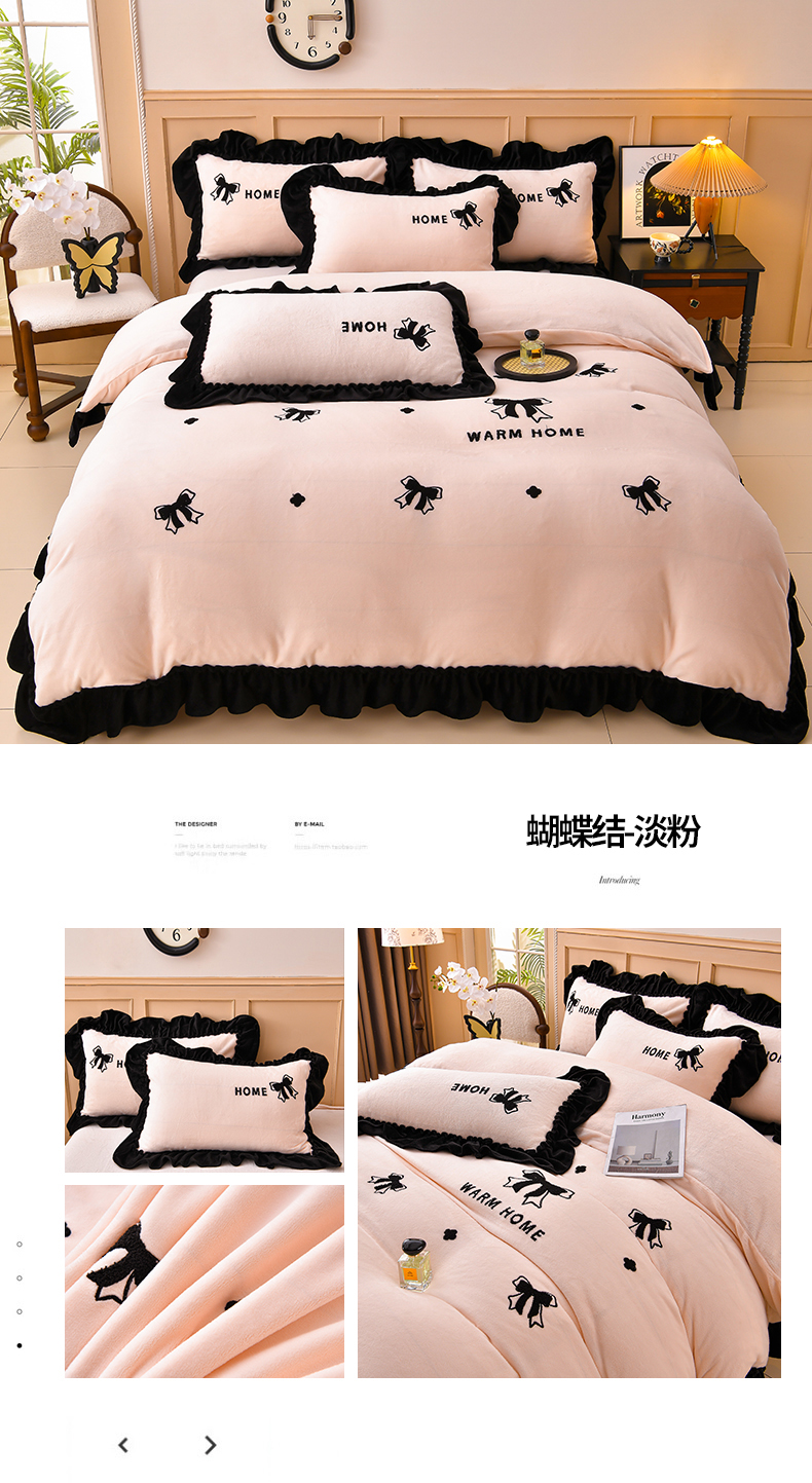 商品名称:梦之星 2025新款9斤毛巾绣韩式花边牛奶绒四件套 蝴蝶结-淡粉