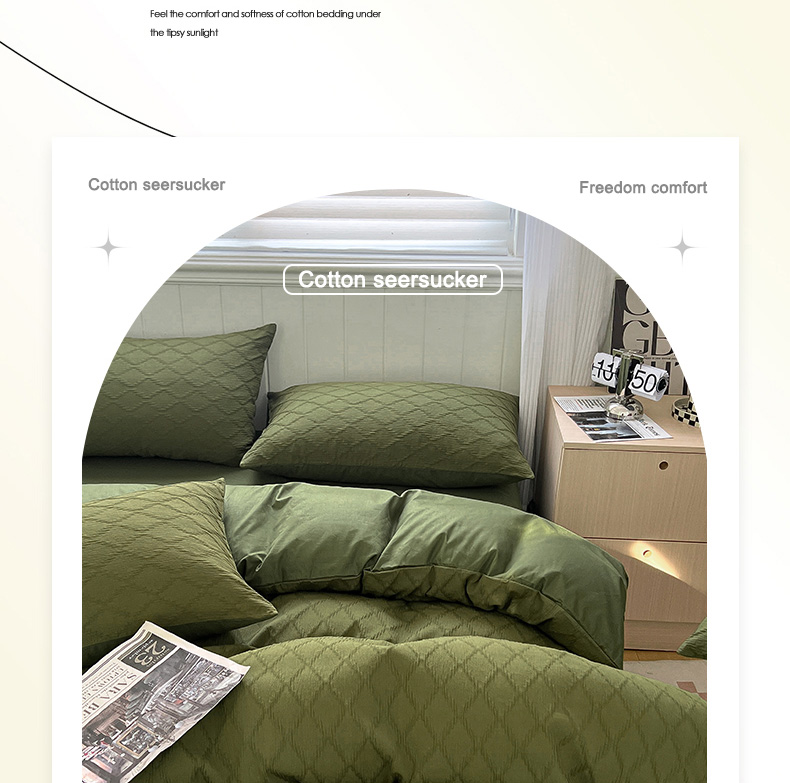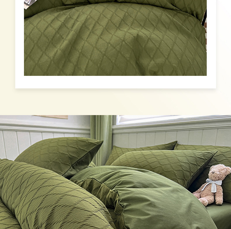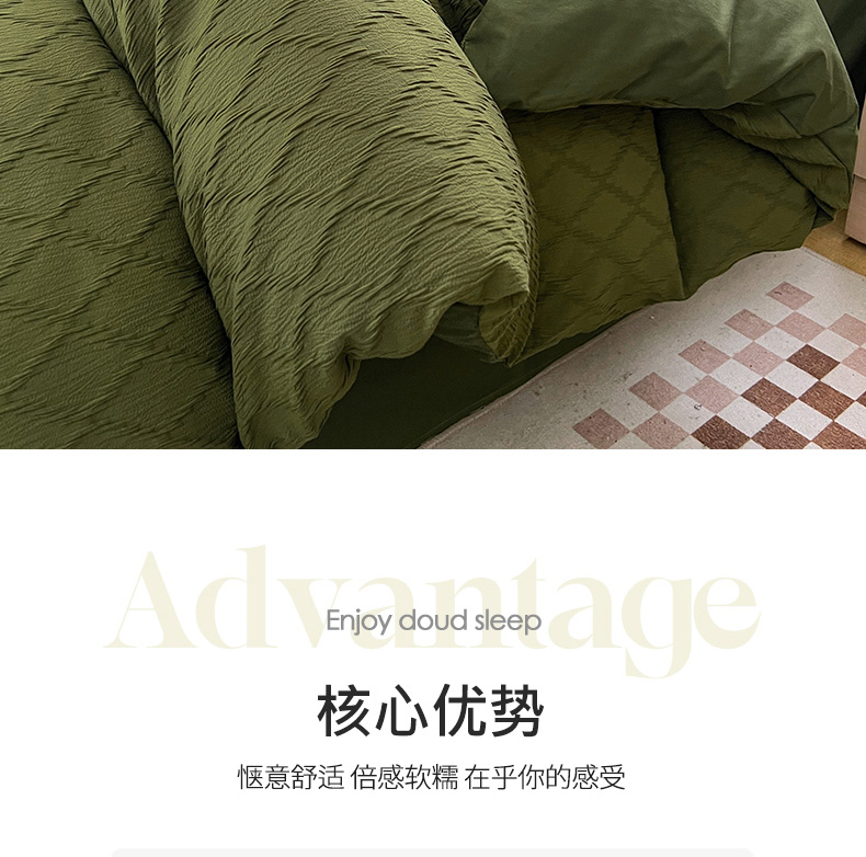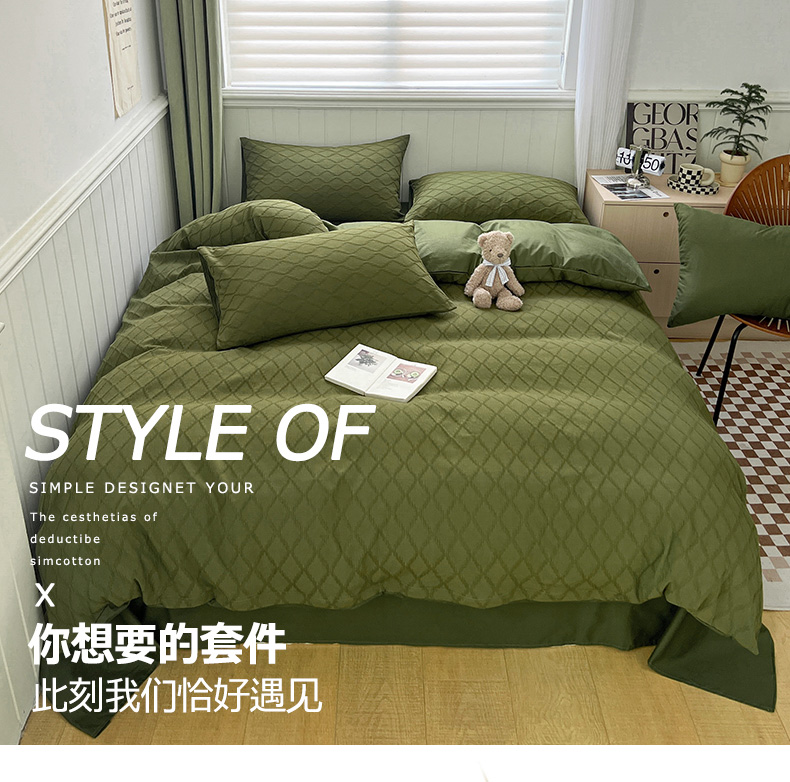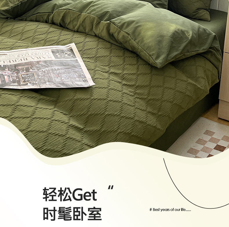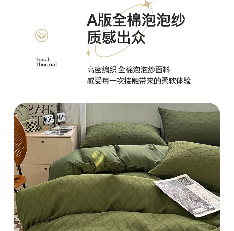 当前位置: 91家纺网 > 商品网购 > 床品套件 > 四件套 > 全棉普通四件套 > 琪格格纺织 2025新款纯棉华夫格极简宅寂风四件套 泡泡纱橄榄绿