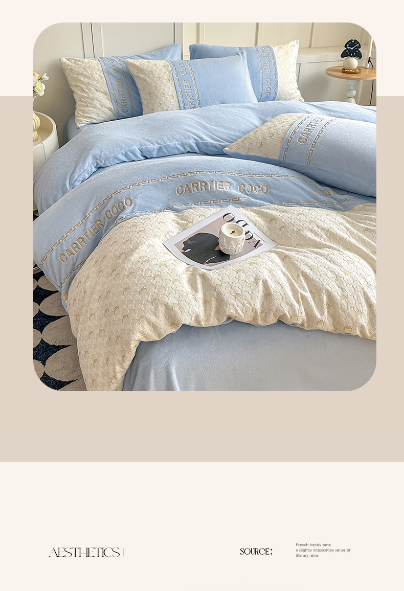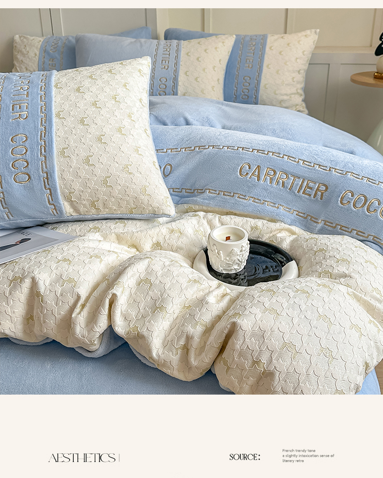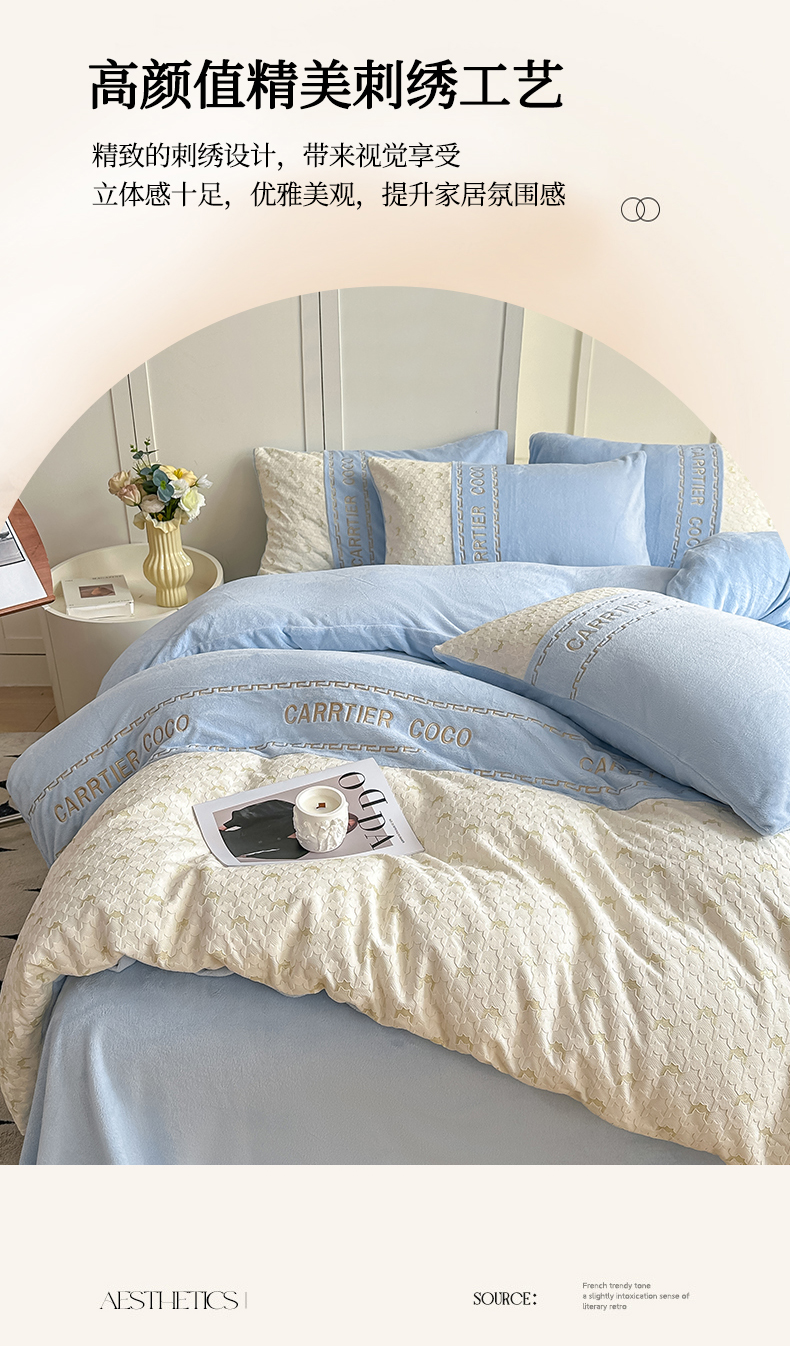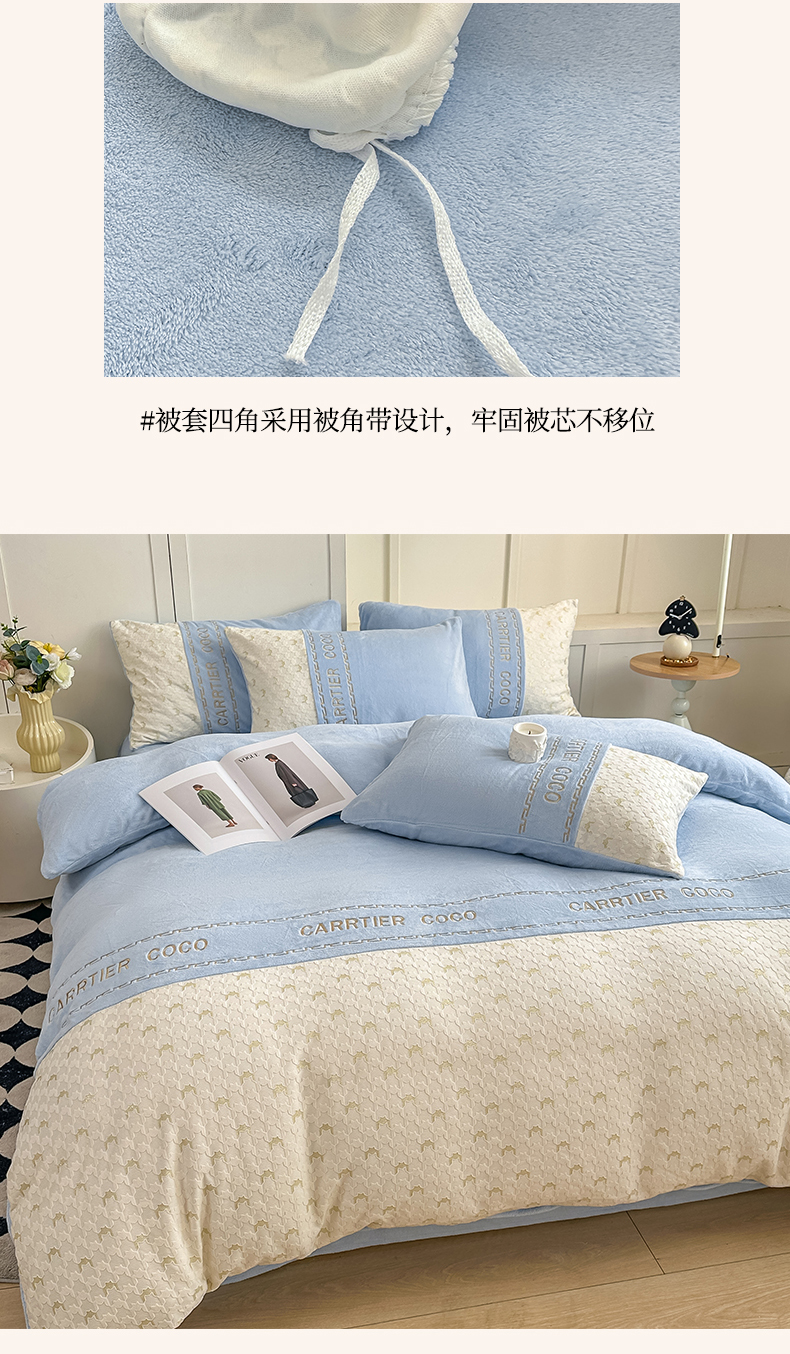 当前位置: 91家纺网 > 商品网购 > 床品套件 > 四件套 > 牛奶绒四件套 > 灰鲸 2025新款牛奶绒拼接刺绣雕花套件-贝娜 贝娜-繁星蓝